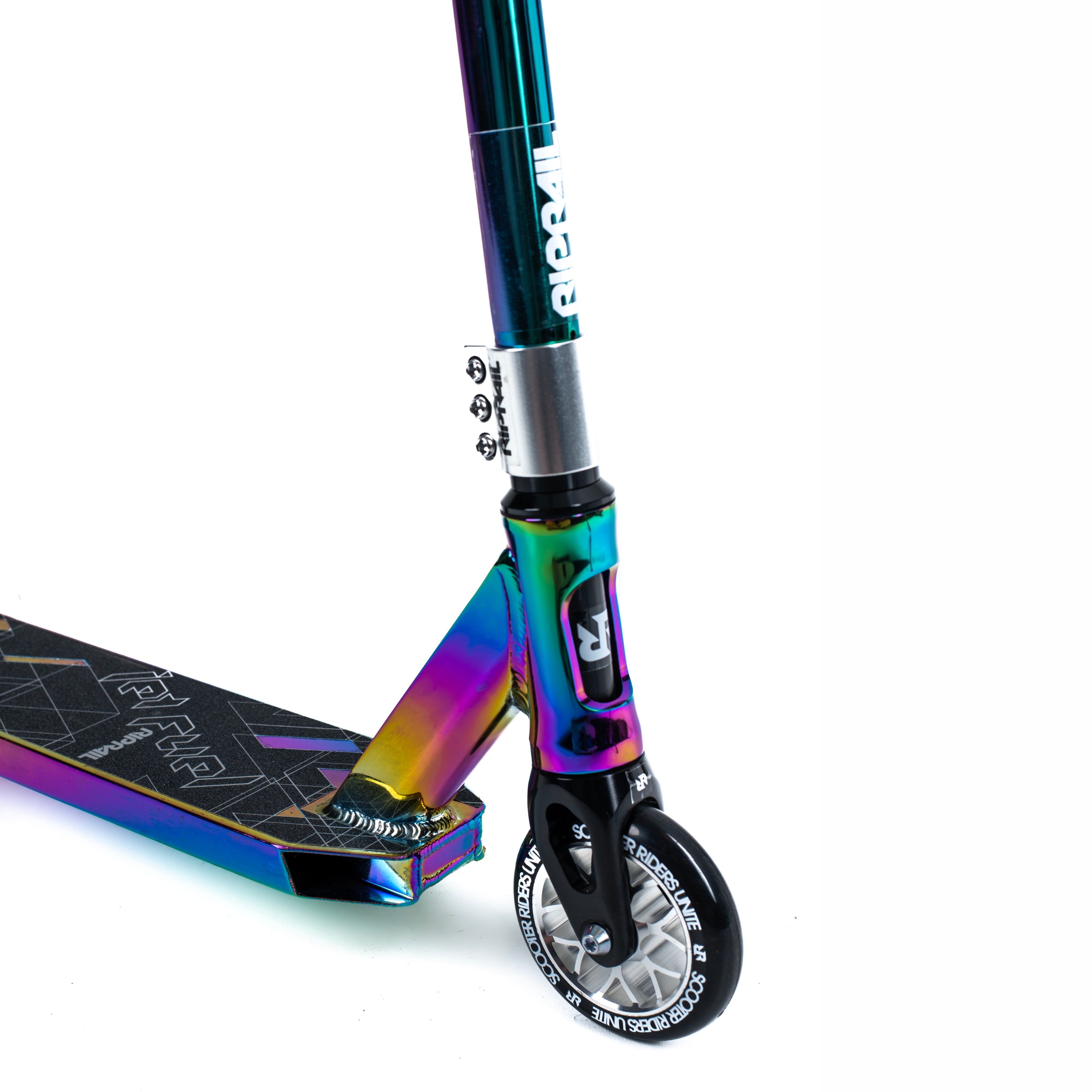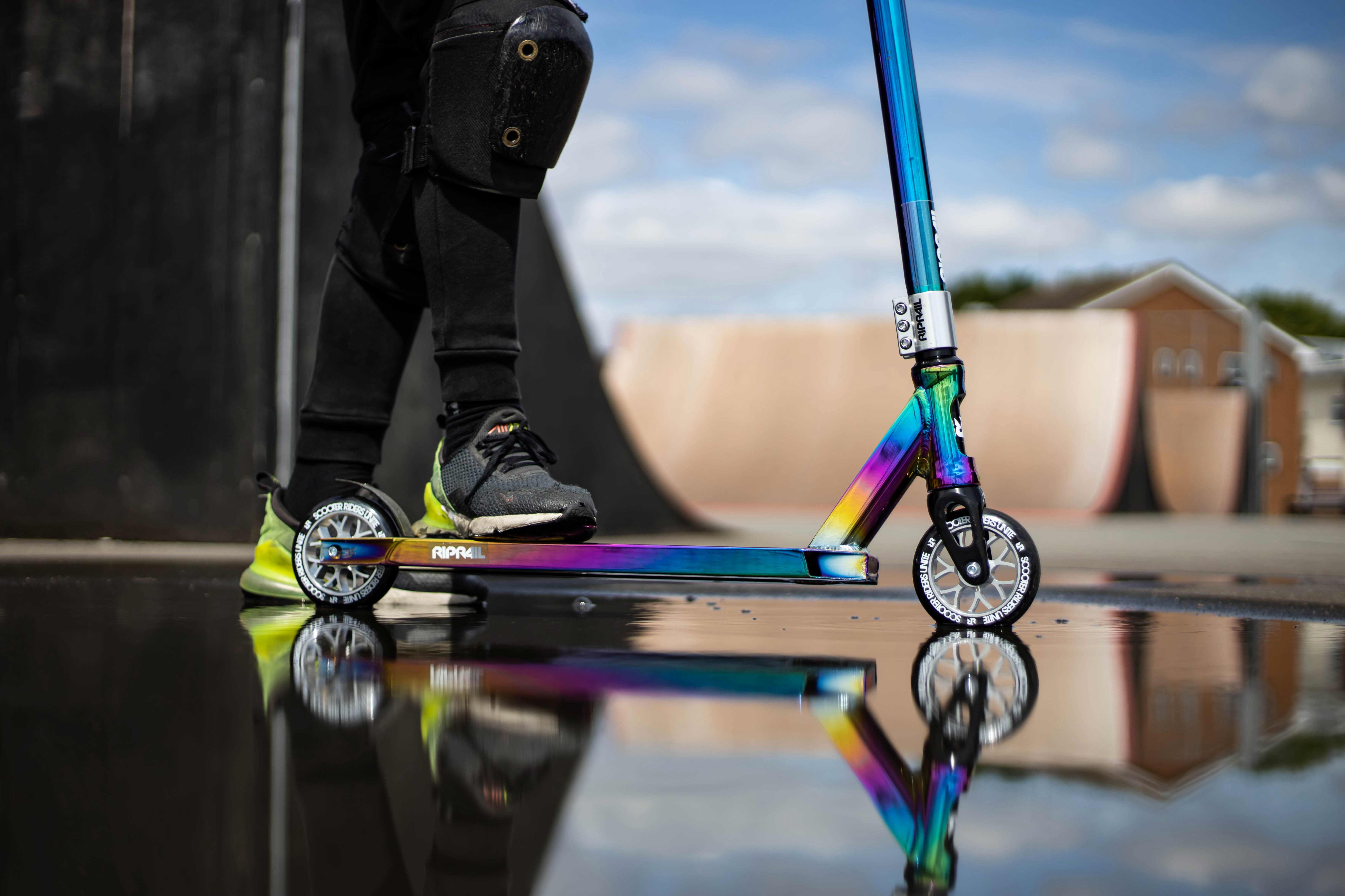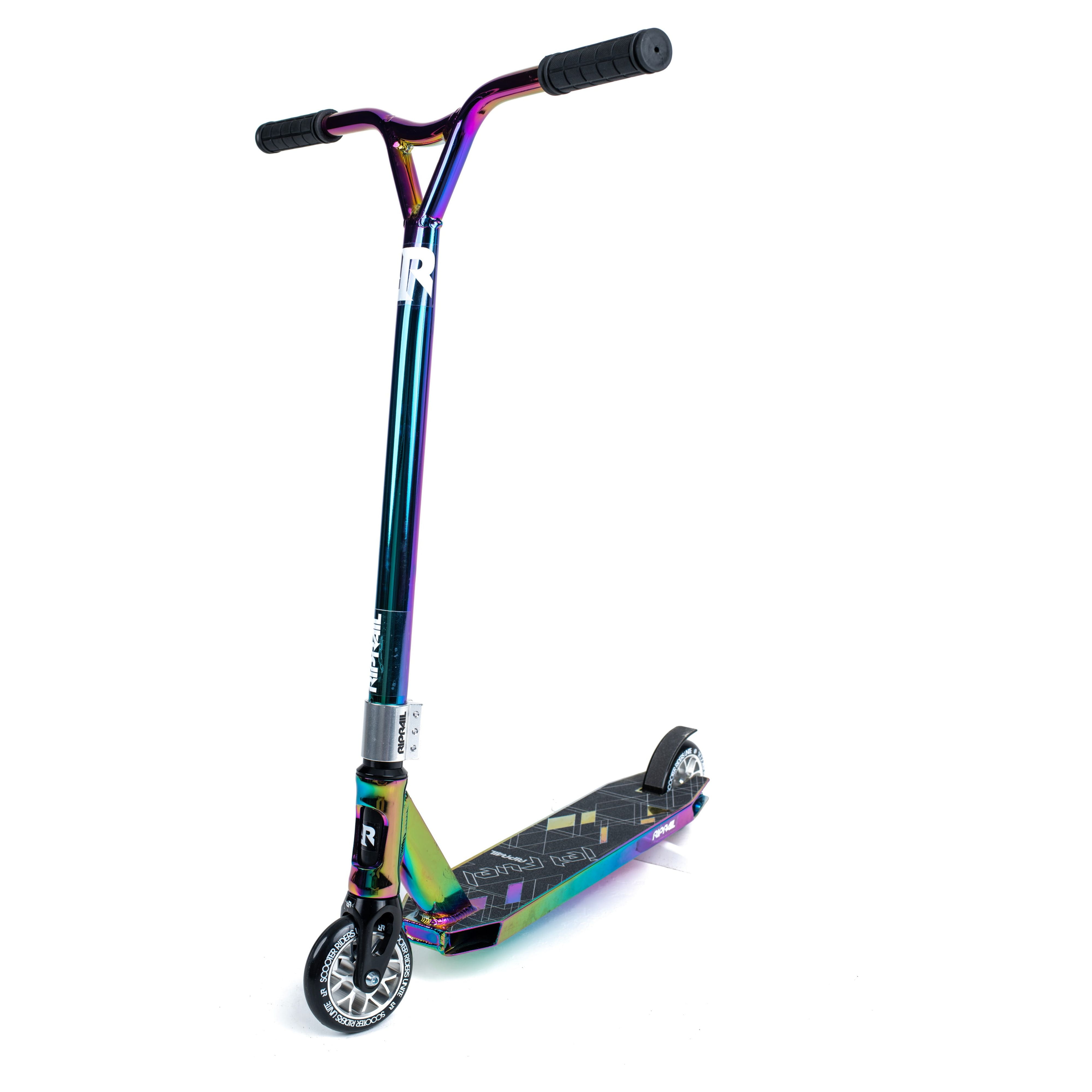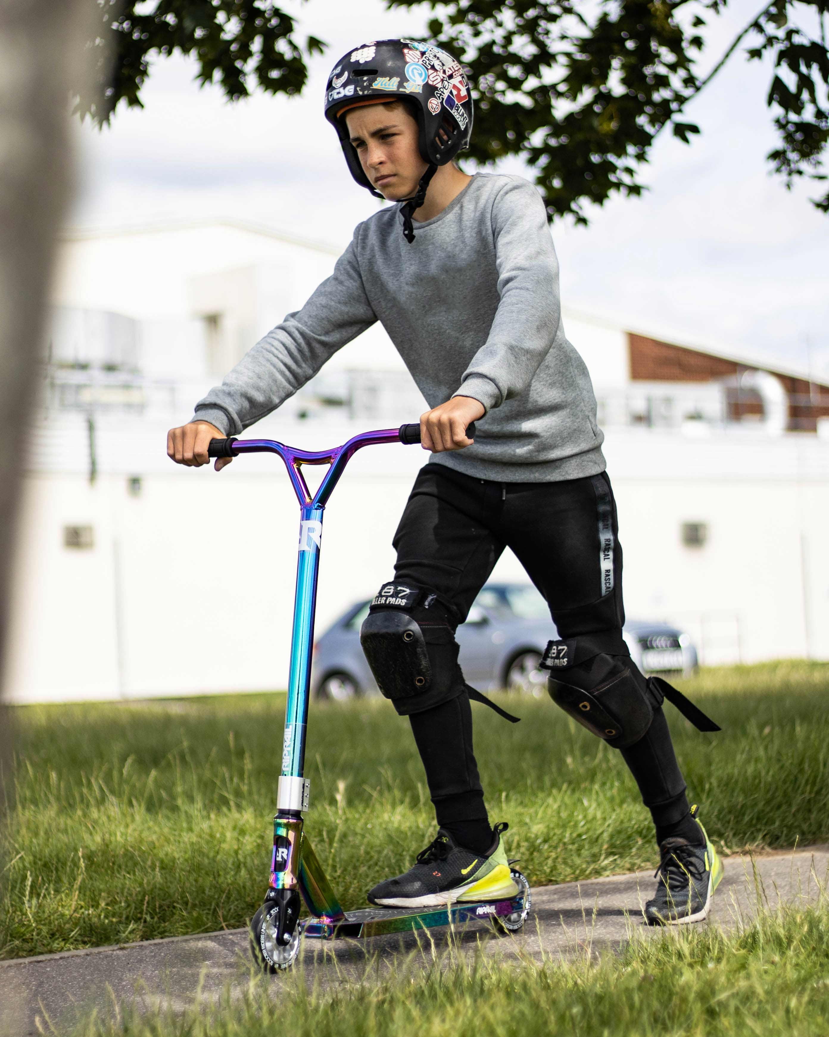 The Hyper Jet Fuel Unisex Stunt Scooter from Rip rail is built for skate park action. A unique multicolor Jet Fuel paint finish and sleek design make this one stylish scooter. Rip rail have designed the Jet Fuel Stunt Scooter to suit all skill levels. This scooter combines larger 110mm alloy core wheels with ABEC 9 bearings for a smooth, fast and quiet ride. The NECO thread less headset is built for smooth steering, with alloy gull wing bars for 360 spins. A Rip rail alloy triple clamp provides extra strength, while the die cut grip tape on the deck creates a firm foothold. Tear up the parks on Rip rail stunt scooters, created with premium components for strength and durability. Recommended age group 5 years old and up.