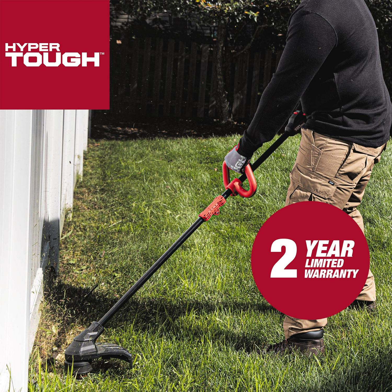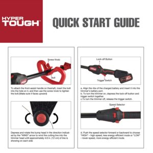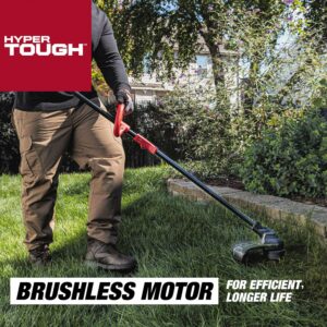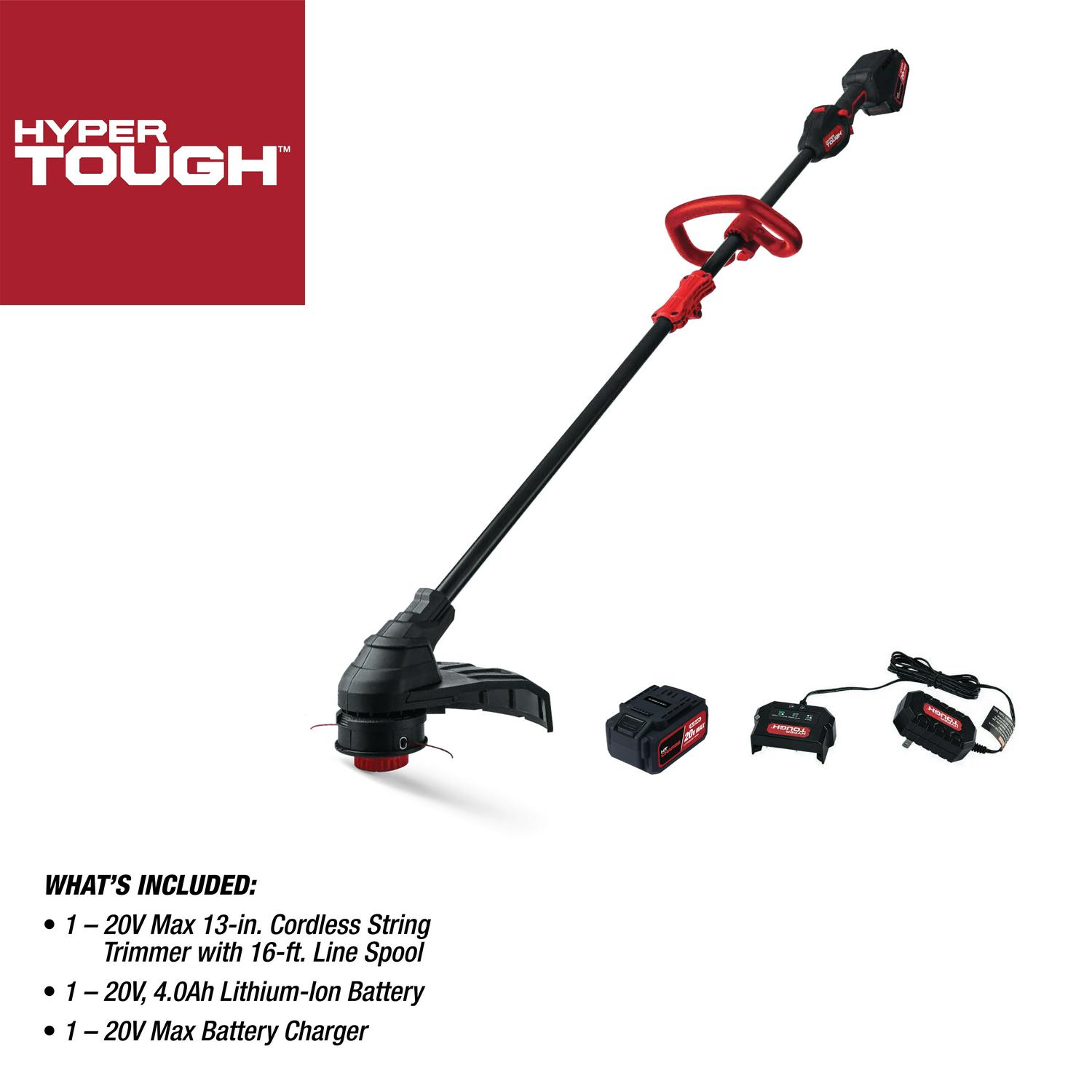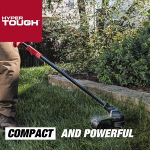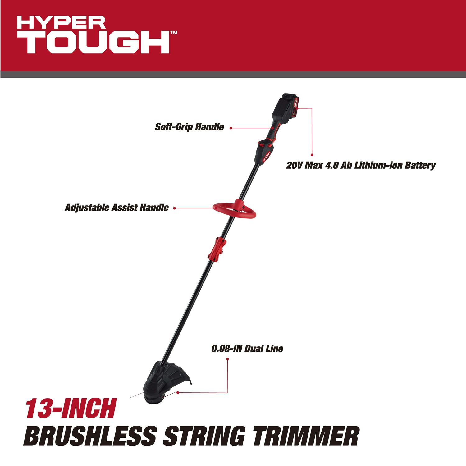 Tackle your yard trimming tasks with the Hyper Tough 20V Max 13″ 20V 4.0Ah Brushless String Trimmer. Featuring a 0.08-inch auto single-line feed cutting system to help keep your job going smooth. Designed for durability, this Hyper-Tough Brushless String Trimmer features a brushless motor that delivers more power and longer runtime. An overmold main handle and adjustable front handle are designed for comfort and confident handling. You’ll have ultimate control with the variable speed trigger and the easy loading bump feed head allows for easier trimmer line replacements. The Hyper-Tough 13″ Brushless String Trimmer includes a 20V Max 4.0 Ah lithium-ion battery and a 20V Max battery charger, providing you with the power to tget the job done. When you are ready to make repairs or tackle home-improvement projects, Hyper Tough is ready.
