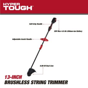 Hyper Tough 20V 13 4.0Ah Brushless Battery Powered String Trimmer with Rapid Reload Trimmer Head, HT22-401-03-02