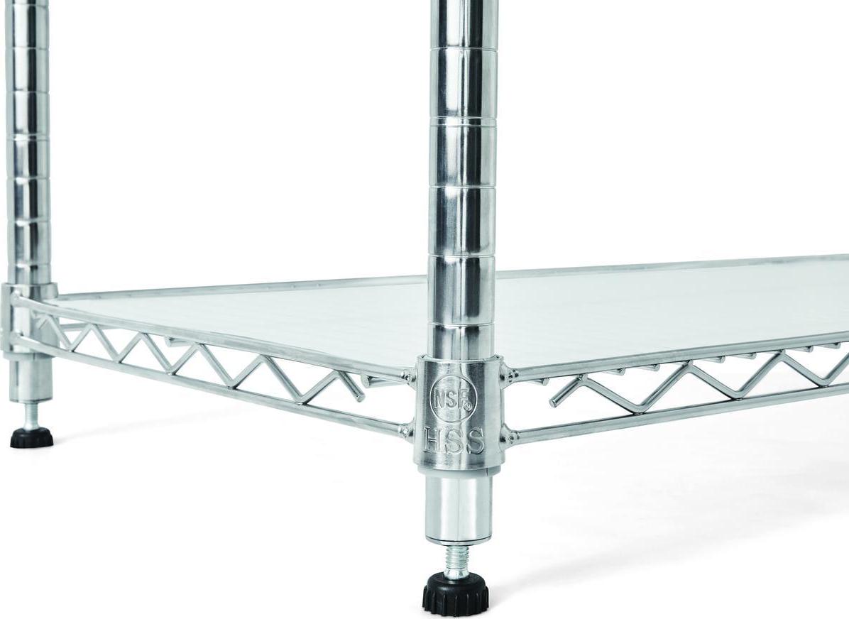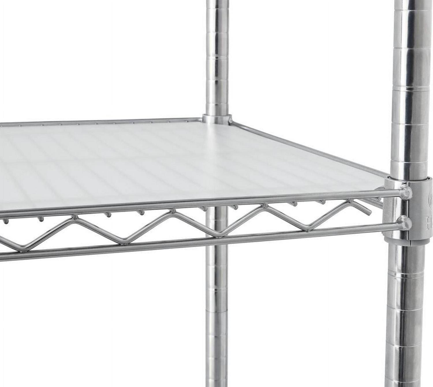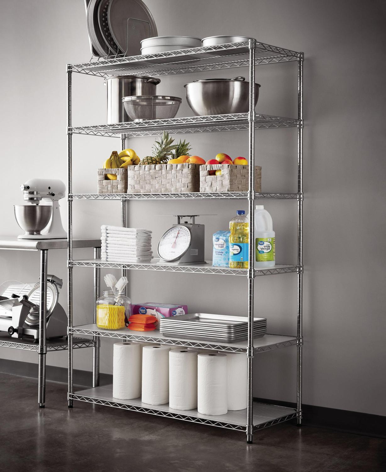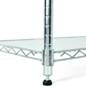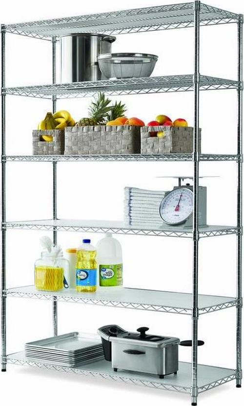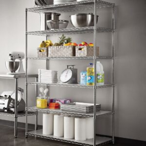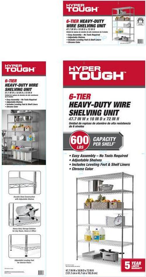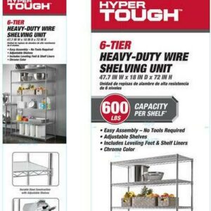 The Hyper Tough Steel 6-Tier Storage Shelf Unit with Liners is ideal for home and commercial use. It has strong and durable welded wire construction in chrome color. Open wire design allows air circulation and reduces dust build-up. It is NSF certified for dry environment storage. Shelves can be adjusted in one inch increments. Each shelf can hold up to 600 lbs evenly distributed when assembled with feet levelers. Includes adjustable feet levelers for uneven floors. It also includes 6 plastic shelf liners to prevent smaller items from falling through. It is designed for adult use. This wire shelving system is perfect for homes, offices, restaurants and any other places you need to organize.