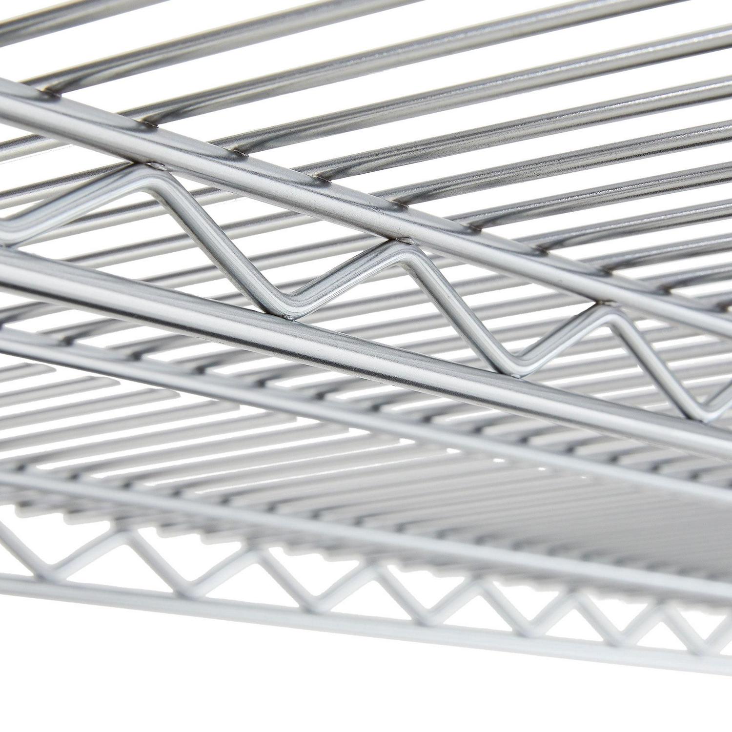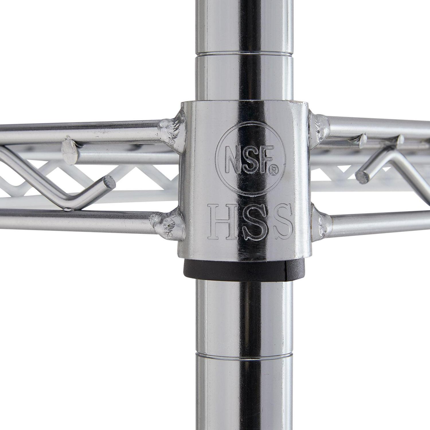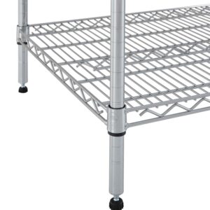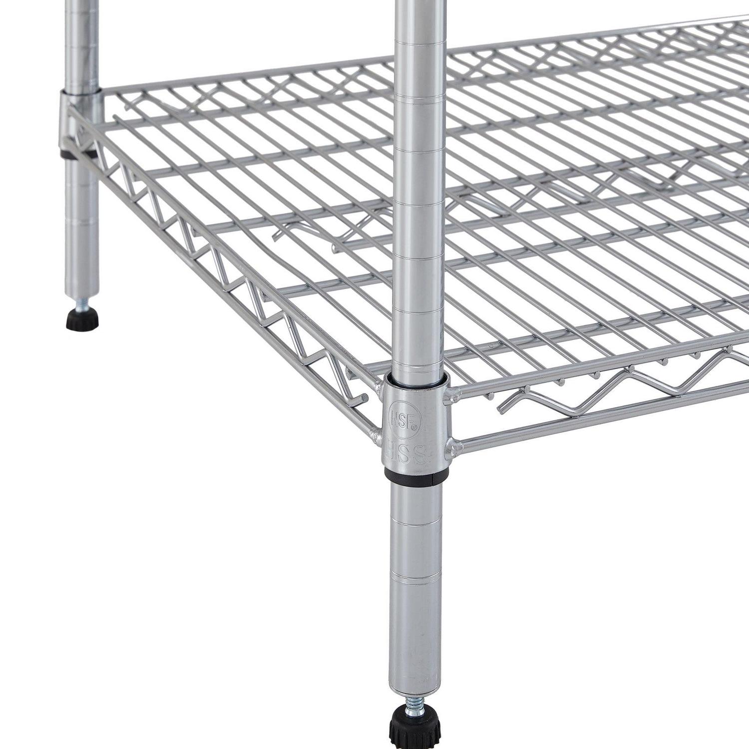 Hyper Tough Steel 4-Tier Heavy Duty Storage Shelf Unit is ideal for home and commercial use. It has strong and durable welded wire construction in chrome color. Open wire design allows air circulation and reduces dust build-up. It is NSF certified for dry environment storage. Easy assembly with no tools required. The shelf size is 60″ width with 24″ Depth. Shelves can be adjusted in one-inch increments. Each shelf can hold up to 1000 lbs. evenly distributed when assembled with foot levelers. Includes adjustable foot leveler help ensure stability on uneven surfaces. It is designed to be used by adult. This wire shelving system is perfect for homes, offices and any other places you need to organize. It has highest quality and significant weight capacity of 4000lbs evenly distributed.