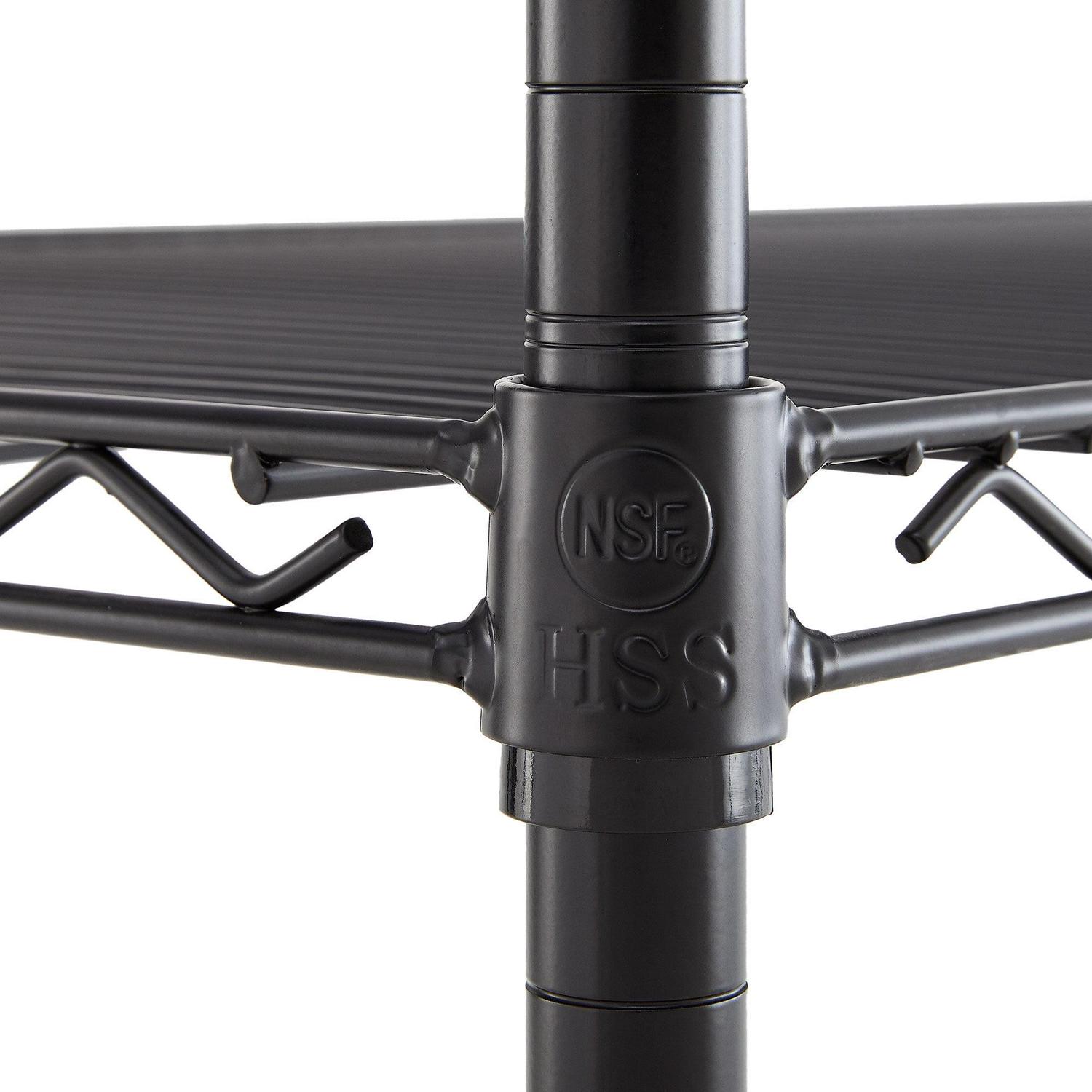 Hyper Tough Steel 5-Tier Heavy Duty metal storage shelf unit is ideal for home and commercial use. It has strong and durable welded wire construction. Epoxy powder coating finish in black color. It has open wire design allows air circulation and reduces dust build-up. NSF certified for dry environment and comes with a 5-year limited warranty. Shelves can be adjusted in one-inch increments. Each shelf can hold up to 800 lbs evenly distributed when assembled with feet levelers. Total unit capacity is 4000 lbs. It is designed for adult suse. This wire shelving system is perfect for homes, offices, warehouses, restaurants and any other places you need to organize.