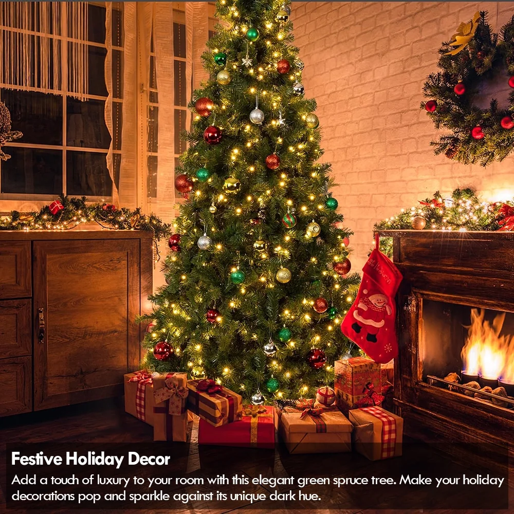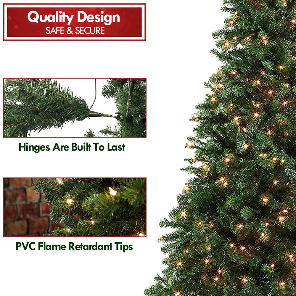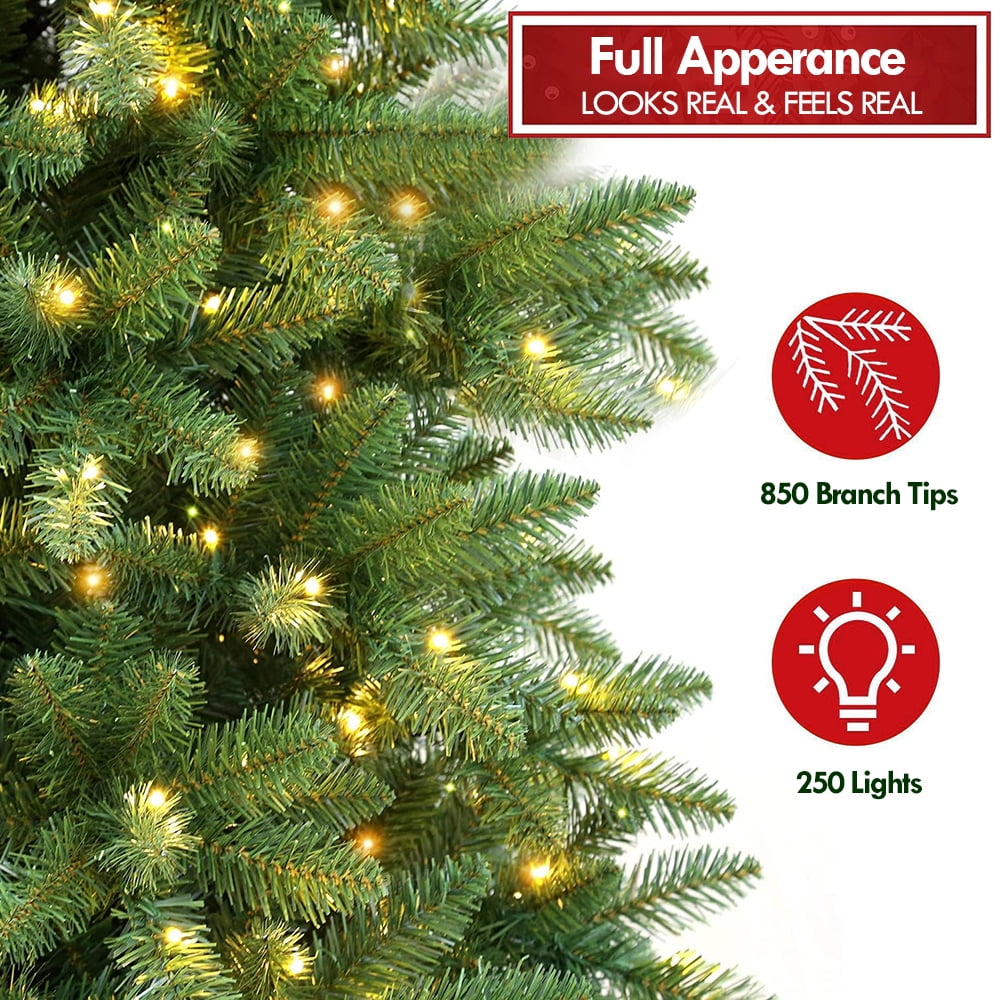 Environmental-friendly PVC material, crush resistant and durable 750 branch tips with green color for leafy and realistic appearance 250 LED lights to create warm festival atmosphere Sturdy metal stand with antiskid foot caps to ensure stability and balance Eye-catching addition for home, office, shops and other places UL certified plug ensures use safety East to assemble with hinged branches Package Included: 1 x Pre-lit Christmas Tree; 1 x Metal Stand; 1 x Storage Bag
