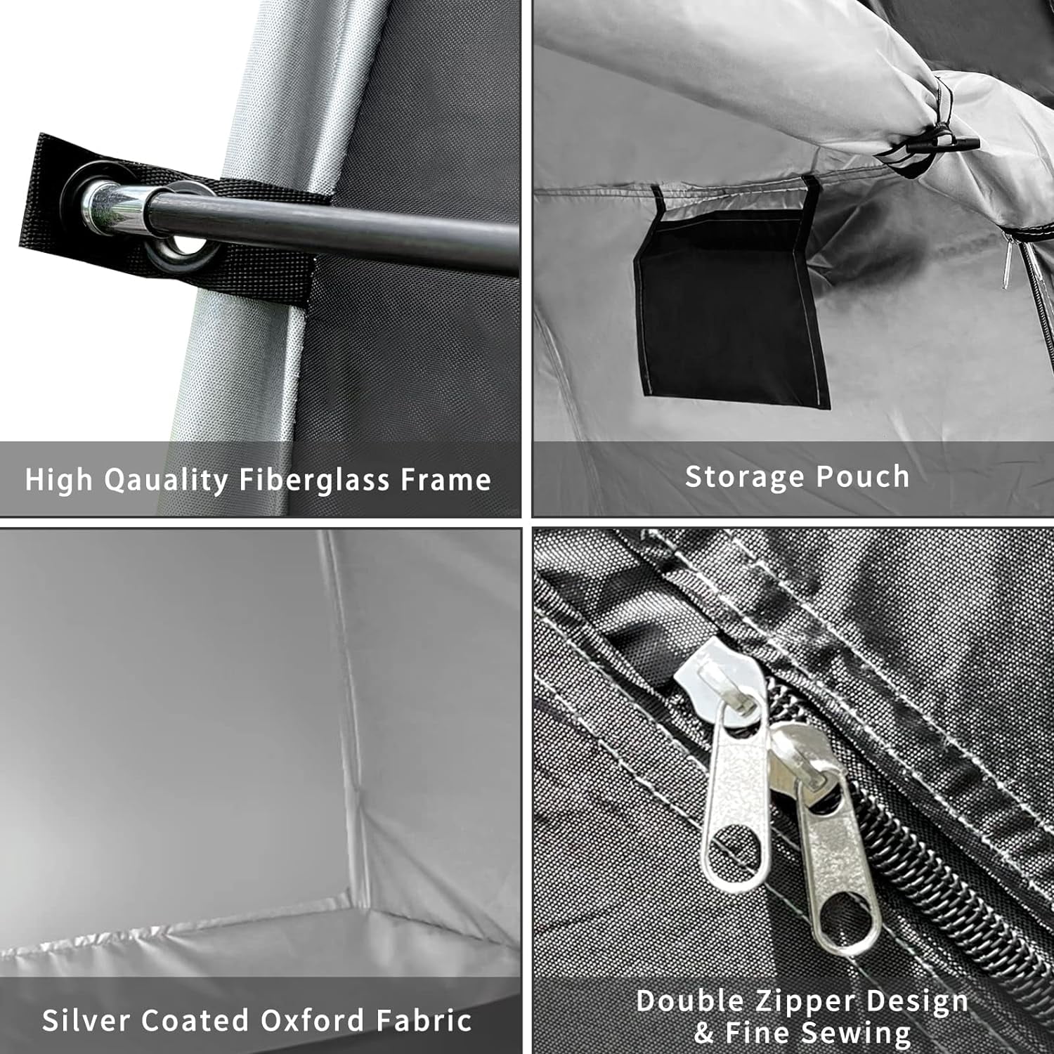 【Sturdy material】The iCool bicycle shed is made of high-quality 210D silver-plated Oxford cloth, three layers of anti-tear material, waterproof and anti-ultraviolet treatment(PU4000), no need to worry about fading. All seams are rolled and double stitched with durable thread, which can be firmly supported in any bad weather. 【Larger Storage Space】78 x 65 x 32 inches, can accommodate two adult bicycles, As an outdoor storage tent, it can store long-handled garden tools, furniture mats, bicycles, motorcycles, lawn mowers, coolers, swimming pool toys and other items. You can also use it as a campsite or any other purpose you want. 【Upgrade Design】 Double opening design, the full zipper can be completely sealed and provided with comprehensive protection. All the zipper peripherals increase the waterproof bar, which can better improve waterproofing. The silver -plated fabric can avoid ultraviolet rays in all directions and prevent equipment from equipment. Aging, small window design is convenient for ventilation. 【Quick setup and disassembly】 It only takes 10 minutes to assemble the tent, without any tools (if you need any help, please contact us)! Just like a regular tent, installation is quick and easy. just straighten the frame and insert it into the gap reserved in the tent, bend the frame into an arch with a little force and use a shorter frame to open the width to use.More economical, versatile and portable than similar sized plastic, wood and metal sheds. 【Easy to carry】 A bag with a handle is attached, which is easy to transport and store when not in use. The unit components are foldable and they all fit in the accompanying suitcase.