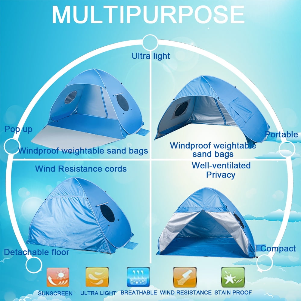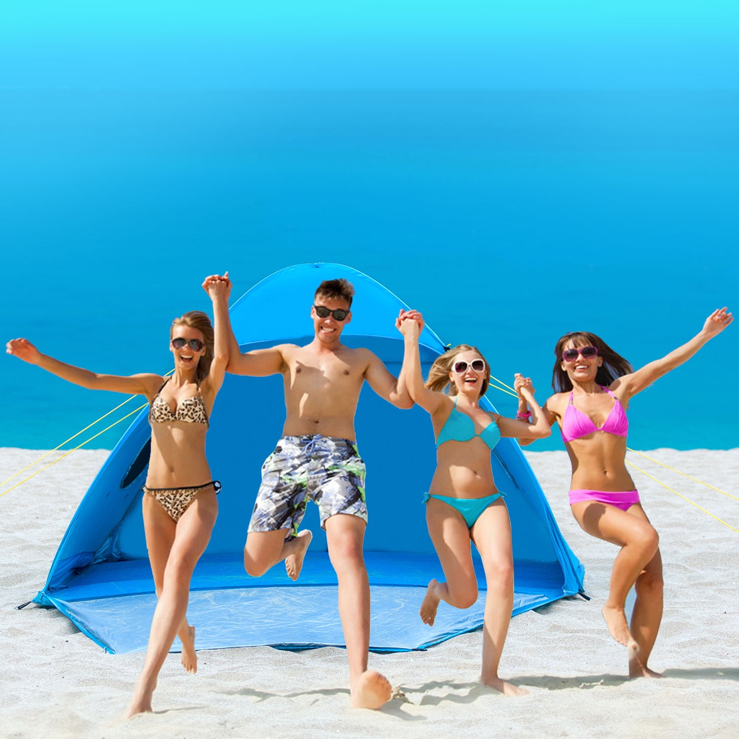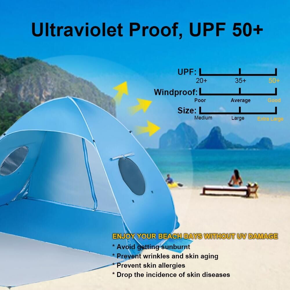iCorer 79″ x 47″ Beach Tent: Extra Large Size: 20% bigger than similar products. Spacious for a family of 3 to 4. Innovative Design: No assembly required. Patented structure Convenient Features: Zippered doors for privacy & use it as a changing room. Detachable floor. 50+ UV Gaud Protection