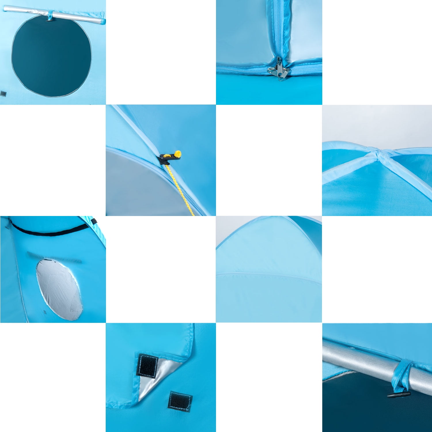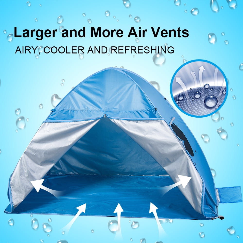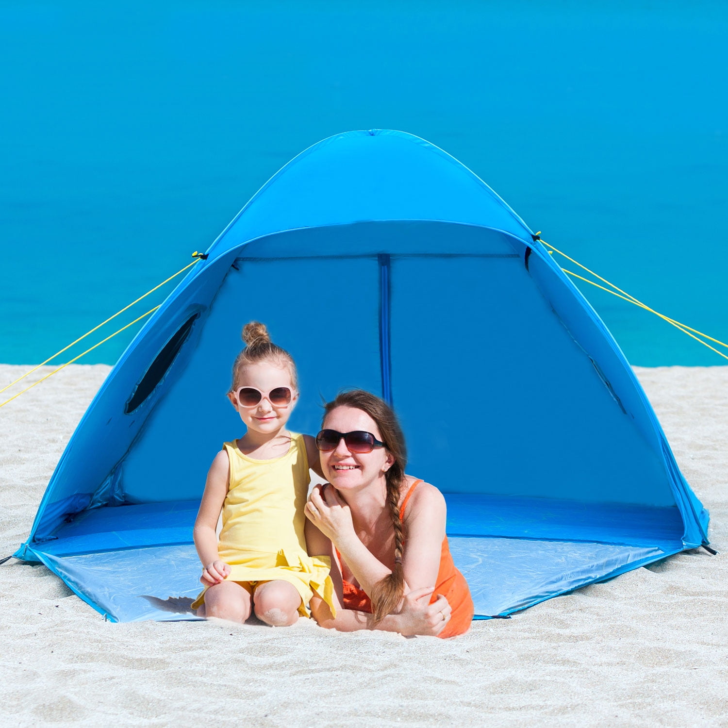 iCorer 79″ x 47″ Beach Tent: Extra Large Size: 20% bigger than similar products. Spacious for a family of 3 to 4. Innovative Design: No assembly required. Patented structure Convenient Features: Zippered doors for privacy & use it as a changing room. Detachable floor. 50+ UV Gaud Protection