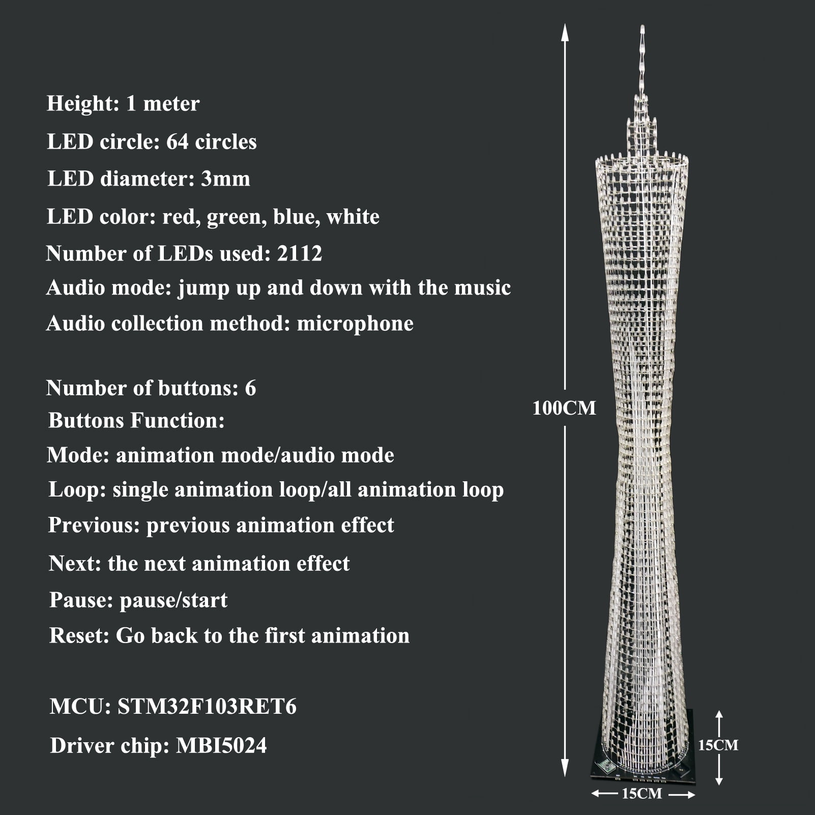 There are 6 buttons to switch animation modes. The Button Functions: K1: Reset, go back to the first flash K2: Switch Flash effect / Audio effect K3: Current flash cycle / All flash cycle K4: Next Flash effect K5: Previous Flash effect K6: Pause / Run Package Include: Soldered and tested mainboard x1 Copper posts and screws x4 USB cable x1 White electronic line x 1 Plastic mold for auxiliary welding x1 3mm Red LED x600(used 512) 3mm Green LED x600(used 512) 3mm Blue LED x600(used 512) 3mm White LED x600(used 512) 3mm Blue long LED x50(used 24)