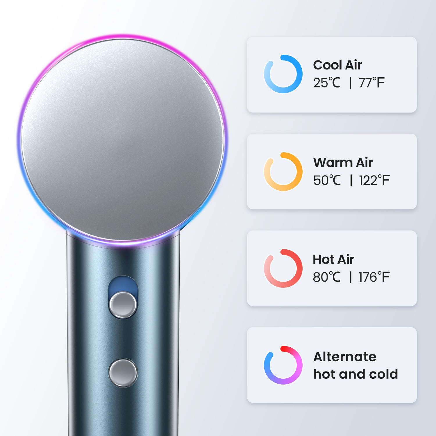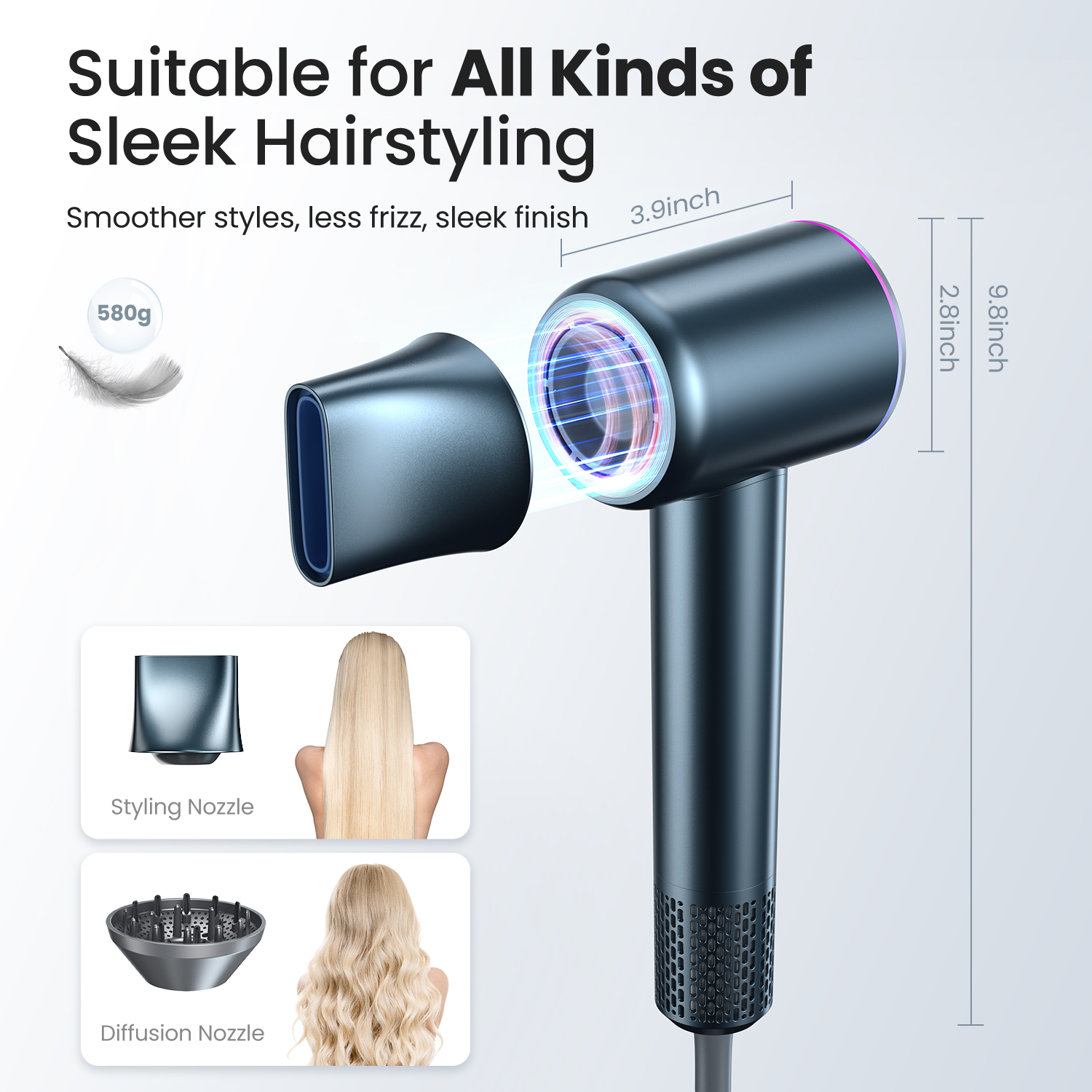The iDOO High-Speed Blow Dryer uses a 110,000 RPM motor for fast hair drying in 2-7 minutes, making the high-speed blow dryer efficient for all hair types with an included diffuser and smooth nozzles. The portable hair dryer has a smart temperature control sensor and releases negative ions to reduce heat damage and frizz, enhancing hair shine. With 4 temperature and 2-speed settings, along with 3 color LED rings, it offers a customizable experience. Notably, the hair dryer with diffuser includes a summer-long hair mode for comfortable usage. At only 1.28 lb and 59dB, the blow dryer is lightweight, portable, and safe with flame-retardant materials, overheating protection, and a US ALCI plug. No matter who you are, no matter where you are, you can have your favorite hairstyle anytime, anywhere.