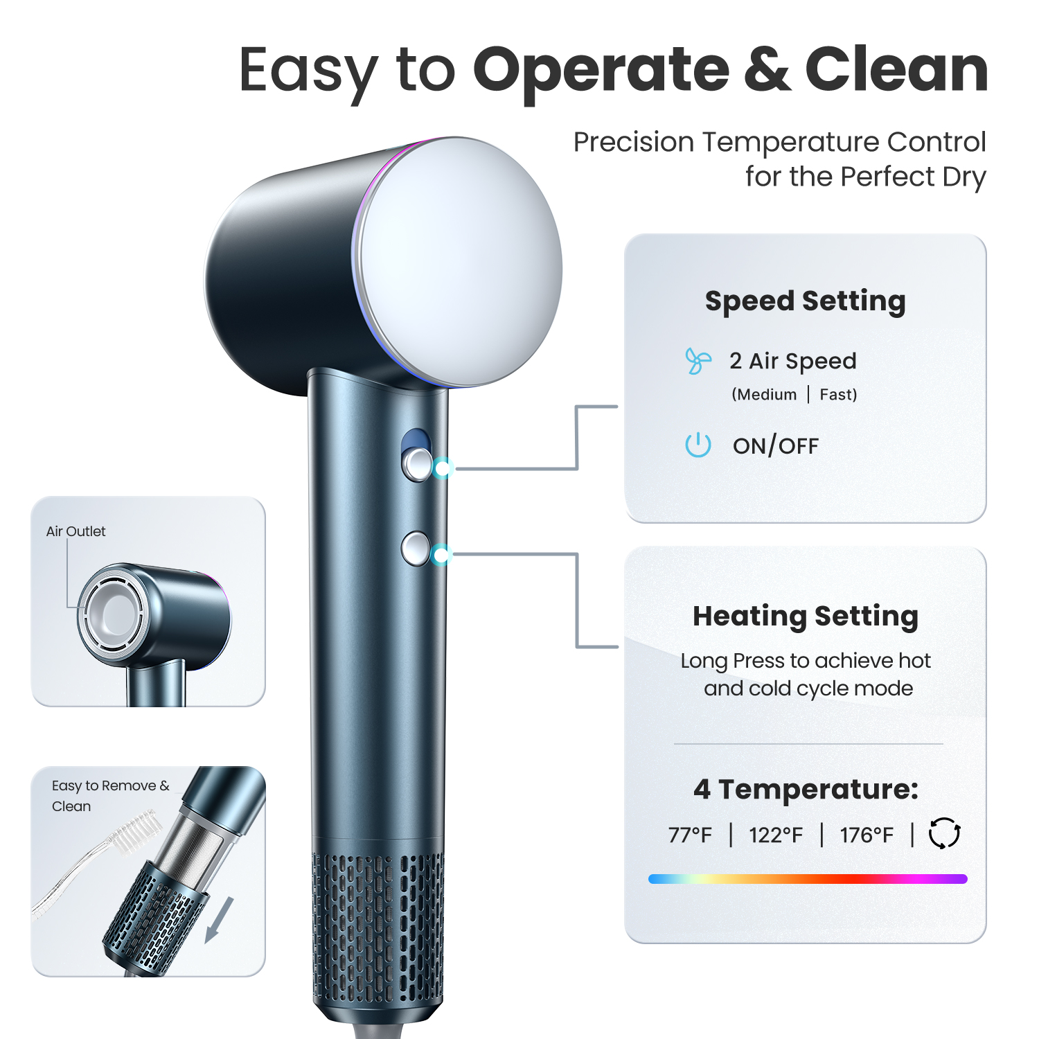 Quick Drying & Time-Saving – Hair Dryer Powerful 110000rpm Motor Improve Hair Drying Efficiency – High-Speed Blow Dryer Ultra-Fast 21m/S Airflow Prevents Overheating – Portable Hair Dryer Intelligent Temperature Control Optimal Blow Drying Configuration – Diffuser Hair 2 Speeds & 4 Heat Minifies Frizz & Boosts Shine – Curly Hair Dryer 200 Million Ions Versatile Styling – Hair Dryer with Two Hair Dryer Diffusers Quieter Operation & Less Noise – iDOO High-Speed Hair Dryer Noise Only 60db Easy to Hold – Blow Dryer Only 580g in Weight Assured Safety – Travel Hair Dryer Alci Safety Plugs Stylish Design – Hair Dryer Gift Choice for Women Man Specification: Product Name: High-Speed Hair Dryer Rated input power: 1600W Rated voltage: 110V / 60Hz Product net weight: 1.28 lb/580g Motor: 110,000 RPM high-speed brushless motor Wind Speed: 21M/S Negative ions: 200 million negative ions Temperature Mode: 3 Modes (Cold/Warm/Hot) Cold air 77℉/Warm air 122℉/Hot Air176℉/Circulating hot & cold Wind Speed Mode: 2 Speeds(Low/High) Low Noise: Lower 59 dB Cord Length 1.8 m/5.9 ft Package Contents: 1 x High Speed Hair Dryer 1 x Magnetic Nozzle 1 x Magnetic Diffuser 1 x Manual