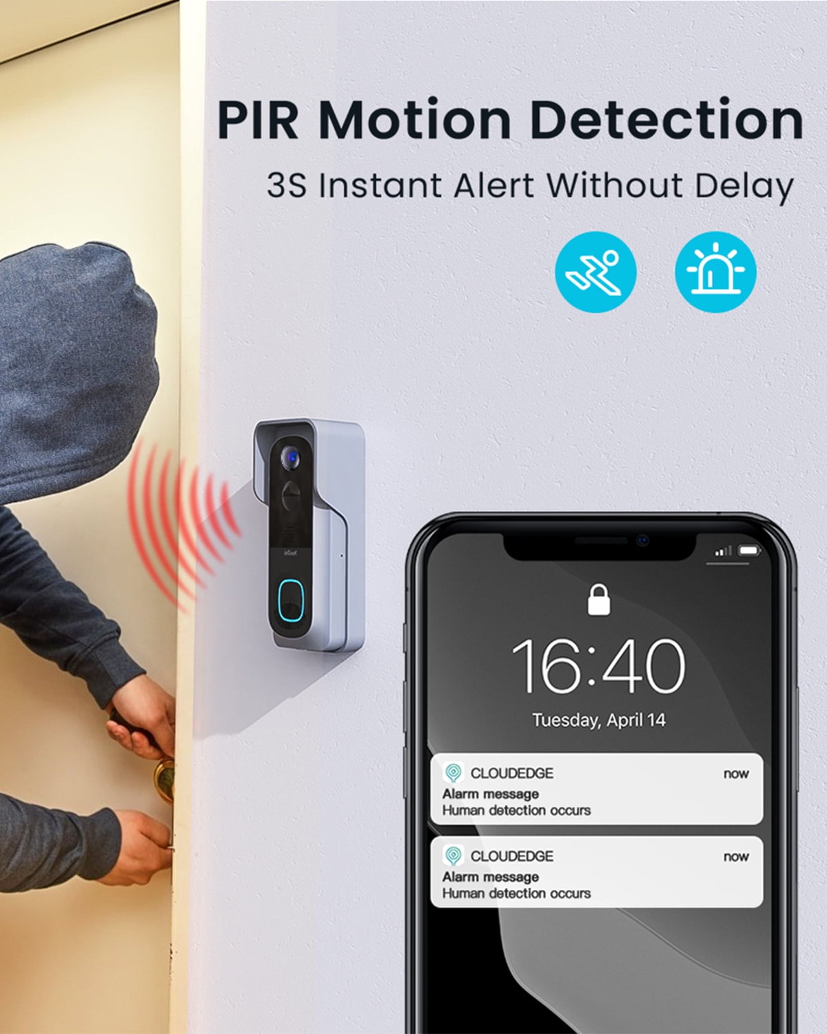 ✔️【2-second real-time alert & 20-foot PIR motion detection】 ieGeek smart wireless doorbell camera features a patented motion detector with a monitoring range of up to 20 feet. When it detects human motion, it will begin recording video and send a notification to your phone. Video doorbells are capable of making intelligent distinctions between people and objects. 5 monitoring areas and 10-level sensitivity adjustment help cut down on unneeded distractions and focus on important matters. ✔️【Voice Changer & Pre-Recorded Voice Messages】 With 2-way audio video doorbell, you can talk to guests at the door from anywhere in the world. You can utilize voice change to hide your age and gender behind wireless doorbell camera when someone is at the door, or choose pre-recorded voice messages(up to 3) to reply swiftly and more privately. Perfect present and protection for elderly people, kids, and single ladies. ✔️【2K HD Image Quality & 166° Wide Angle】 ieGeek Wireless doorbells for home have been upgraded to a 166° monitoring angle and 2K HD picture quality. You can plainly see the visitor’s face and packages on the video, which reduces the possibility of package loss at the front door. Infrared night vision mode of doorbell camera captures clear detailed video outside the door, giving you peace of mind for home security. ✔️【100% Wireless & Quick Installation】 Smart door camera is powered by a large-capacity battery and connects to wireless network via 2.4Ghz WiFi. No need to deal with any sockets or messy wires. 3 Minutes to complete the connection and installation wherever you need it! ✔️【SD Card/Cloud Storage & Anti-Theft Lock】 ieGeek wireless doorbell camera supports cloud storage (7-day free loop) and SD card storage (Max 128GB, no subscription required). The anti-theft latch on the doorbell bracket prevents SD cards from being removed easily. Advanced encryption technology protects your privacy.
