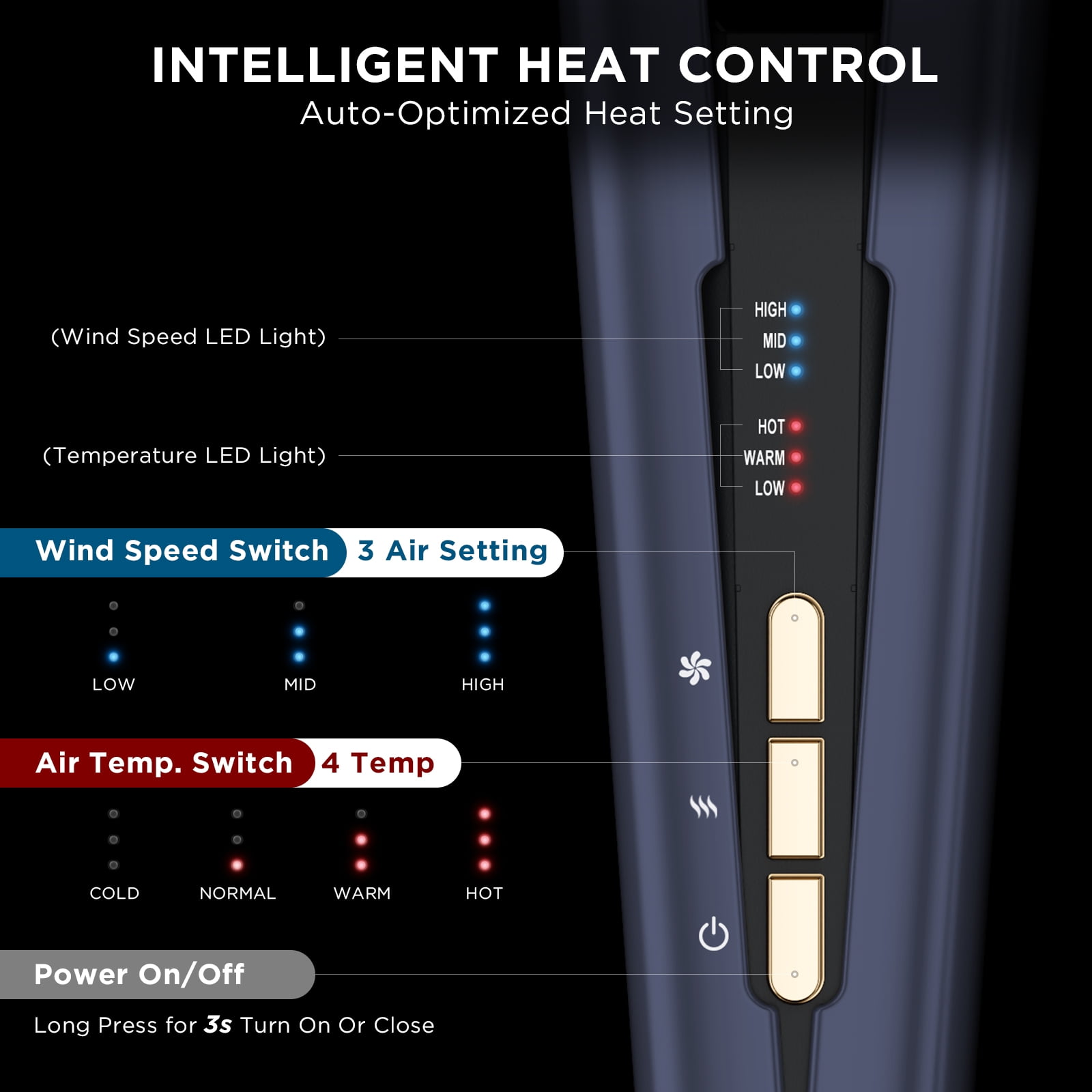 Revolutionary Hot Plate-Free Design: Many traditional hair straighteners on the market have problems such as high-temperature damage to hair and hand burns. Now, The IG INGLAM Air Straightener features a cutting-edge hot plate-free design, using powerful airflow to straighten hair without heat damage. Perfect for safe and gentle styling, it?s an ideal choice for those looking to avoid hair damage while achieving sleek, straight hair. One-Step Styling & Drying Dual Functionality: This innovative hair tool combines hair drying and straightening functions, saving you time and effort. It?s perfect for busy mornings or quick touch-ups, ensuring you always look your best with minimal effort. The dual functionality makes it a must-have for anyone looking for a versatile hair straightener and dryer combo. Continuous Negative Ion Care: Emitting 200 million negative ions during use, the IG INGLAM Air Straightener reduces frizz and static, keeping your hair smooth and manageable. The advanced ionic technology ensures a professional finish every time, making it an excellent choice for those seeking to reduce frizz and achieve healthy, shiny hair. Multiple Gear settings & Strong Function: The IG INGLAM Hair Straightener has three wind speed modes, including “LOW” “MEDIUM” and “HIGH” modes and 4 temperature modes include “Normal” ,”Cool” ,”Warm” ,”Hot” modes. In terms of performance, this hair straightener is equipped with a 110,000 RPM brushless motor that provides strong and stable airflow., making it ideal for fast and efficient hair drying and straightening. In comparison to hot plate straighteners that rely on extreme heat, ??wet to dry?? hair straighteners function by working with ultra-high-speed & low-temperature airflow. “Harmonica” gift design: We got inspiration from the shape of the harmonica and integrated it into the streamlined appearance of the new hair straightener, making it more beautiful and elegant overall. The exquisite gift box design is the best gift choice for your girlfriend, wife, daughter, mother, family, and friends. If you need help, please feel free to contact us, you can use it with confidence!