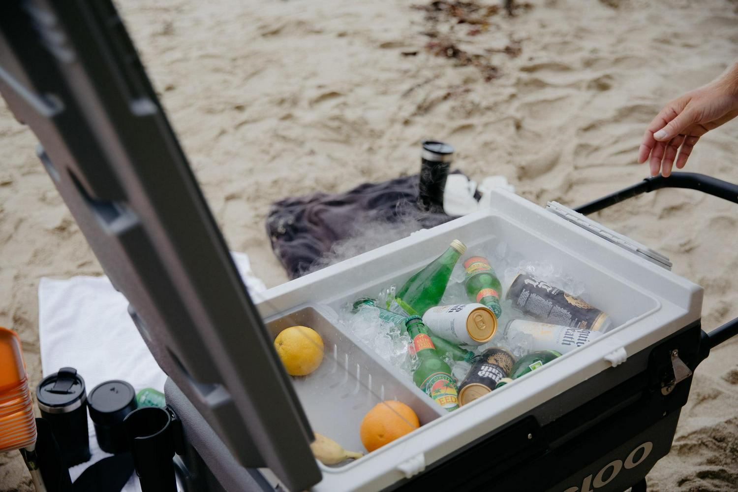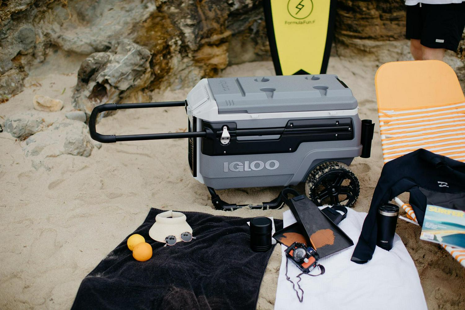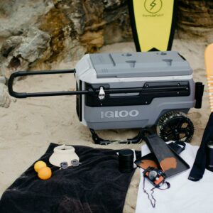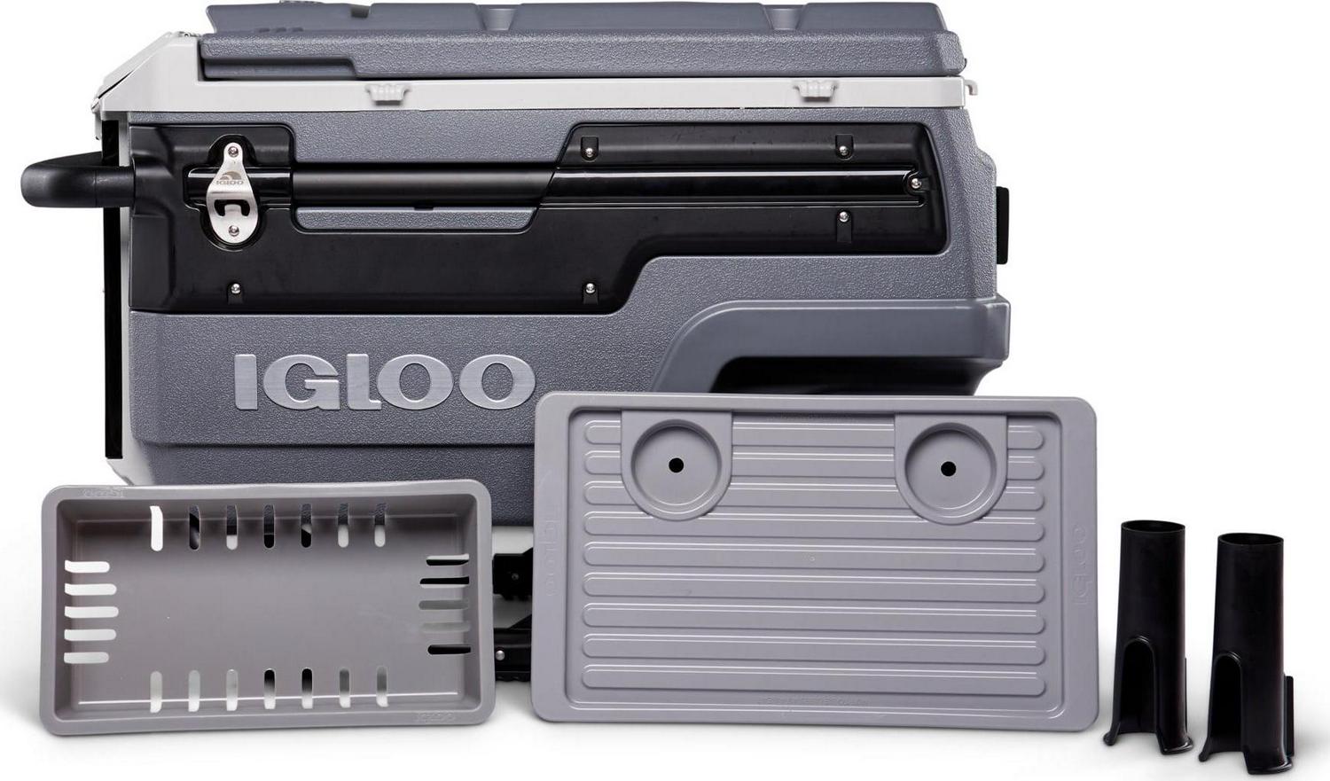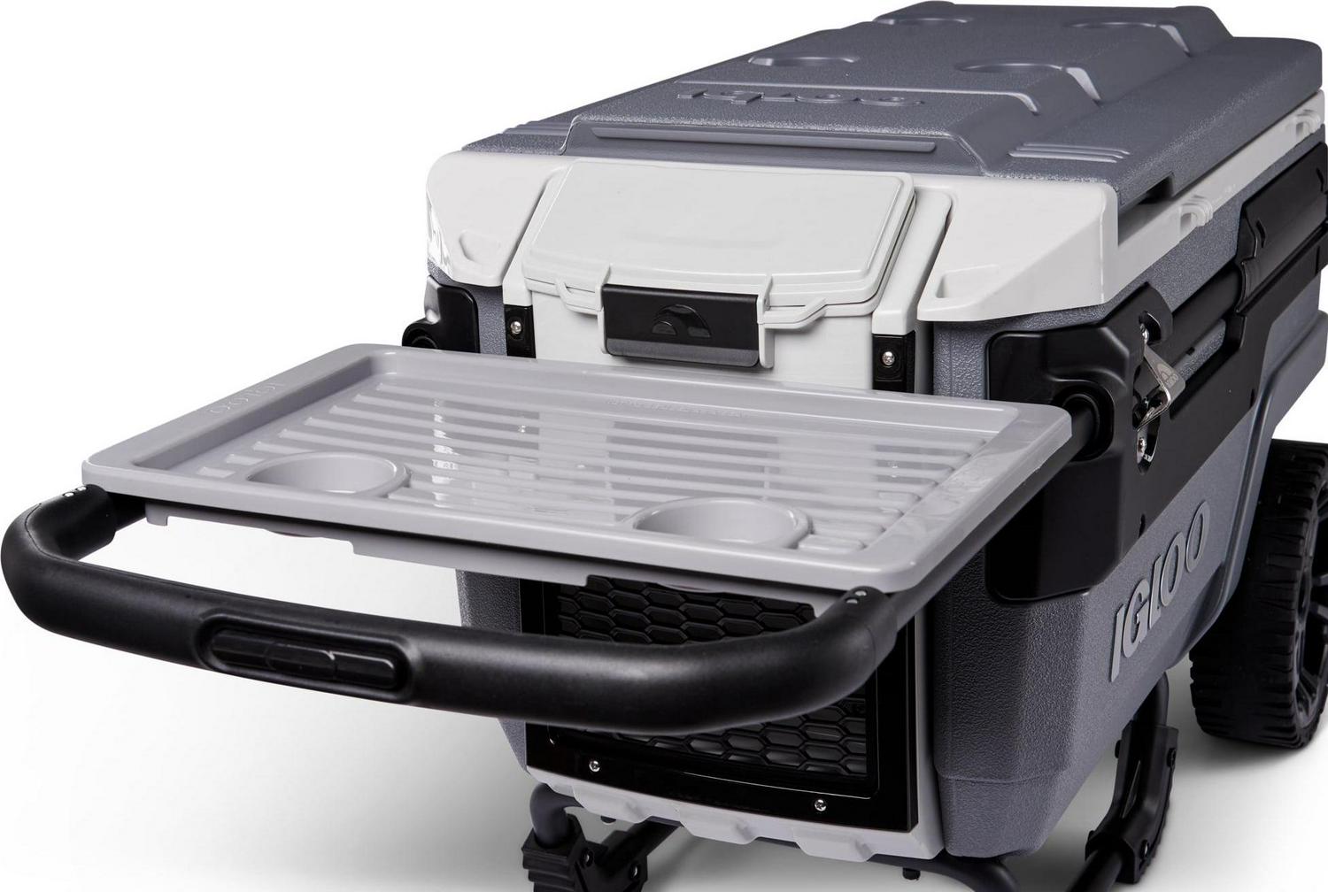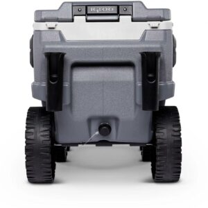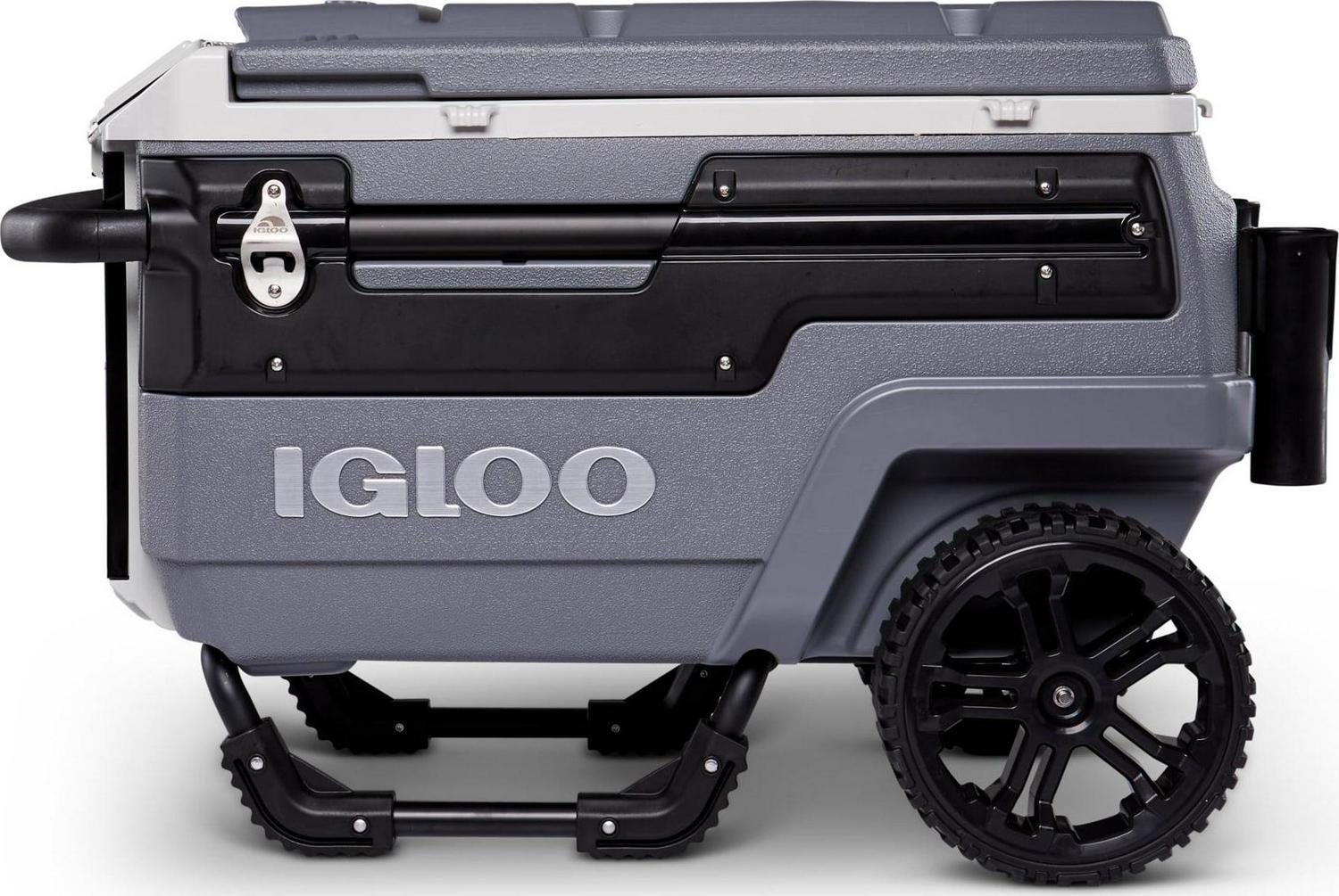 – 70QT Igloo Trailmate Cooler tackles sand & other challenging terrain with the superior traction & ground clearance of 10-inch, never-flat, smooth-ride wheels