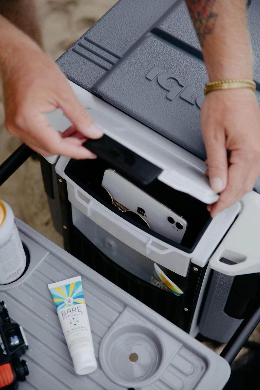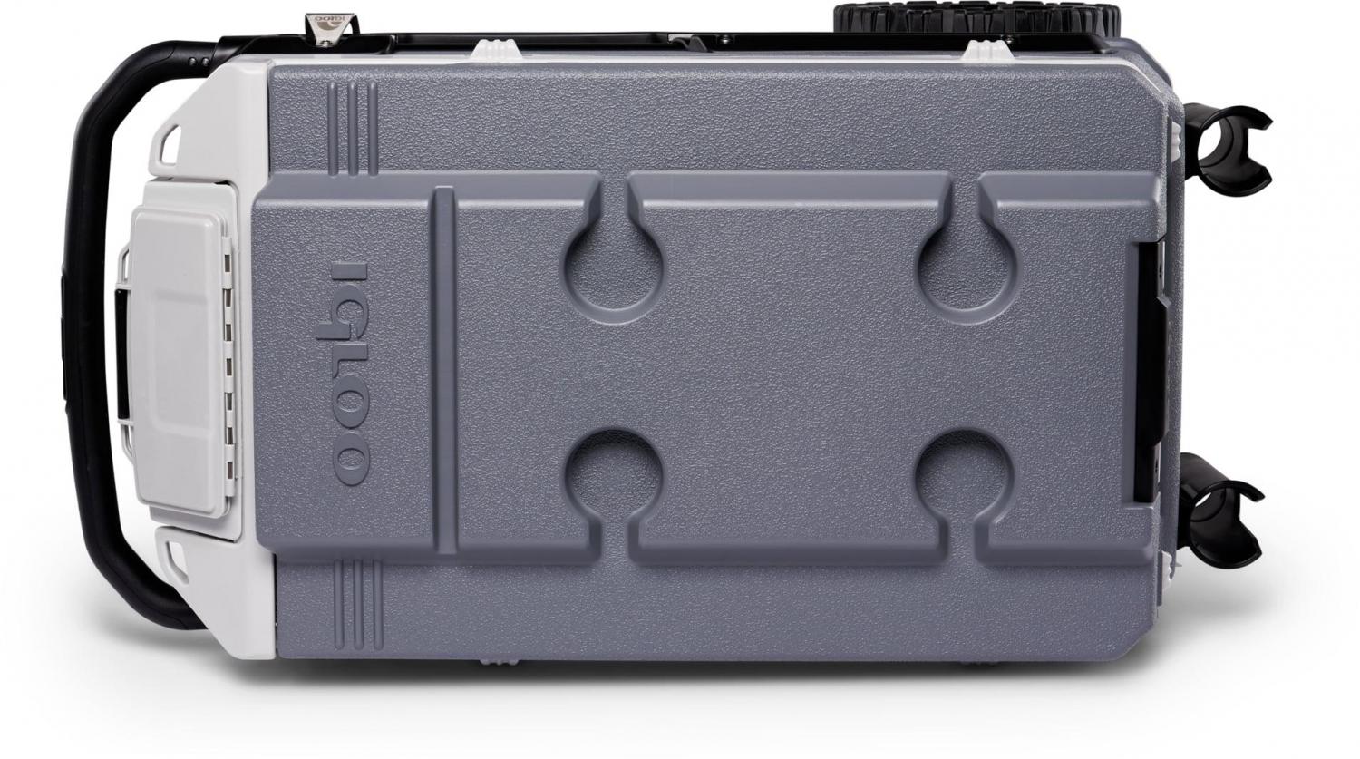 – Four self-draining cup holders in the lid keep your drinks secure & within reach