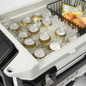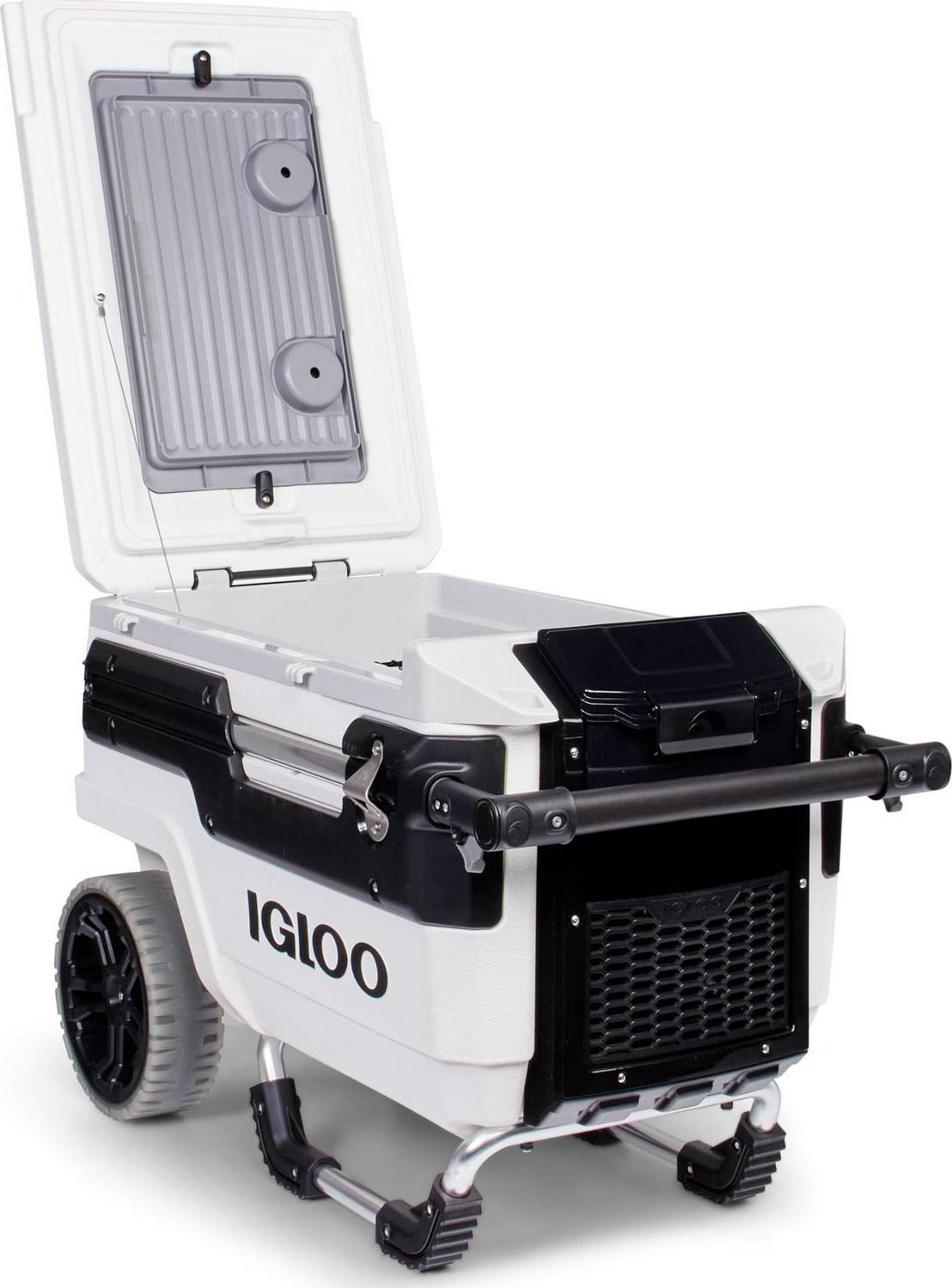 With the Igloo 70 quart Trailmate Marine, in white and black, nothing gets in fun s way when you re out on the water. We built our up-for-anything cooler so it ll easily roll where you want it. It s loaded with tons of handy features like all-terrain smooth-ride wheels (with non-marking tread), telescoping handle, THERMECOOL insulation, bottle openers, UV inhibitors and way more. High-density polyethylene construction provides durability. So you can enjoy your days out on the boat while supplying the crew with ice-cold goods. Dimensions: 23″ x 14″ x 11.2″. Made of High Density Polyethylene.
