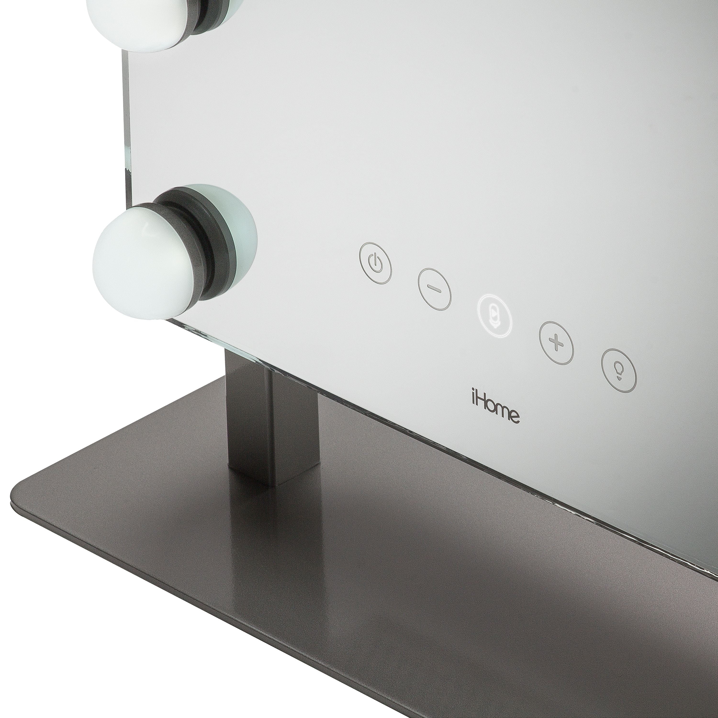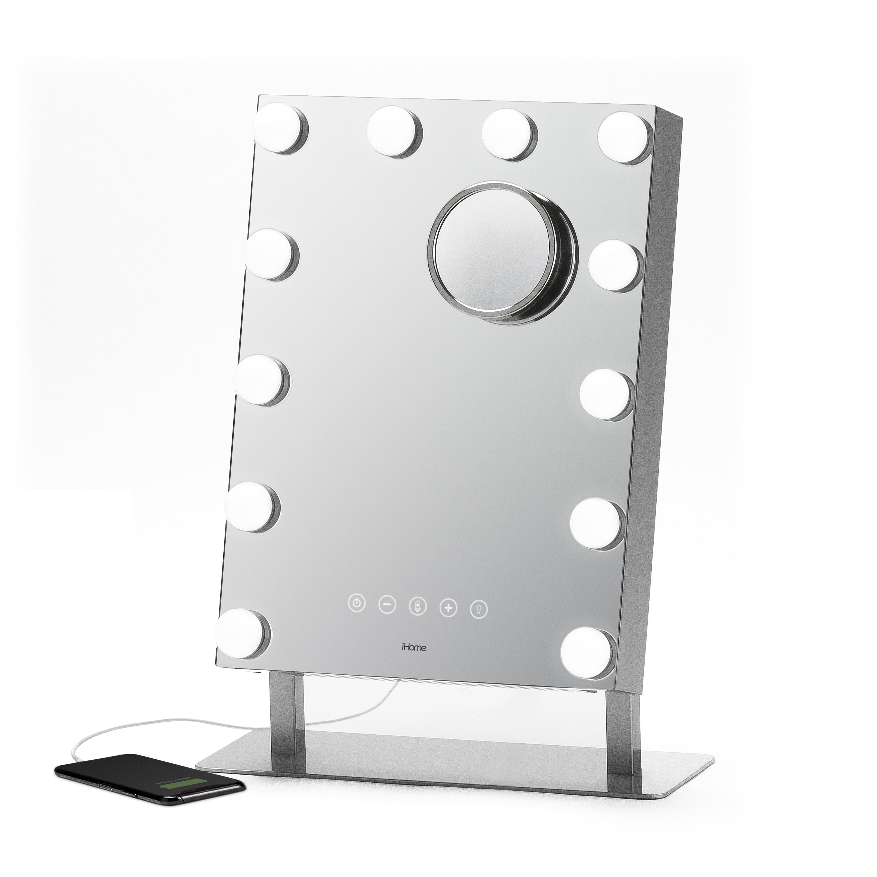 iHome iCVBT15 Bluetooth Smart Speaker, 8 W RMS, Google Assistant, Siri Supported, Silver Large, Distortion-Free: 12″ x 16″ mirror Detail Mirror: 10x magnification, removable detail mirror Full-Spectrum Lighting: 550 LUX with 4 levels of brightness Three Color Light Modes: Warm and Cool Full-spectrum Natural LED Lighting. Soft Yellow, Warm White, and Bright White. Voice Control Button: Works with Siri and Google Assistant to play music, check the weather, and more from your connected Bluetooth device. Bluetooth wireless audio: Stream digital audio wirelessly from your Bluetooth-enabled audio device Sound: Room-filling dynamic sound, Passive Subwoofer; Powerful bass for enhanced stereo sound Speakerphone: Speakerphone with digital voice echo cancellation and talk/end controls USB Charging: 2.4A USB fast charging port Audio Output: 4Wx2 watts RMS