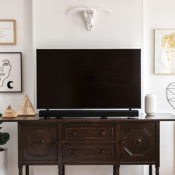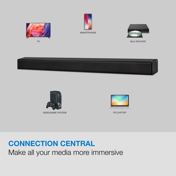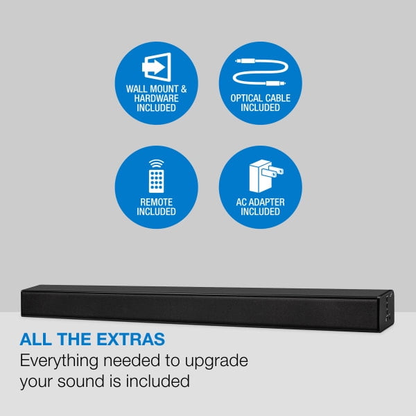 40″ length Bluetooth wireless allows straightforward wireless pairing of Bluetooth enabled devices Supports Bluetooth v5.0 Supports profile A2DP (Advanced Audio Distribution Profile) 2.2 channel stereo sound Optical digital audio input Aux in (3.5mm audio input) RCA stereo audio inputs 3 sound mode settings: movie, music, dialog 2 built-in 3.5 x 1.97″ stereo speakers Frequency response: 180Hz – 15kHz Impedance: 4ohms Sensitivity: 82dB 2 built-in 3″ woofer speakers Frequency response: 75Hz – 400Hz Impedance: 8ohms Sensitivity: 73dB Audio output power: 10W x 2 + 30W at 10%THD Digital volume control LED source/pairing indicators LED power indicator Wireless range: 60 feet Full-function remote Cloth speaker grill Wall mountable AC power input: requires an AC/DC power adapter (included) Remote control: requires a CR2025 battery (preinstalled) Optical audio cable, (78.74 in./2M length) Wall-mount hardware and instructions AC/DC power adapter