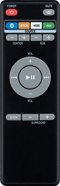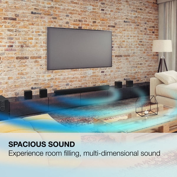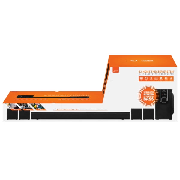 Bluetooth wireless 5.1 channel surround sound ready 6 surround speakers: subwoofer, front left & right, surround left & right and soundbar 32″ soundbar with 4 satellite speakers Wooden subwoofer enclosure 5.1 channel RCA inputs: front L&R, surround L&R, center, and subwoofer HDMI input: supports ARC Wireless range 60 ft Cloth speaker grill and remote DC power input: requires an AC/DC power adapter (included) Remote control: requires a CR2025 battery (preinstalled) Wall-mount hardware and instructions LED pairing indicator LED power indicator Play/pause/pairing button Skip forward/skip back buttons AC/DC power adapter User’s guide