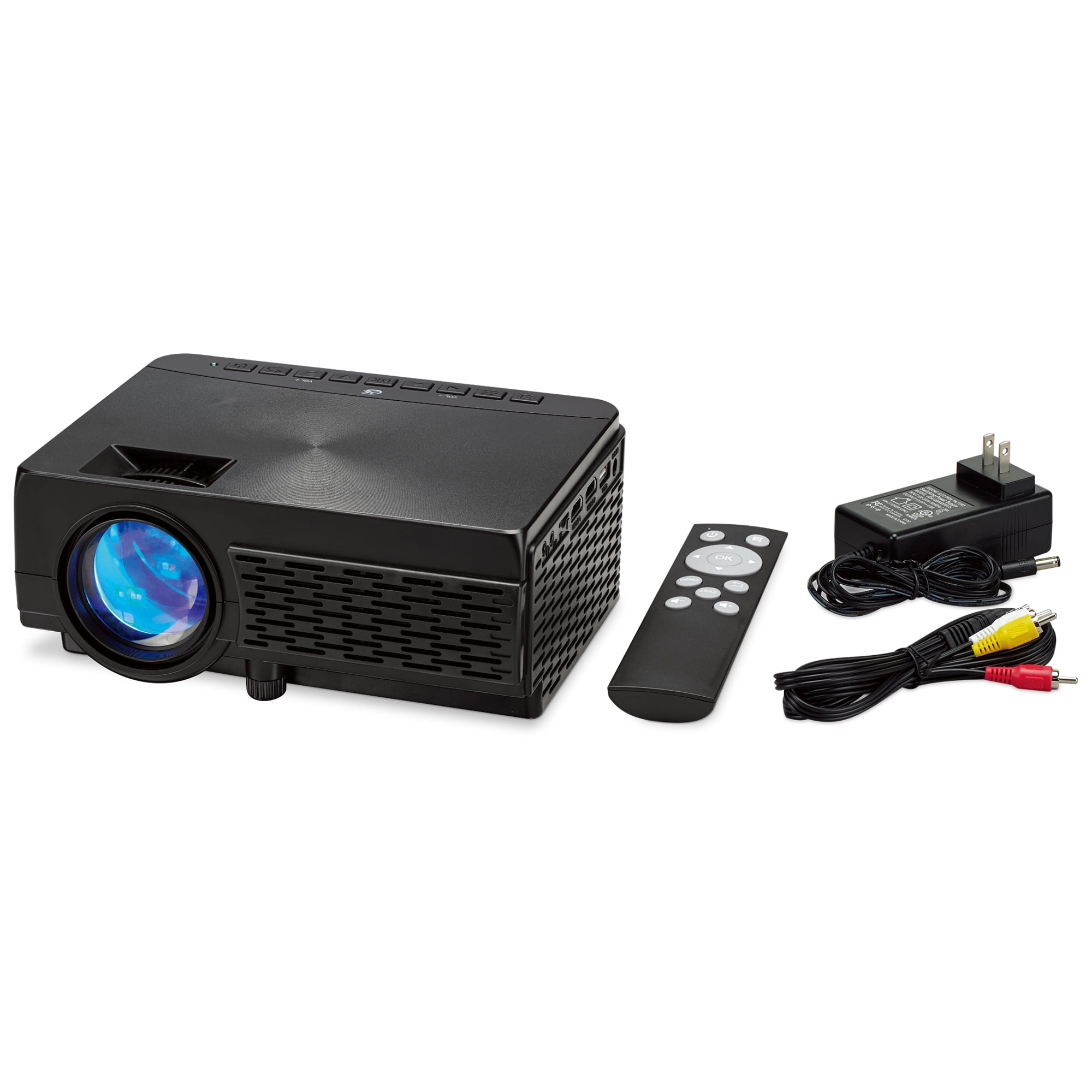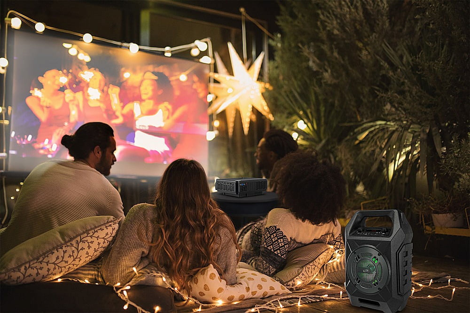 Includes: Mini Projector, Soft Projection Screen, Bluetooth Tailgate Speaker, Remote control, Audio Cables, USB Cables, Rope and Wall Hooks, Carry Storage Bag Projector supports: 480p, 720p, 1080i, 1080p 65 ANSI lumens provides visibility in both dark rooms and rooms with ambient light Built-in Bluetooth wireless transmitter lets you send data to a Bluetooth enabled device Keystone angle correction allows you to adjust projection angle for a perfect picture DC power input: requires an AC/DC power adapter (included) 120″ diagonal screen gives you a larger-than-life viewing area Wide screen 16:9 aspect ratio Gain: 1.3 provides an extra touch of brightness with color accuracy Screen material: Polyester fiber cloth Folds for travel Bluetooth wireless allows straightforward wireless pairing of Bluetooth enabled devices Built-in 5.25″ woofer delivers deep, decadent bass Wireless range: 60 feet keeps your devices connected even as you roam Digital FM radio (PLL) – listen to your favorite FM stations LED light effects and red LED display DC battery power: built-in rechargeable battery Battery life: 3 hours Charge time: 5 hours FCC compliant 90 Day Limited Warranty