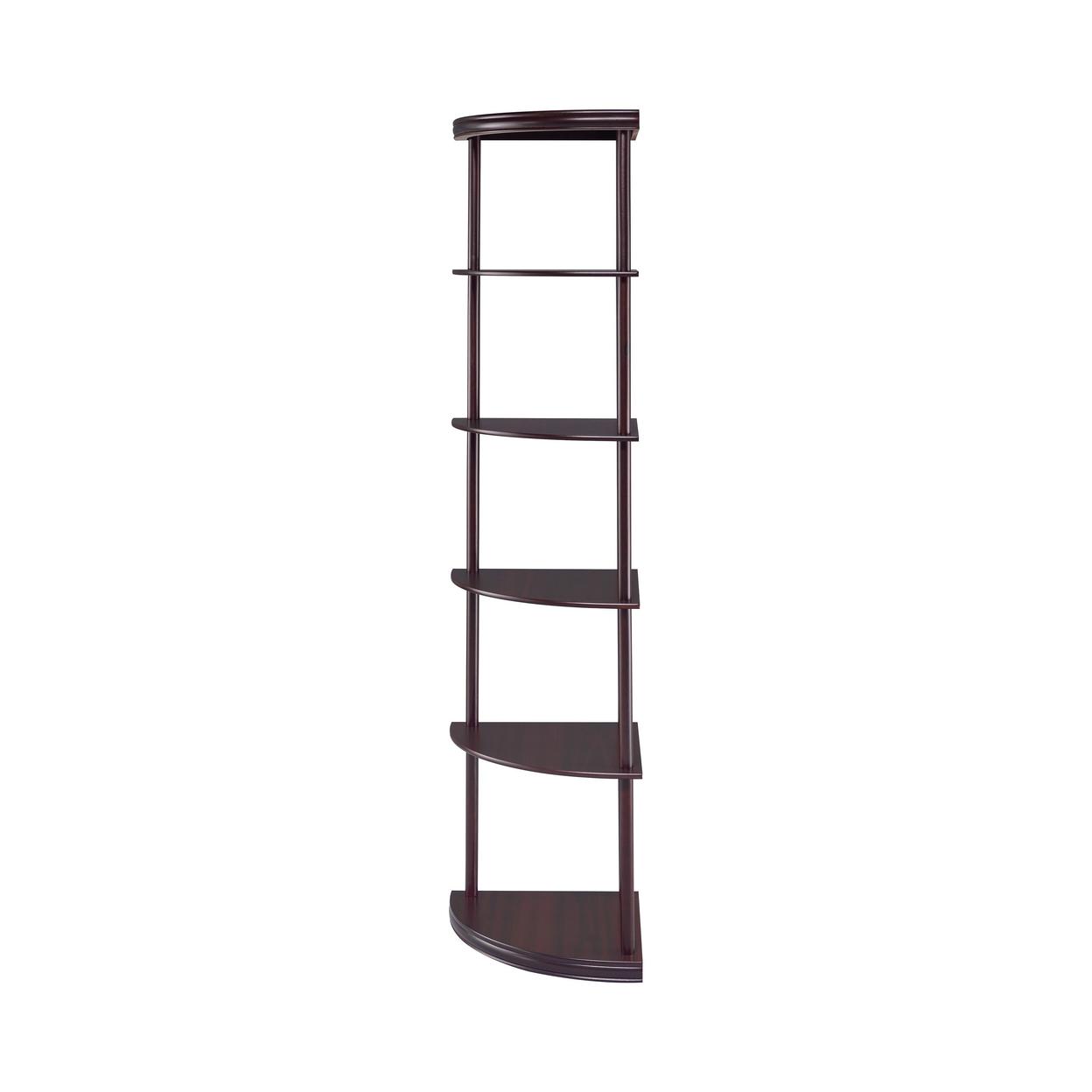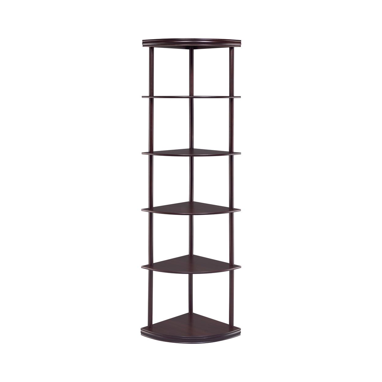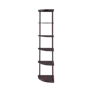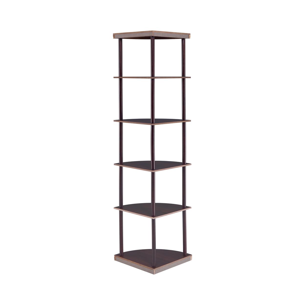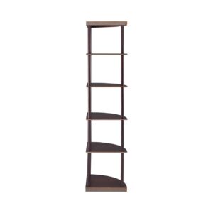 Illuminating corner bookcase with five pie shaped shelves, Brown- Saltoro Sherpi Make the most of all available space by using this corner bookcase to add storage and display space to a corner. The dark brown finish and simple style of this corner bookshelf with five pie-shaped shelves will add style to your decor. It is a great functional addition to a living room, office, bedroom, or dining area