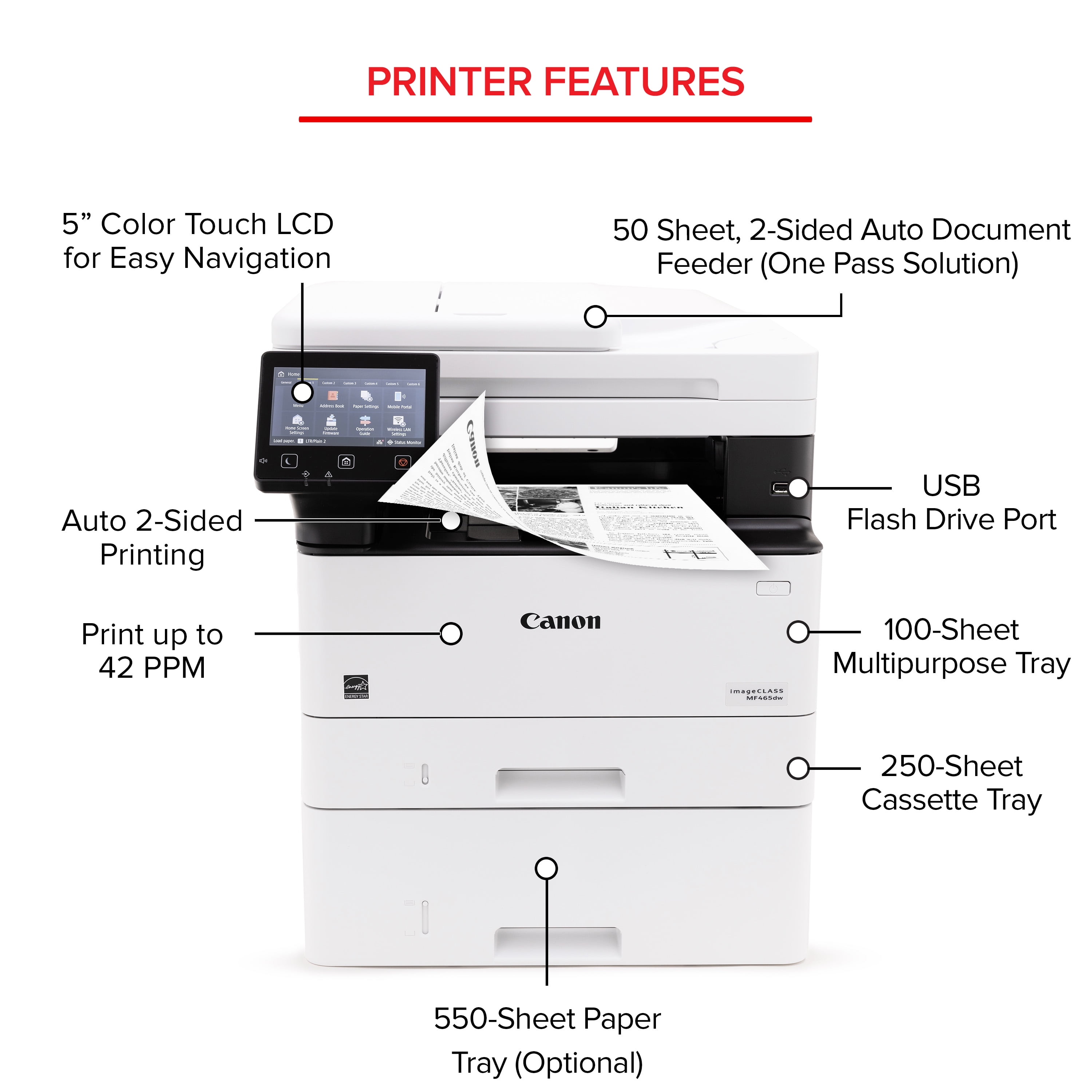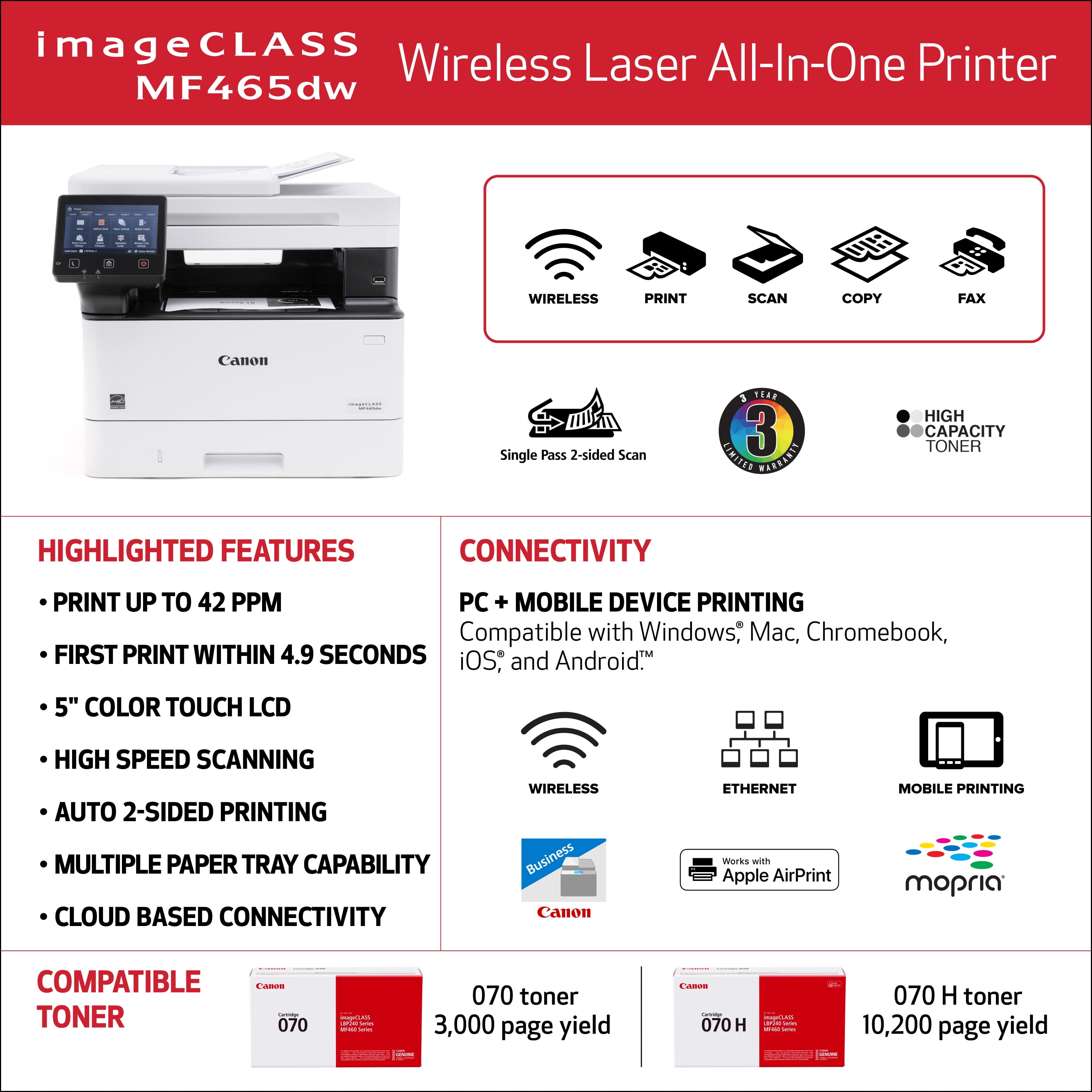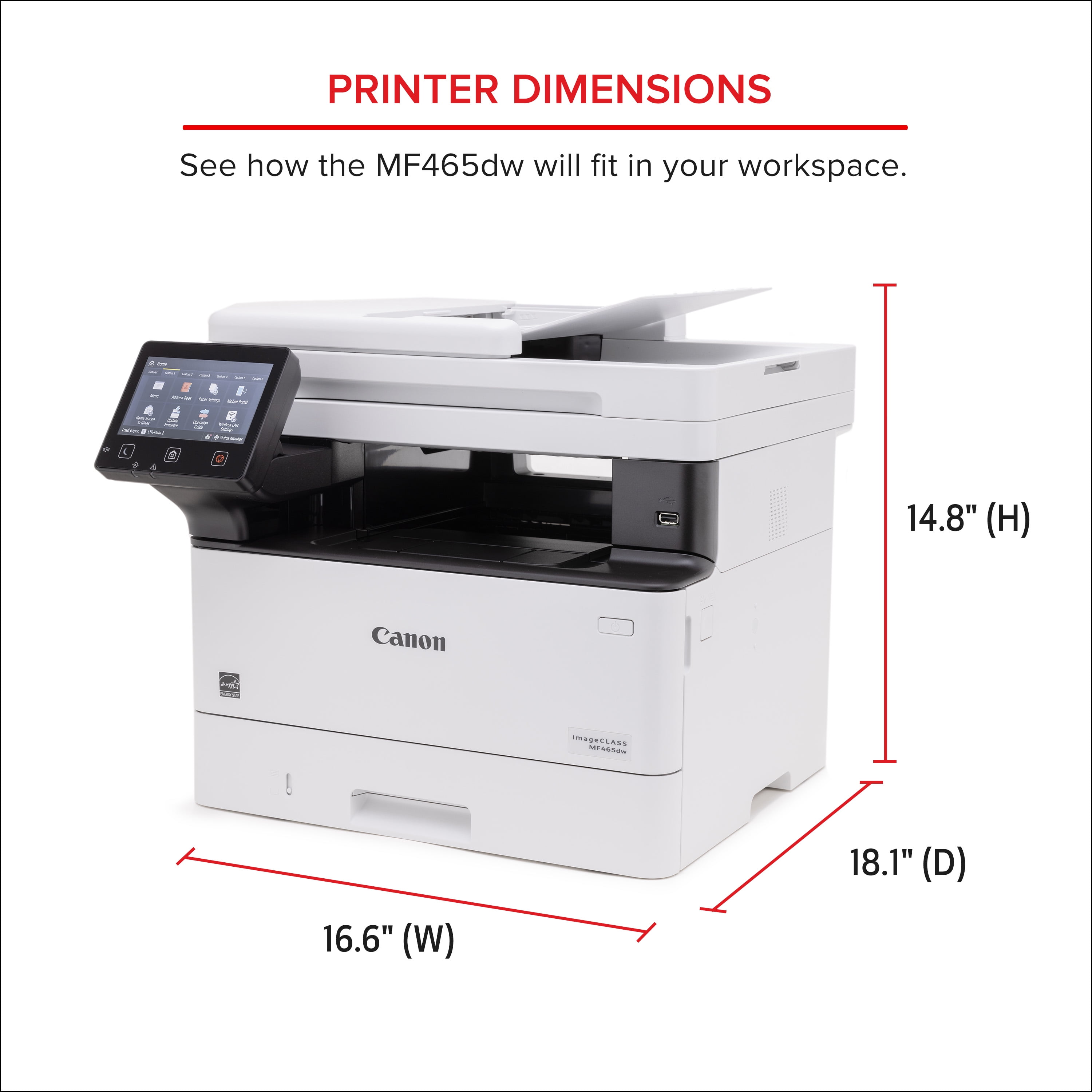 The imageCLASS MF465dw is designed for small office environments where black-and-white multifunction capability is needed, and productivity, ease of use and large toner and paper capacity are priorities. This model has expandable paper capacity of up to 900 sheets and is backed by Canon’s U.S.-based service and support network.