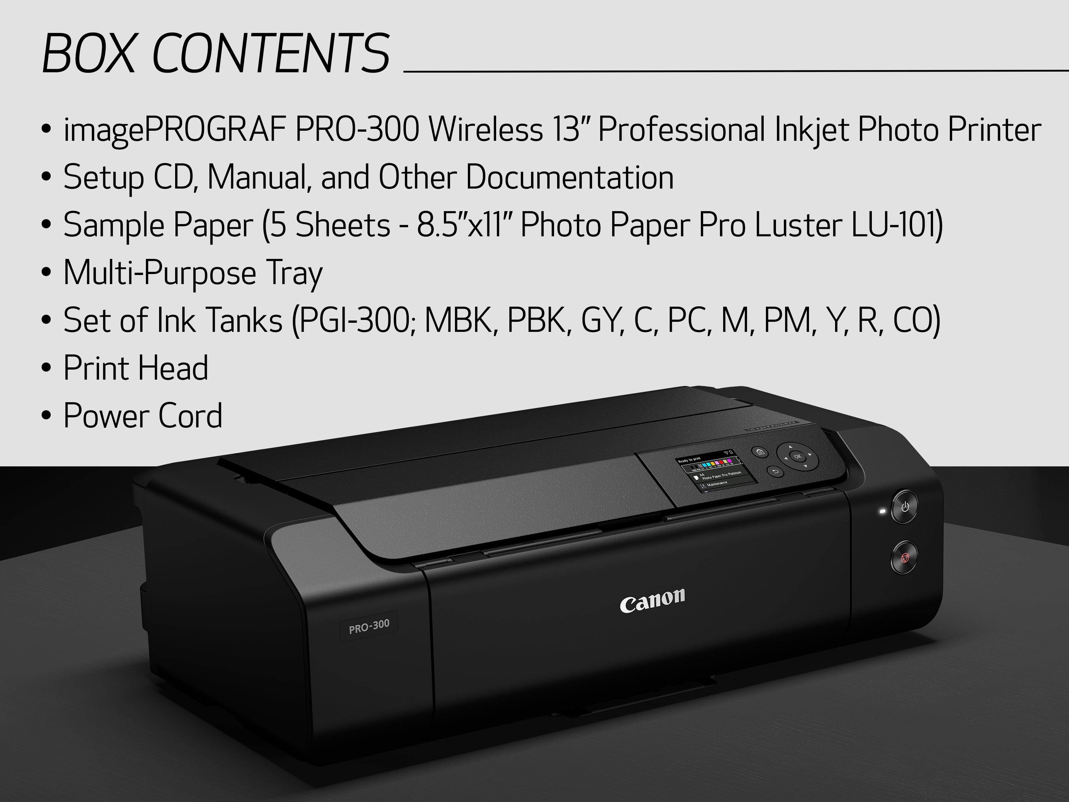 Take complete creative control of your images and bring them to life with the imagePROGRAF PRO-300 professional inkjet photo and fine art printer. Produce gallery quality color and black-and-white prints with detailed gradations, a wide color gamut, and deeper blacks on fine art paper thanks to the new Matte Black ink. With a 9-color plus Chroma Optimizer ink system, this 13″ wide photo printer is designed to meet the demands of every photographer, from advanced amateurs to professionals. The imagePROGRAF PRO-300 offers professional image quality, productivity, and outstanding workflow with a smaller footprint, allowing you to consistently deliver the results your images deserve.
