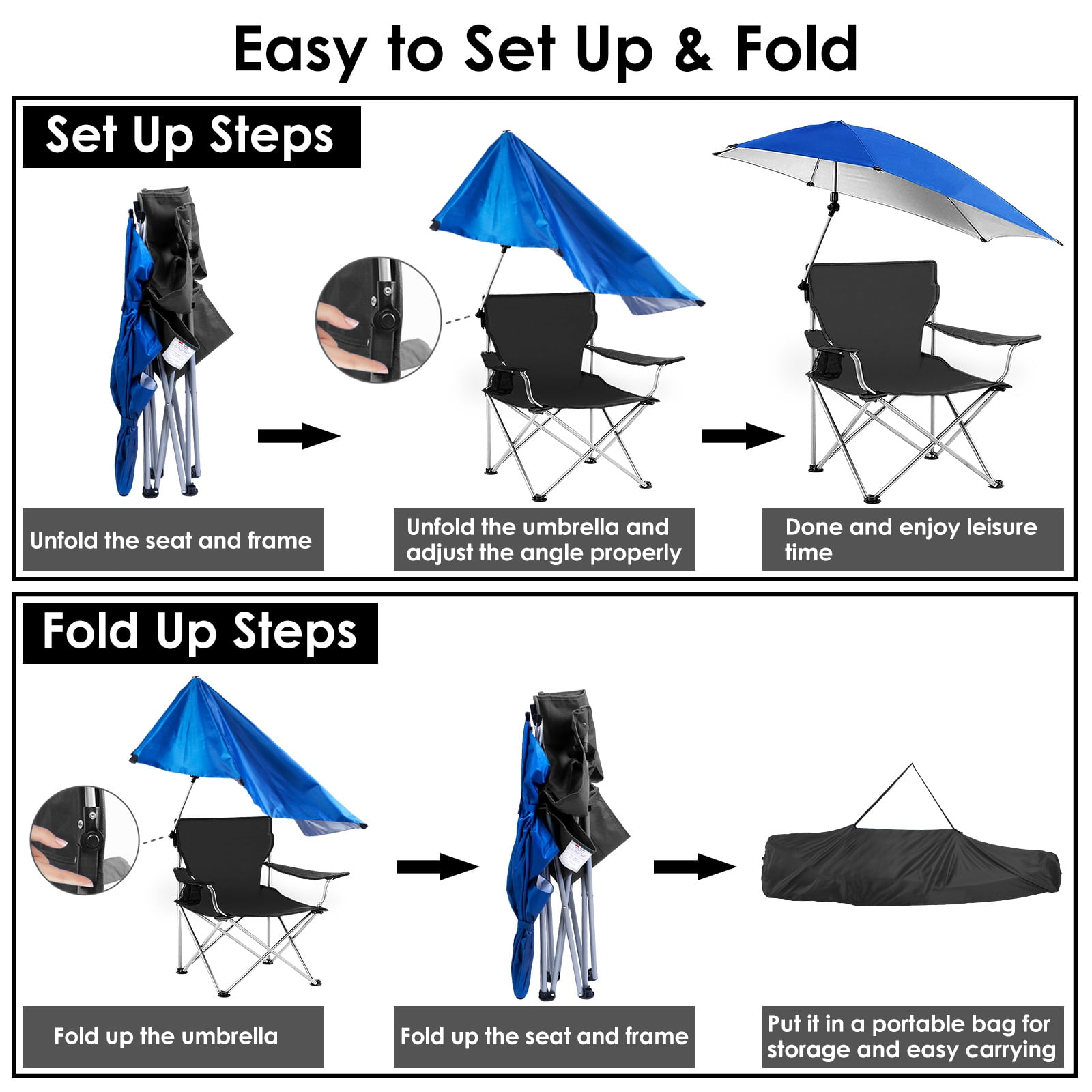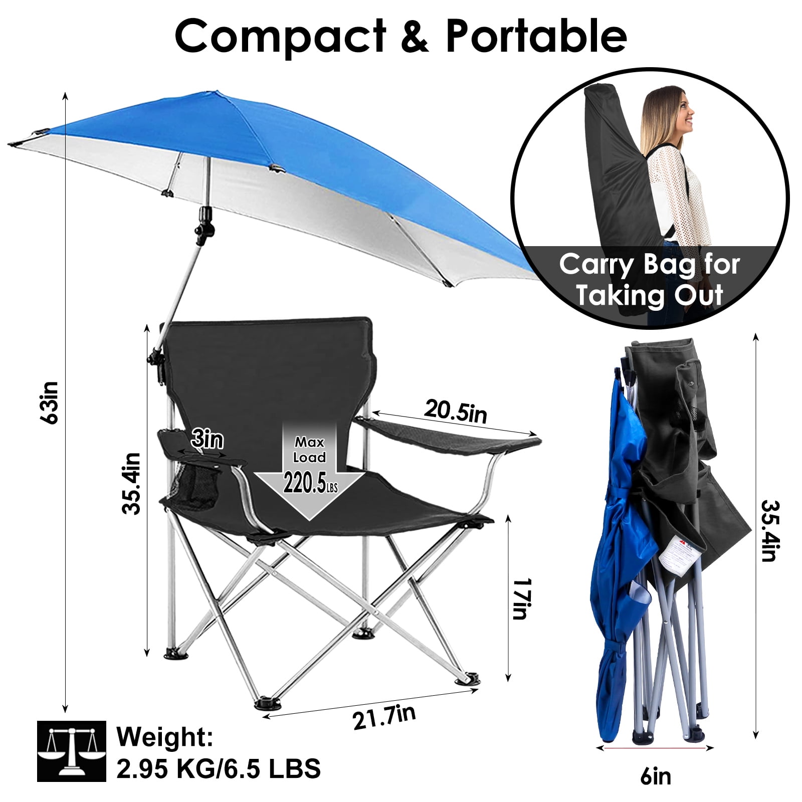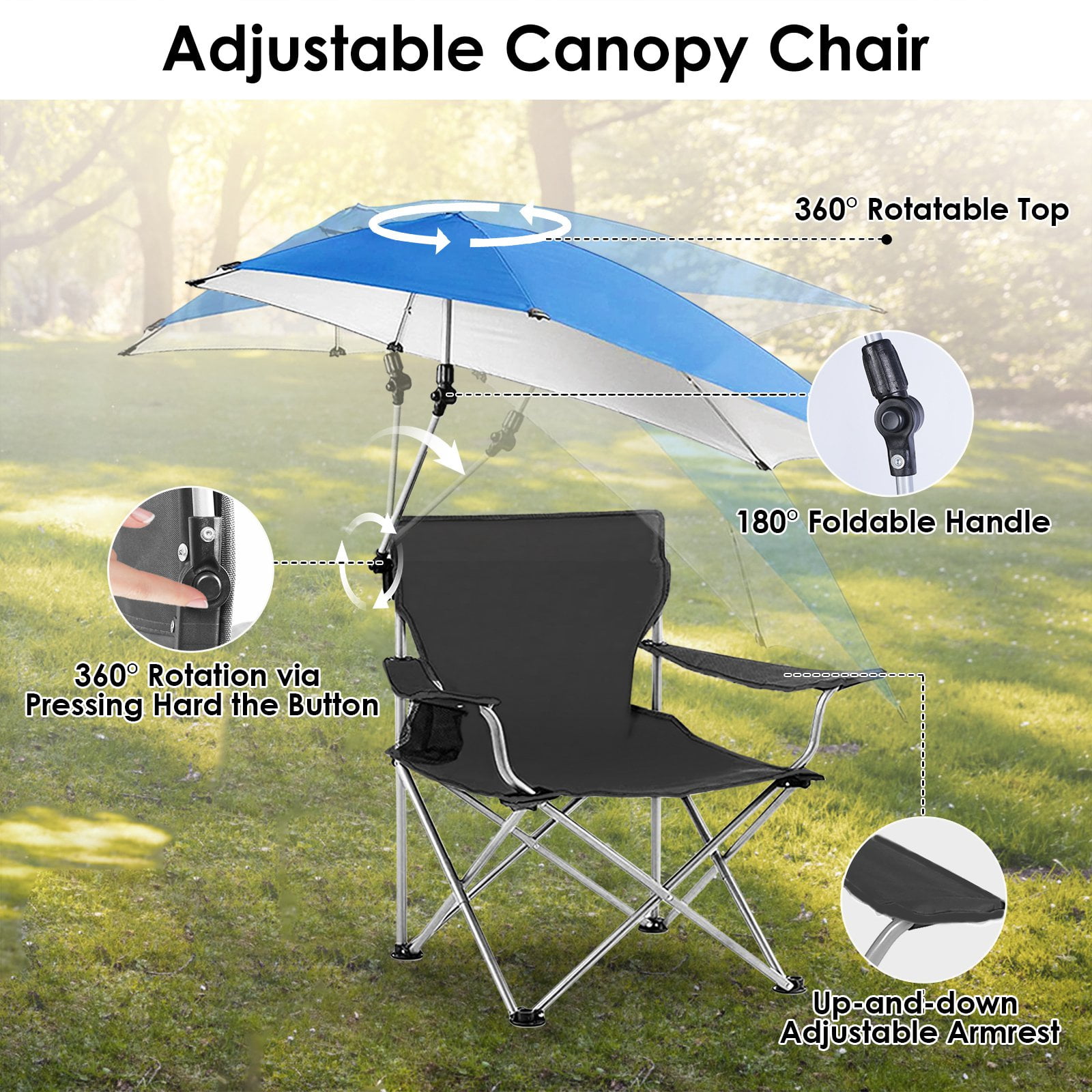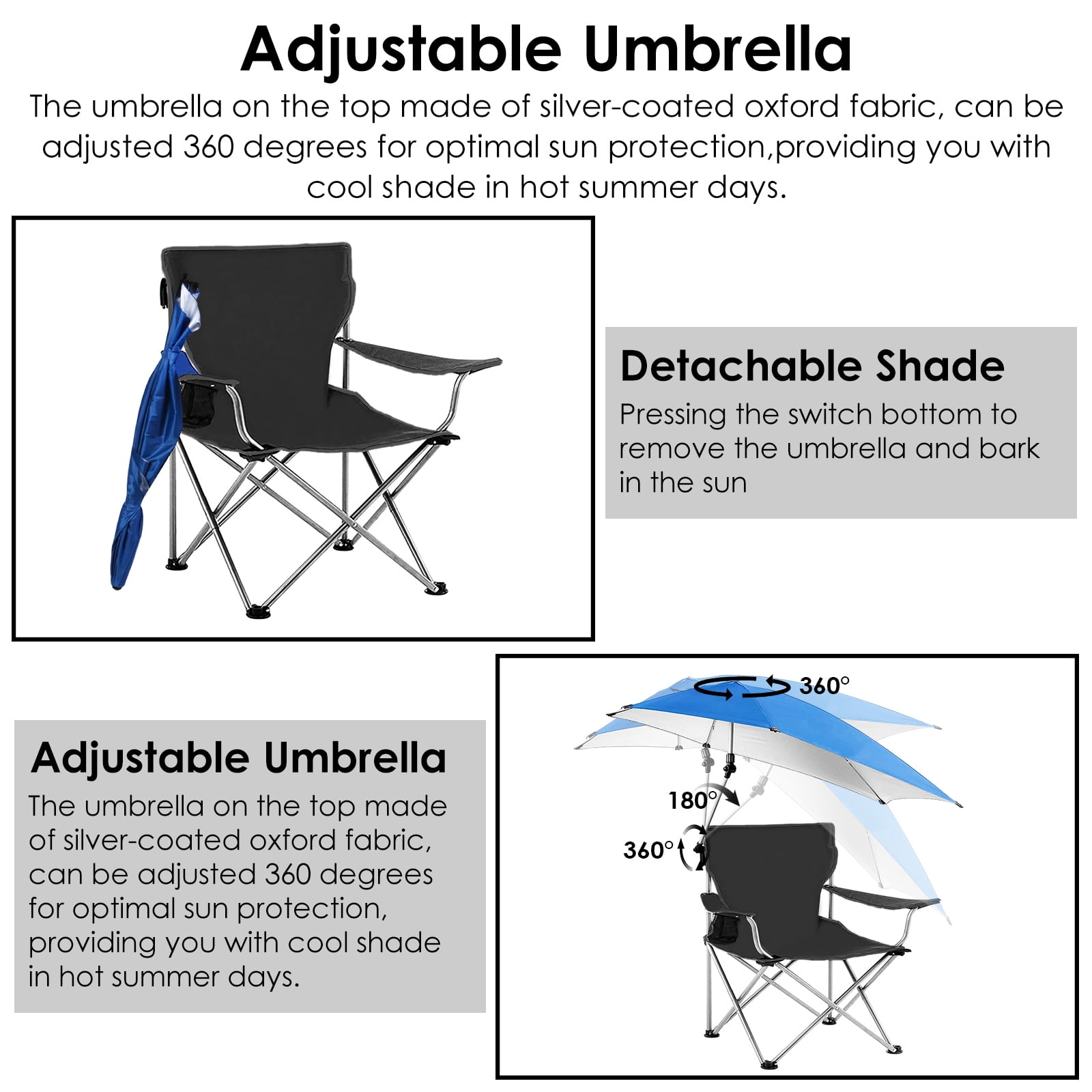 【Upgraded Sun Protection】The umbrella on the top is made of silver-coated oxford fabric, prevents strong UV and provides you with cool shade in a hot summer days. You can enjoy the shade and breeze at park, beach, pool, backyard, camp site or in other outdoor activities. 【Detachable & Adjustable Umbrella】The oversized umbrella’s angle can be adjusted 360 degrees for optimal sun protection. If you want to bask in the sun, the umbrella can be lowered or detached. 【Comfortable & Convenient Chair】16.5 x20in Spacious seat area allows you to relax while sitting. 17in Seat height and adjustable armrest ensure maximum comfort. Come with a mesh cup holder, everything is within arm’s reach. Rest on the camping chair, drink a cup of coffee, and enjoy your summer trip. 【Easy Storage & Transport】The Camping chair folds down to 6x4x35.4in and can be packed into a carry bag that come with it. Easily store it and take it anywhere you want by putting it in your trunk. 【Perfect Companion for Summer Travel】Made of premium 600D oxford cloth and the extra supporting steel tubes on the bottom improve the overall weight capacity of 220.5lbs. Durable and stable. Easy to fold and unfold, suitable for you to enjoy the shade and breeze at park, beach, pool, backyard, camp site or other outdoor places. Specifications: Product Type: Foldable Canopy Chair Color Options: Blue, Black, Red Chair Materials: 600D Oxford Fabric; Paint-drying Steel Tube Umbrella Material: Silver-coated Oxford Fabric Load Bearing: 100kg/220.5lbs Umbrella Rotatable Angle Range: 0°~360° Umbrella Foldable Angle Range: 0°~180° Chair Tube Diameter: 17.5mm/0.7in Umbrella Tube Diameter: 13mm/0.5in Tube Wall Thickness: 0.8mm/0.03in Seat Size: 42×51 x 43cm/16.5 x20 x 17in Cup Holder Diameter: 8cm/3in Folded Item Size: 15×10.5x90cm/6x4x35.4in Extended Item Size: 81x118x160cm/31.9×46.5x63in Item Weight: 2.95kg/6.5lbs Package Contents: 1 x Canopy Chair 1 x Carry Bag 1 x User Manual Canopy Chair; Foldable Chair; Camping Chair; Sun Protection Chair; Canopy Chair with Shade; Foldable Camping Chair; Lawn Chair; Collapsible Folding Chair; Beach Chair; Adjustable Lawn Chair; Outdoor Folding Chair; Collapsible Folding Chair