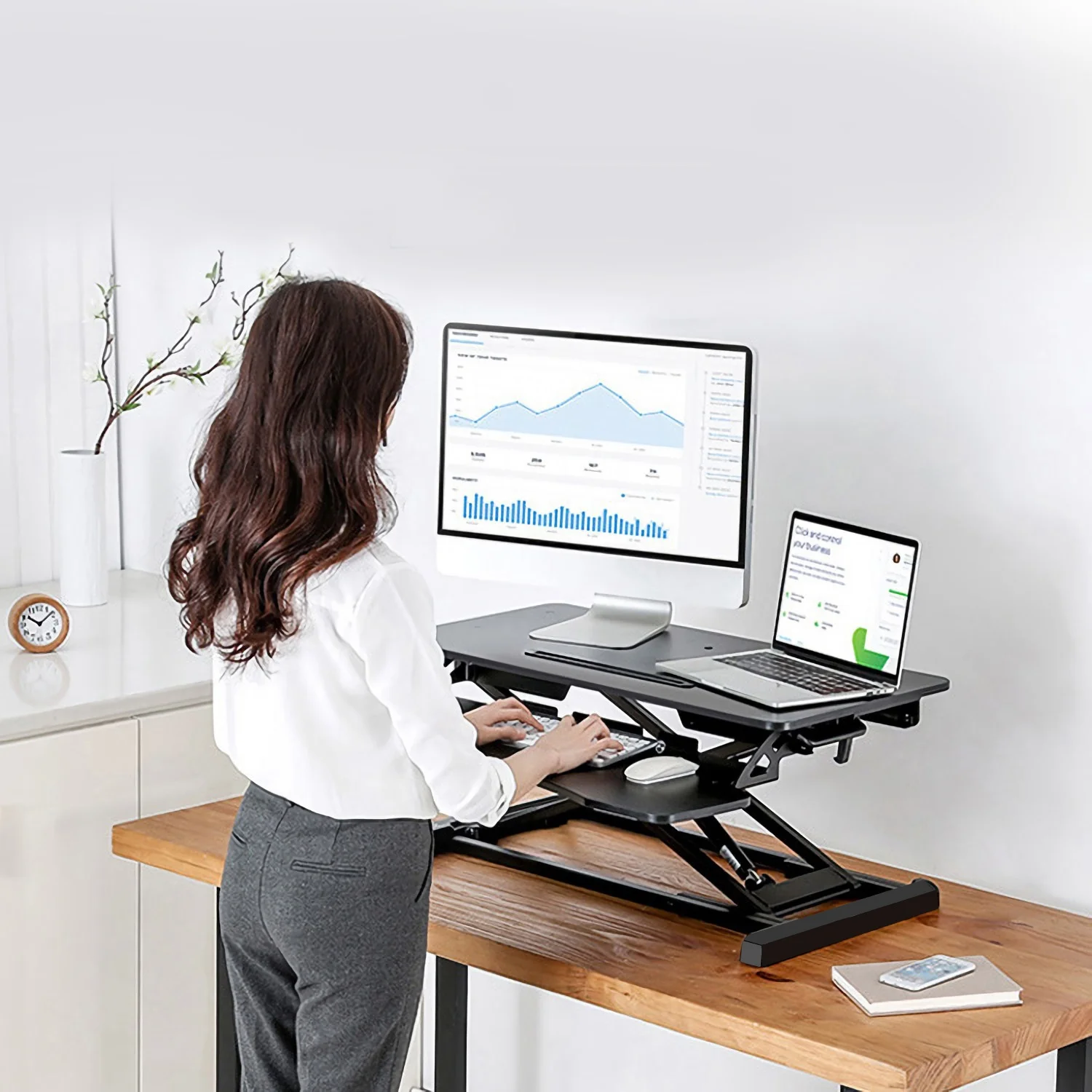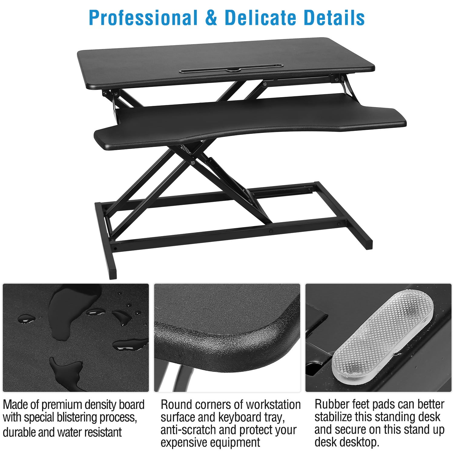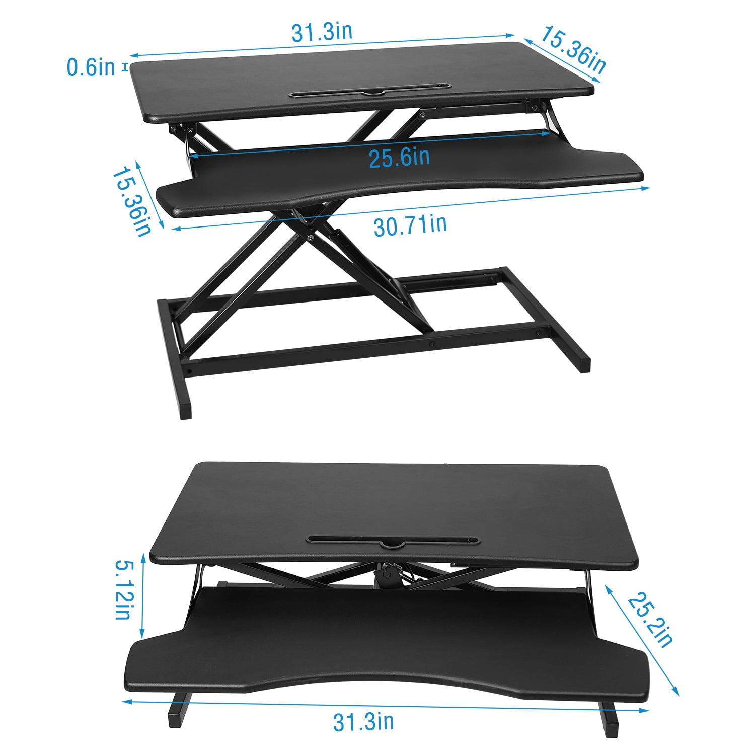 WORK HEALTHIER: Our standing desk can be adjusted to the desired height (5.12in-20.08in) smoothly via pressing the spring handle. Sit and stand throughout the day for a healthier way to work. This sit to stand desk riser is designed to encourage more movement throughout the day helping to improve productivity and energy, as well as eliminating or reducing neck, back and shoulder pain. LARGE DESKTOP & KEYBOARD TRAY: 31.3×15.36inches desktop working area can place one monitor, one notebook PC within 32inches, and some files. Come with a phone/tablet slot on keyboard tray, you can put cell phones, tablet pc on the stand up desk. Entertain yourself and give you a break. STABLE & DURABLE: Made of premium density board with special blistering process and coated iron materials, support 44LBS max load. Our height adjustable desk starts very smoothly and there are rubber feet pads, which can better stabilize this standing desk assured that your expensive equipment will be safe and secure on this stand up desk desktop. WIDE APPLICATIONS: Our standing desk is most suitable for the office, and our height adjustable desk is also suitable for bedrooms, balconies, living rooms. Enjoy watching documents while drinking coffee. EASY SETUP: Simply pull your already assembled adjustable standing desk out of the box and attach the ergonomic keyboard tray using the included hardware. Quick installation and enjoy your working time.