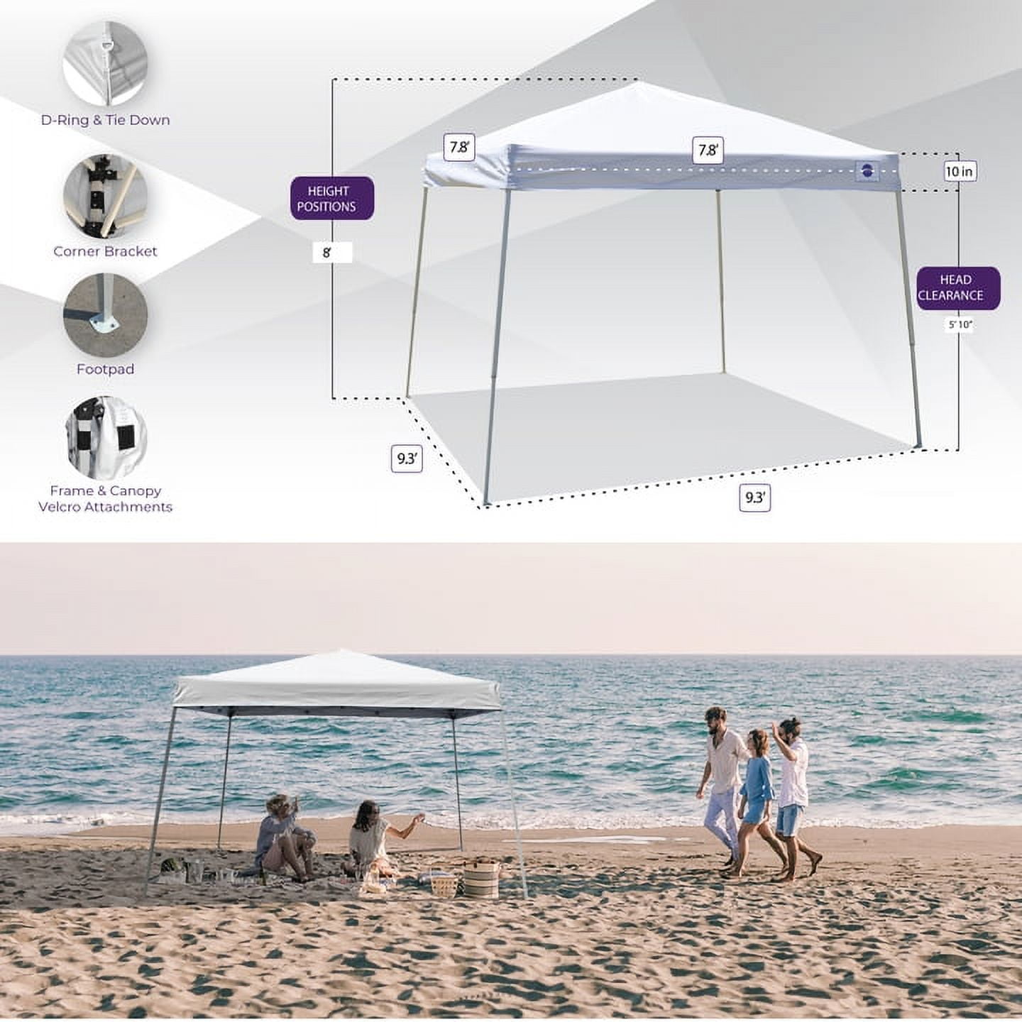Slant leg canopy has a 10′ x 10′ base footprint and 8’ x 8’ canopy top; featuring three adjustable height settings, slant leg canopy provides 62 square feet of shade coverage; Maximum height is 8 feet with a 5’10” head clearance Available Colors: American Flag (Red, White, & Blue – Stars/Stripes), Blue, White, Gray, Khaki, Orange, and Lime Green Canopy sets up fast for variety of uses such as beach tent, park, outdoor concerts, weddings, street fairs, farmers market, weddings, tailgating, sporting events and more Powder-coated steel canopy frame and 210 weight denier canopy top are only 25 lbs. RECREATIONAL USE: Slant leg canopy is designed for temporary use and is not intended for long-term, permanent cover; Canopy will not withstand windy, rainy or snowy conditions INCLUDES: Frame, Canopy top, spike and rope, and carrying bag