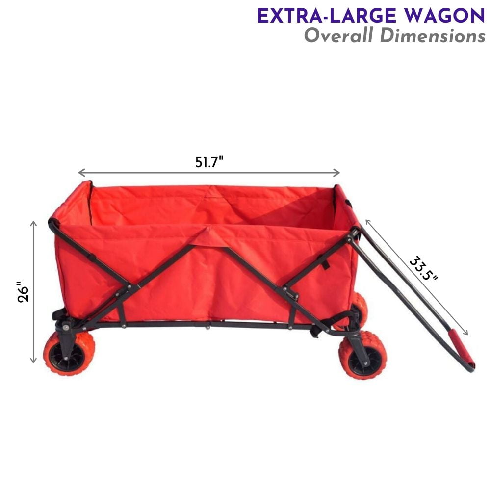 NO ASSEMBLY REQUIRED: Collapsible wagon sets up and folds down in seconds for ease of use and convenience DURABLE CONSTRUCTION: Utility cart wagon is made of 600 denier polyester MULTIPLE USES: Collapsible wagon utility cart is great to have on hand when hauling gear for camping, sporting events, outdoor concerts, and gardening EASY STORAGE: Collapsible wagon folds down to approximate down to 34.4-inches L x 8.9-inches W x 26-inches H for easy storage in your car or in your house CAPACITY: Measures 51.7-inches L x 24.4-inches W x 26-inches H when open and carries up to 175 pounds