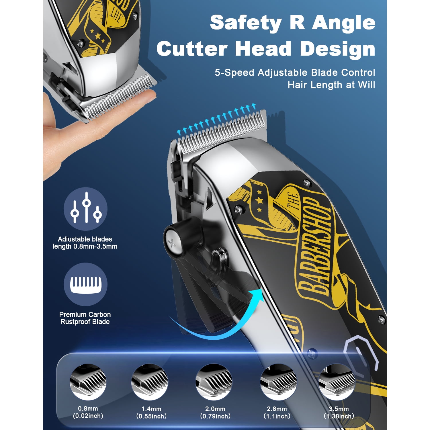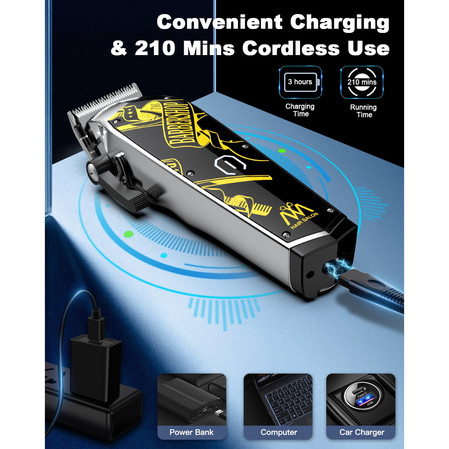 ✄【Professional Hair Clippers Kit Designed for Barbers】 This hair cutting kit is well suited for professional barbers or stylists as well as household use. Hair trimmer equipped with 10 guide combs (1.5/3/4.5/6/9/12/15/18/21/25mm) and 5th gear swing bar with adjustable blade length (0.8/1.4/2.0/2.8/3.5mm), 1 lubricating oil, 1 cleaning brush, 1 USB charging cable, and 1 charger adapter. Easily control the hair length and trim a variety of hairstyles. ✄【Sharp & Durable High Carbon Steel Blade】Barber clippers have an ultra-sharp high-carbon steel blade that is carefully polished through three processes and advanced automatic grinding technology, when working, the cutter head is automatically sharpened, and the more you use it, the sharper it will be, enabling easy and quick cuts without getting stuck hair. Keep the stable rapid cutting speed even to meet the thickest hair. ✄【3 Panel Styles】Hair clippers in addition to the panel of the host, also with extra two replaceable panels, you can choose your favorite panel style as you like, there is a cute barber style, a bright red style, and a simple and elegant black letter style, owning it is equal to owning 3 hair clippers! ✄【High Capacity Battery & Wireless Use 】The clippers for hair cutting built-in rechargeable 2200mAh high-quality battery, USB charged for 3 hours to provide up to 210 minutes of cordless use. It can meet the needs of a professional hair stylist for a day’s work. And the switch with a low-battery charging prompt–red light, not worry about a sudden loss of power during use. ✄【Powerful and Quiet Motor】This cordless professional hair clippers set is equipped with a strong motor, 7000 RPM high-speed motor drive blade for quick haircuts. The clipper is equipped with the latest noise reduction technology so that the noise of the haircut machine when running is less than 55 DB. Provide customers with a comfortable, quiet, and pleasant haircut experience ✄【One-Year Warranty & After-Sales Service】 These haircut machines for men or women come with a gift box design which makes it a perfect gift to be given to your loved/friends ones. We provide a worry-free 1-year warranty and 24hrs/7d friendly customer service for men’s hair clippers. If you have any questions, please contact us in time.