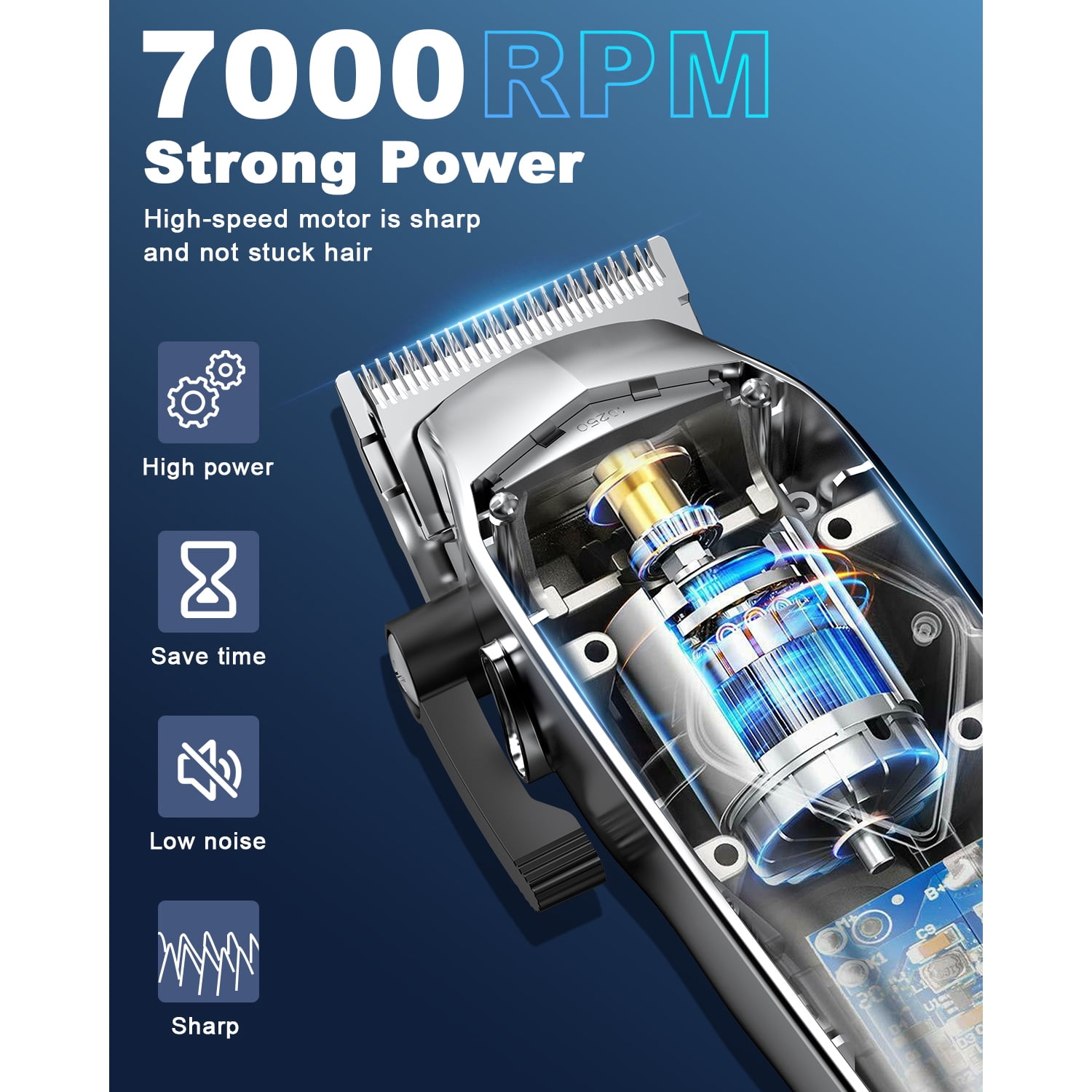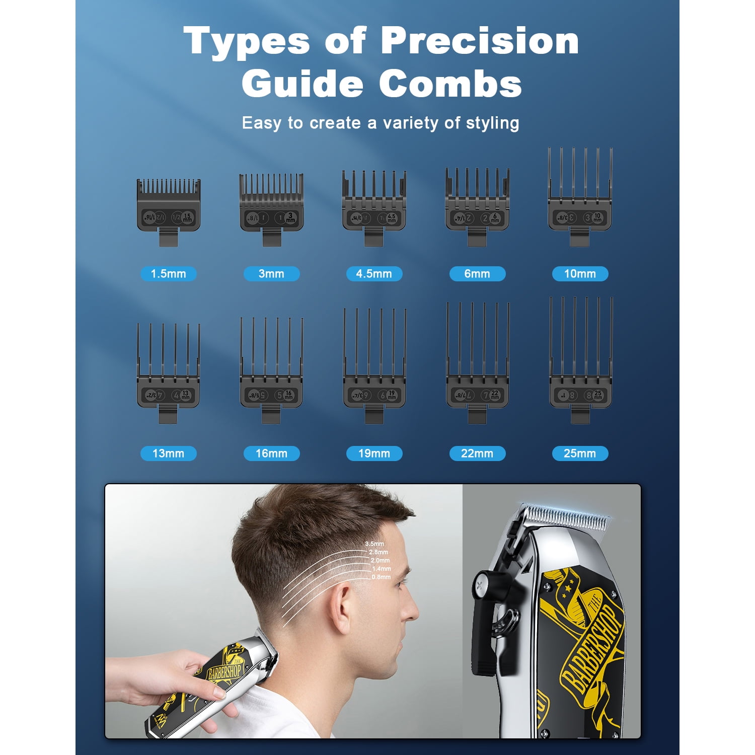 Men’s Professional Hair Clipper Electric Cordless Barber Clipper and Trimmer Set Groom Kit for Men A Professional Men’s Clipper Set made for Salons and Barbers. INBUTY electric hair clippers for men have been used by professionals in the salon and barbering industry, not only the perfect choice for hairdressers’ make styling, but also for daily care at home. Our powerful 7000RPM Motor & Sharp Precision Blades are made to execute a smooth cut for all hair types & withstand A Full day’s work of cutting Hair. You are able to adjust The Lever for precision or Zero-Gap the blades, you are going to produce a smooth cut either way. With Barbers in mind, Our product was made to last long and performs well on different skin & Hair types. Feel Free to take it across the world as the Voltage is compatible worldwide at 220V. Our men’s hair clippers with a safe R-angled blade design that won’t harm the scalp and are tested for safety on arms and fingers. Low Noise Design The cordless hair clipper adopts newest high-quality noise control technology, and the tested noise is less than 55db (within a distance of 30cm), allowing you to have a comfortable and quiet haircut time. With Hook Easy Hang/Take The bottom of the barber kit is designed with hooks, which can be hung on the wall for easy access and storage by the hairdresser. Constant Temperature Technology The hair clipper has the blade constant temperature technology, which has low friction and low heat when trimming, so as to avoid the high temperature of the clipper and damage to the hair. Package Included: Hair clipper x 1 Guide combs x 10 USB cable x 1 USB wall charger x 1 Replacement covers x 2 Cleaning brush x 1 Oil x 1 Blade protector x 1 Blade screwdriver x 1 Replacement screws x 6 User manual x 1 (Please read the user manual carefully before using it!)