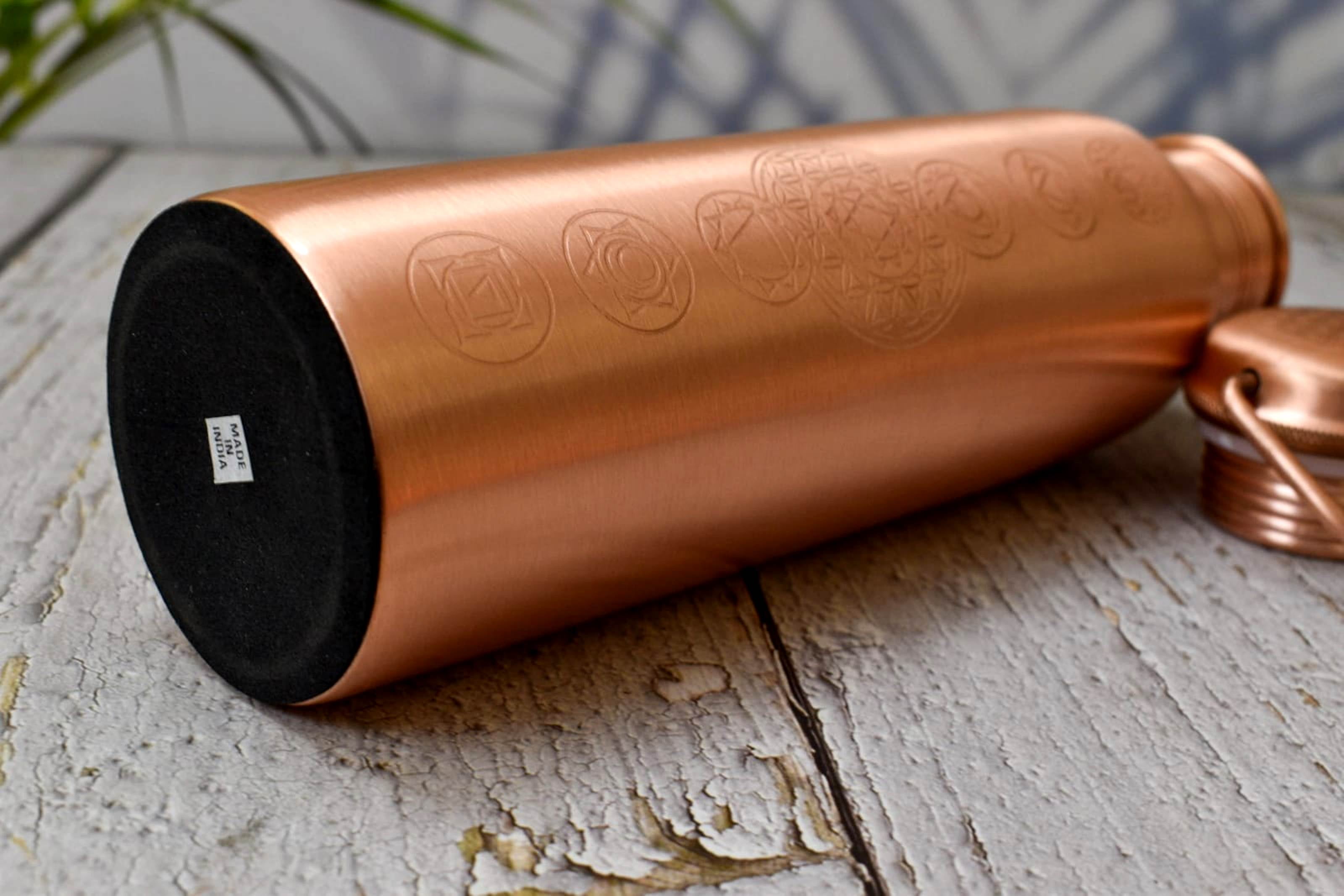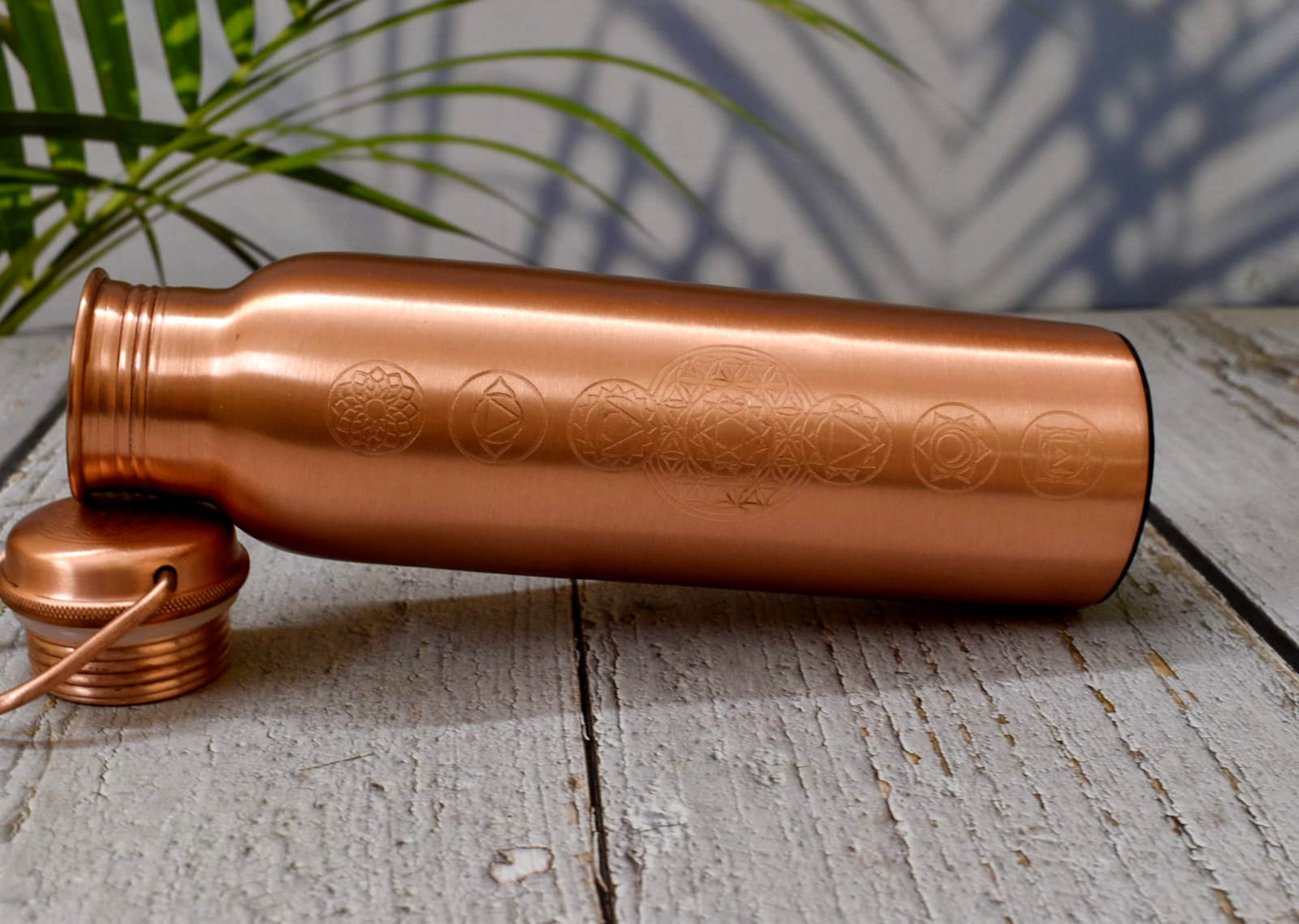 Introducing India House’s Pure Copper Water Bottles featuring engraved chakra symbols and a seamless leak-proof design. Experience the incredible purity of water with our amazing copper water bottle. Embrace the ancient practice of copper drinking to revitalize your body. Whether you’re at the office, school, gym, or on a camping adventure, our copper bottle ensures your water stays fresh and maintains its original taste, while also being at the perfect temperature for your enjoyment. Support a healthy lifestyle by drinking from your copper bottle throughout the day. Say no to plastic bottles that harm your health and the planet, and choose the benefits of copper for yourself and the environment. Our bottle showcases remarkable design after months of careful comparison and refinement. It passed stress tests to ensure its superior quality. The smaller lid prevents side leakage while drinking, yet it’s still large enough for easy cleaning. With a longer neck and more threads, our bottle guarantees leakage safety, while an O-ring provides additional protection against leaks. Handmade with exquisite craftsmanship, our bottle features a tarnish-resistant surface and is constructed from pure copper, known for its health benefit properties. With a large capacity of 1000ml, it provides ample hydration throughout the day. Experience the perfect Ayurvedic copper bottle and enjoy the benefits it brings to your well-being. Choose India House for a seamless, leak-proof, and chakra-engraved copper water bottle that combines style, functionality, and health benefits.