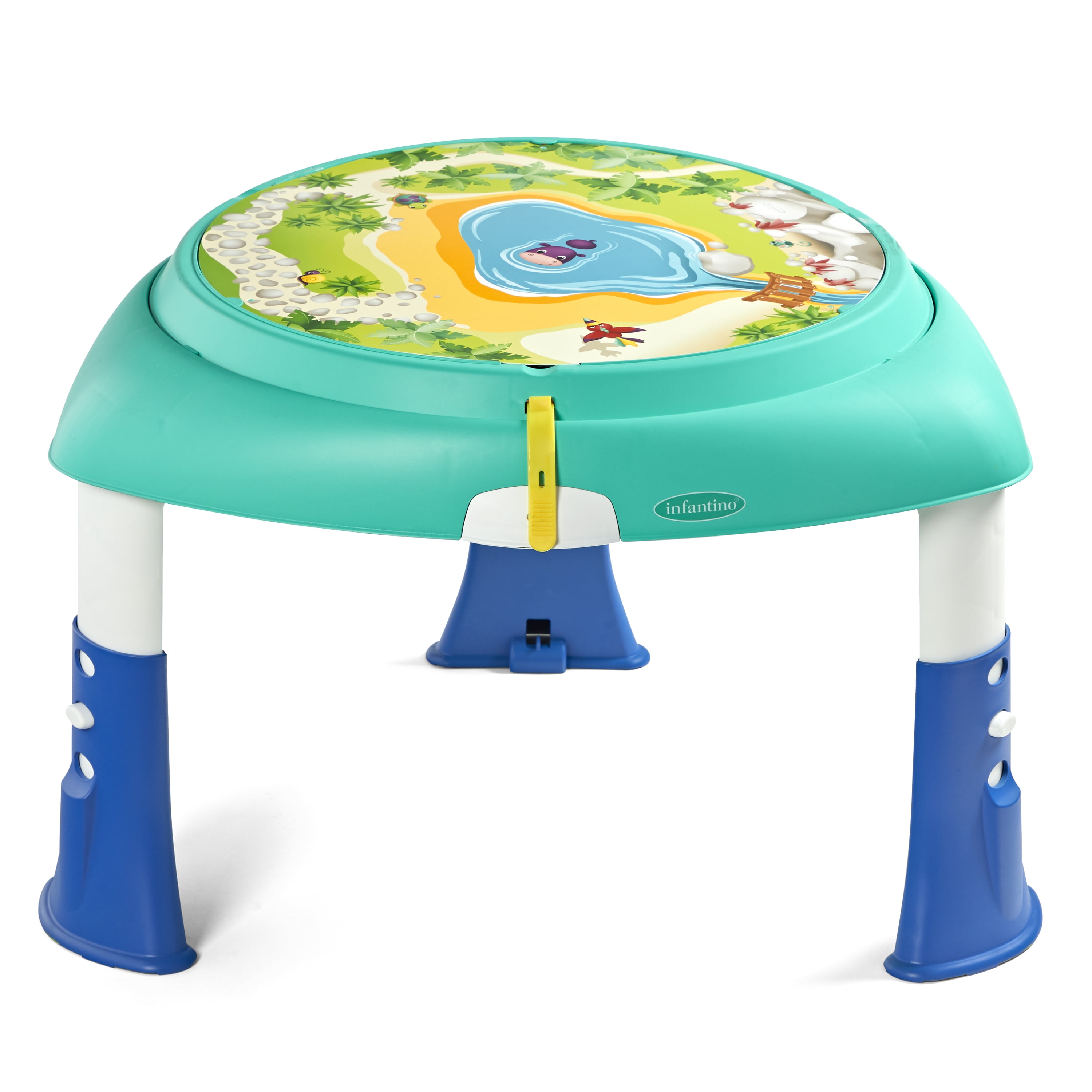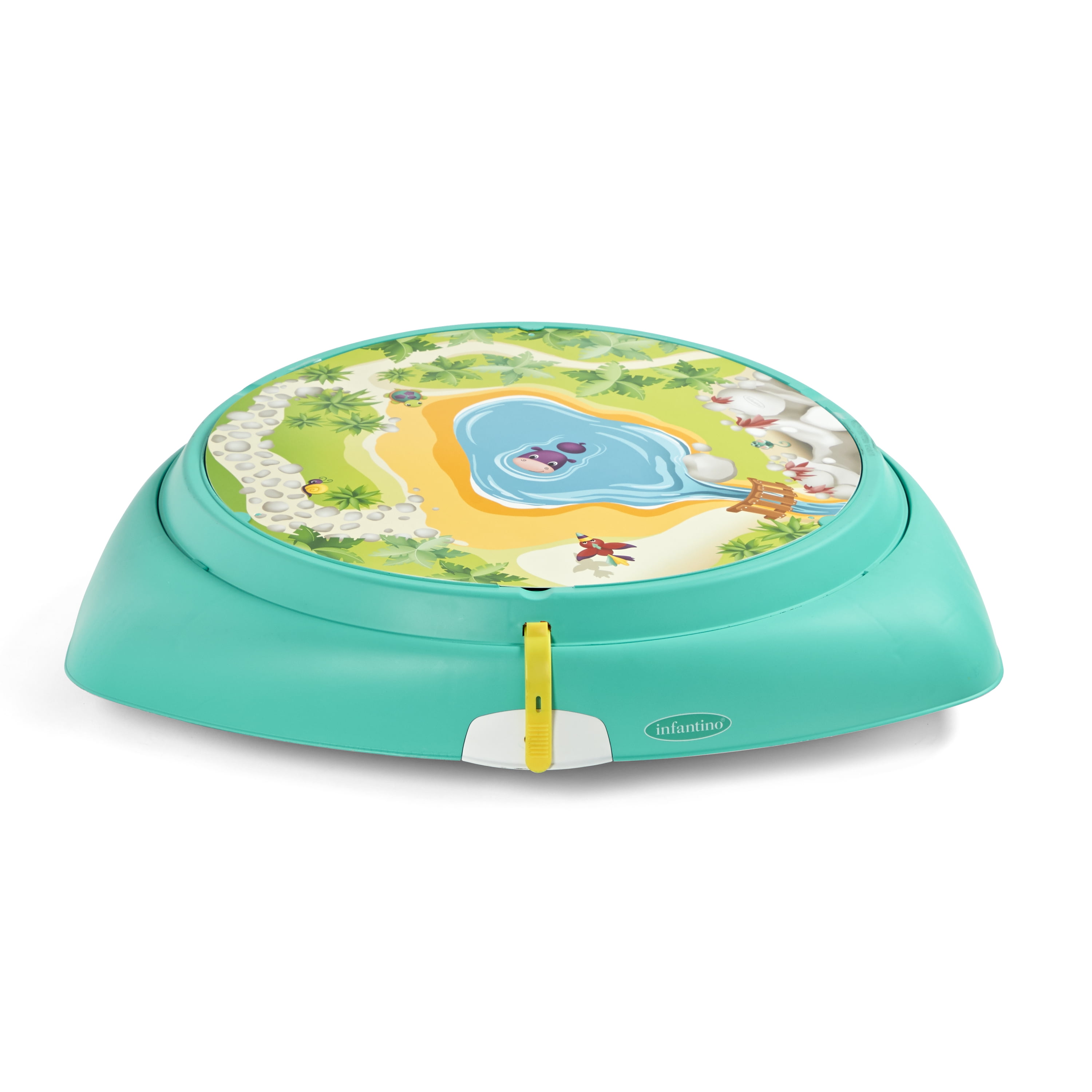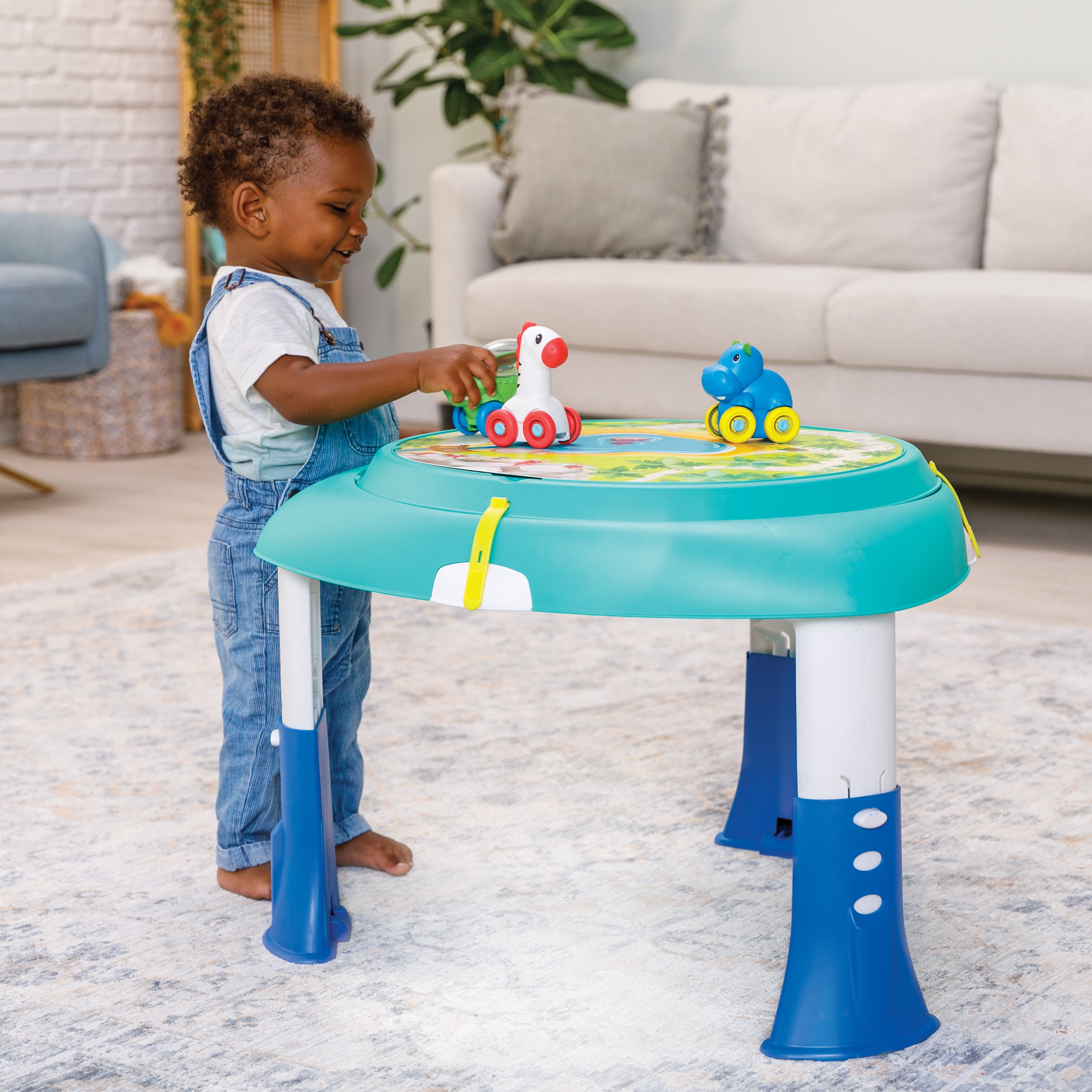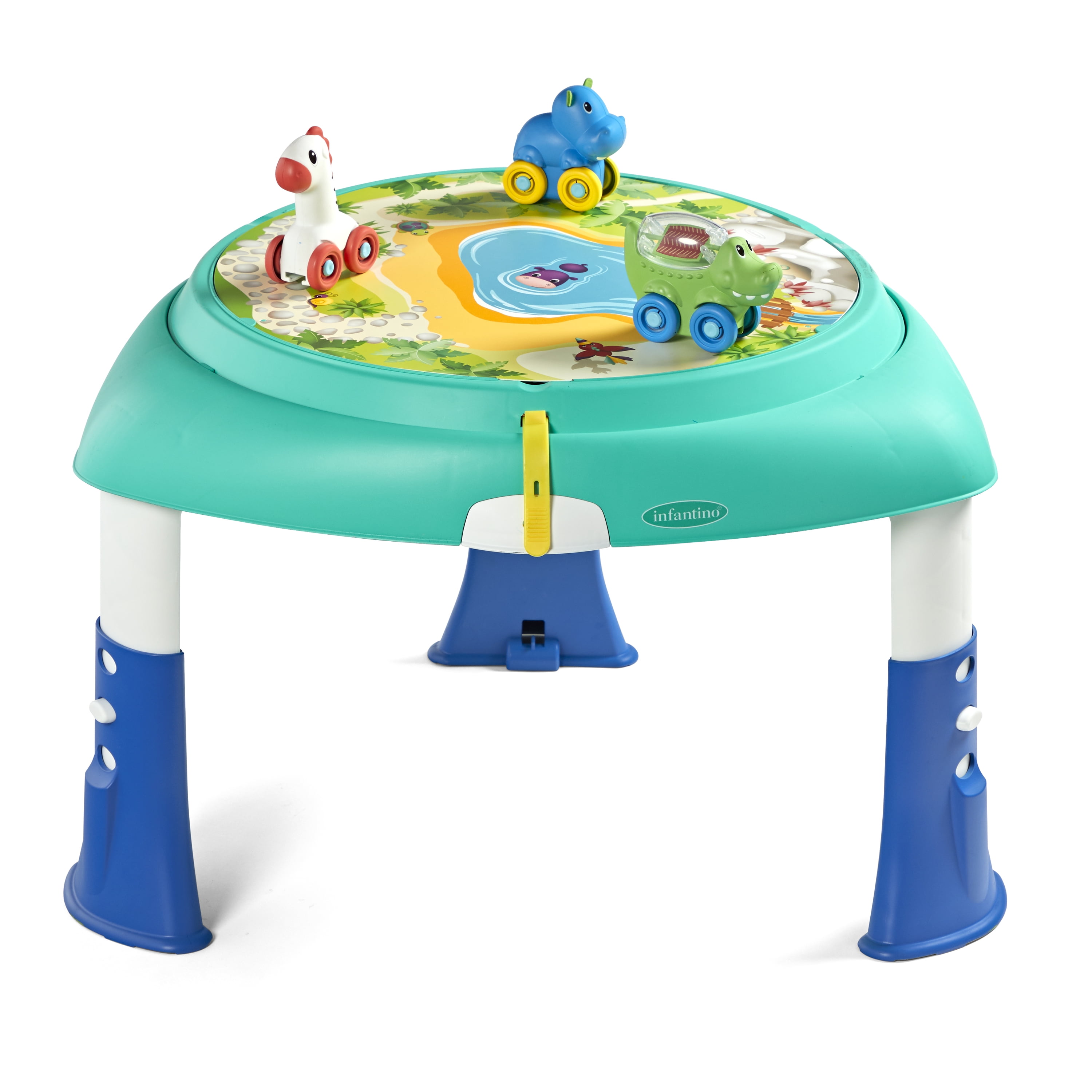 The Infantino 2-in-1 Sit, Spin & Stand Entertainer & Activity Table keeps little ones busy from tiny to toddler. Little ones can spin 360 degrees while exploring 6 engaging interactive toys including light up buttons that activate music and sound effects, with a unisex design. Features three height settings for growing tots. Once little one is walking, transform the entertainer into a stand-and-play activity table with three rolling animal pals. When playtime is done, the toys fold in and the legs fold under the table in seconds. Easy to store, take to grandma’s house, or simply move from room to room. Measures 27.95 in x 26.77 in.