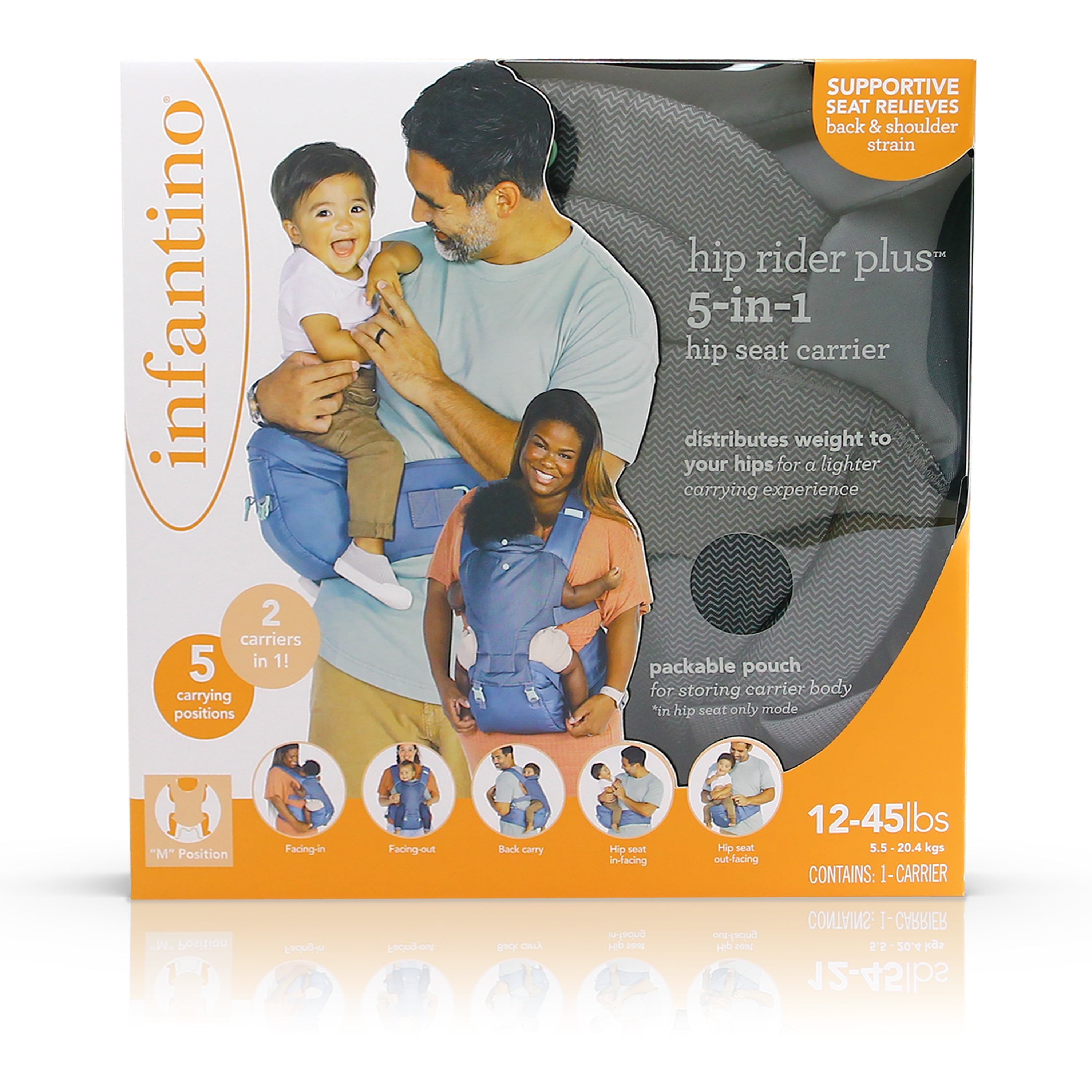 Allows you to carry your baby five ways as they grow from infant to toddler Carry babies between 12-45 lb Full structured carrier for younger infants and hip seat for toddlers Two carriers in one with our easy on/ off zip and buckle system Extra padded hip seat for both baby and parents’ comfort Padded straps and supportive lumbar waist belt for weight distribution and pressure relief Packable pouch for transitioning from carrier to hip seat or compact portability Convenient, easy-to-access side essentials pocket on the lumbar belt Baby-friendly machine-washable fabrics At Infantino, we believe every baby deserves access to quality products, this is why we design our products to be unisex so all little ones can enjoy them