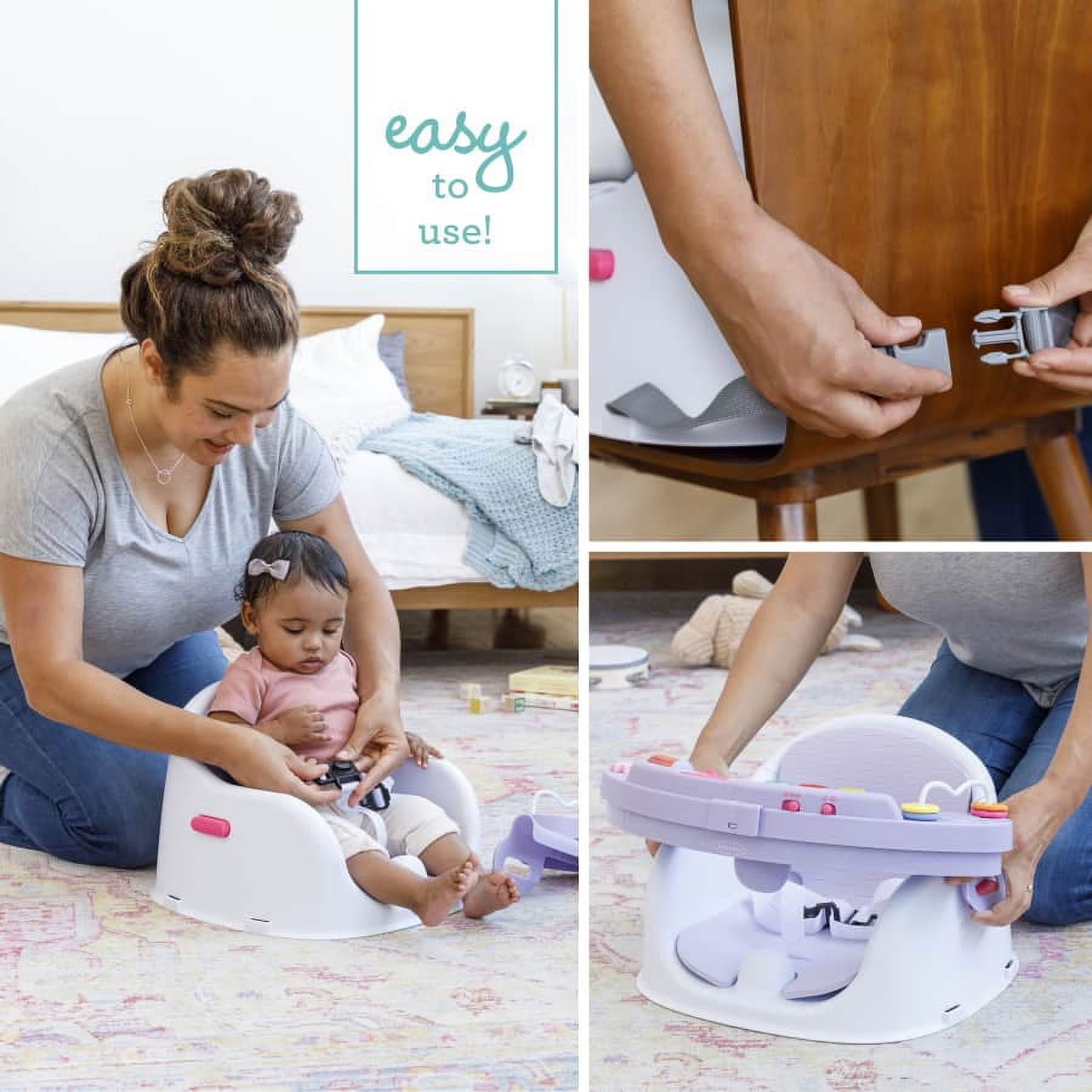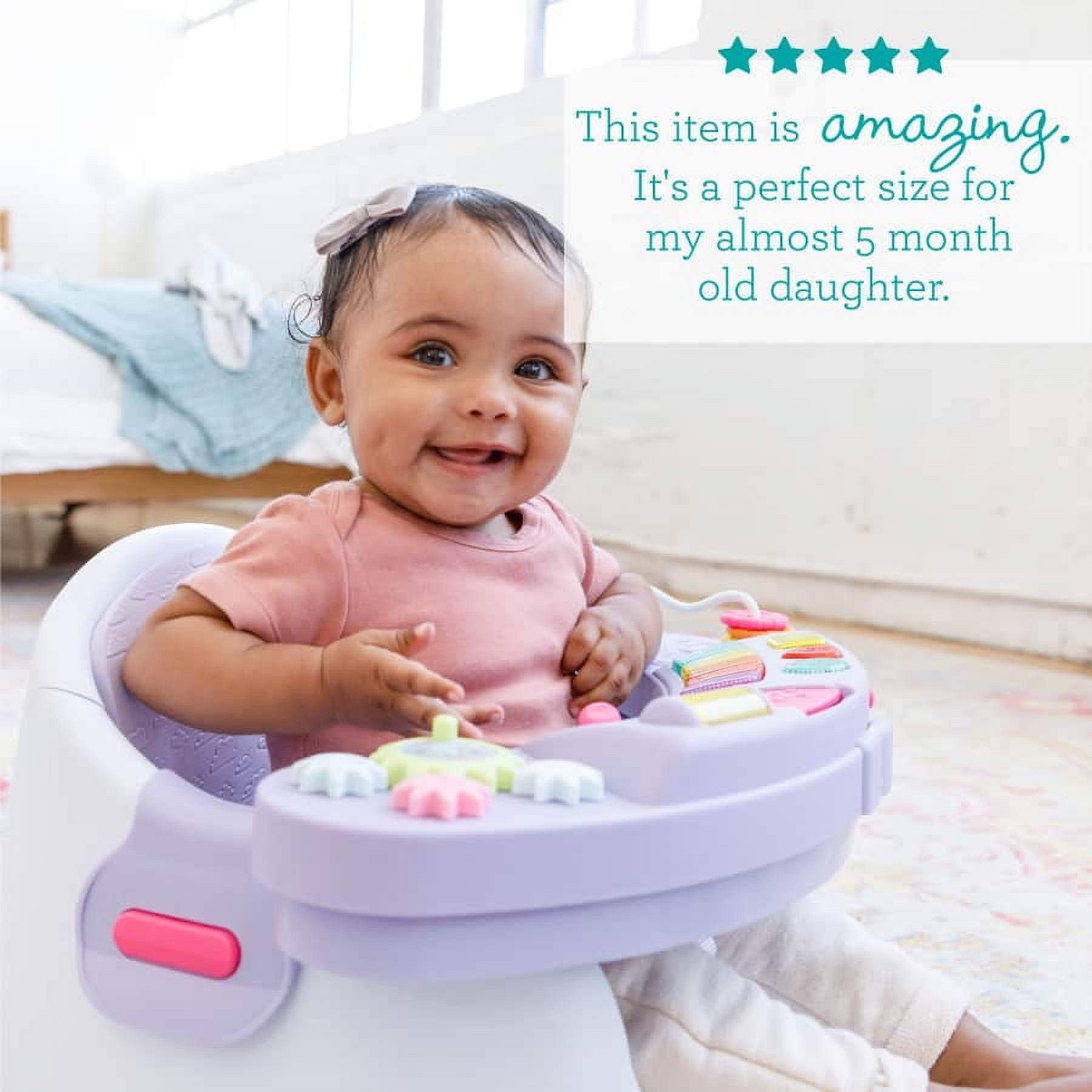 3-in-1: Interactive play space, snack seat, and table booster Light up piano plays 20 songs and sounds 6 engaging activities support sensory and fine motor skill development Toy pods slide apart to reveal snack tray with cup holder Wipeable seat cushion for easy clean up Ages: 4 months to 4 years (up to 33 lbs) At Infantino, we believe every baby deserves access to quality products, this is why we design our products to be unisex so all little ones can enjoy them