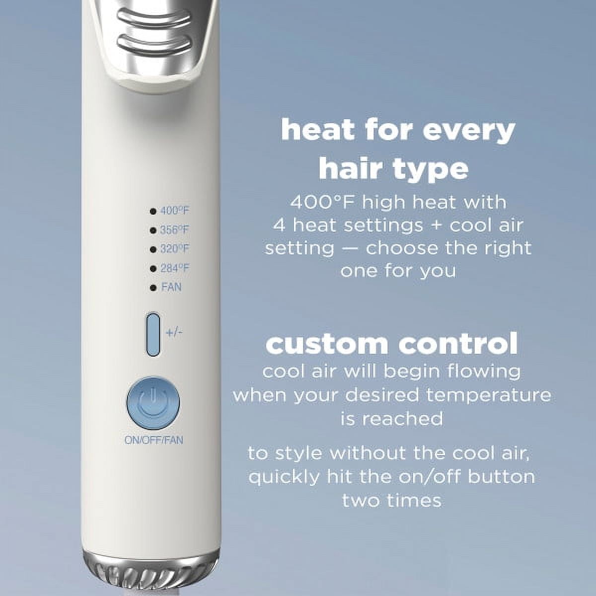 More versatility. Less damage. Long-lasting results. Get it all with the InfinitiPRO by Conair Cool Air Curler Luxe. Create the looks you love, from silky straight and smooth to luxurious curls and waves, with this easy-to-use tool. A unique cool air system flows cool air up through the vented titanium barrel for salon-caliber looks that last. The system instantly cools hair to set your style and protect against heat damage. Ceramic-coated floating plates provide an effortless glide that’s perfect for straightening and smoothing. They’re also ideal for preheating hair before wrapping around the barrel for flawless curls and waves. Customize the heat to match your hair type with 4 heat settings up to 400°F. Use with or without the cool air and get your look, your way. Fast heat-up ensures this versatile tool is ready to use in 30 seconds, so there’s less waiting and more styling.