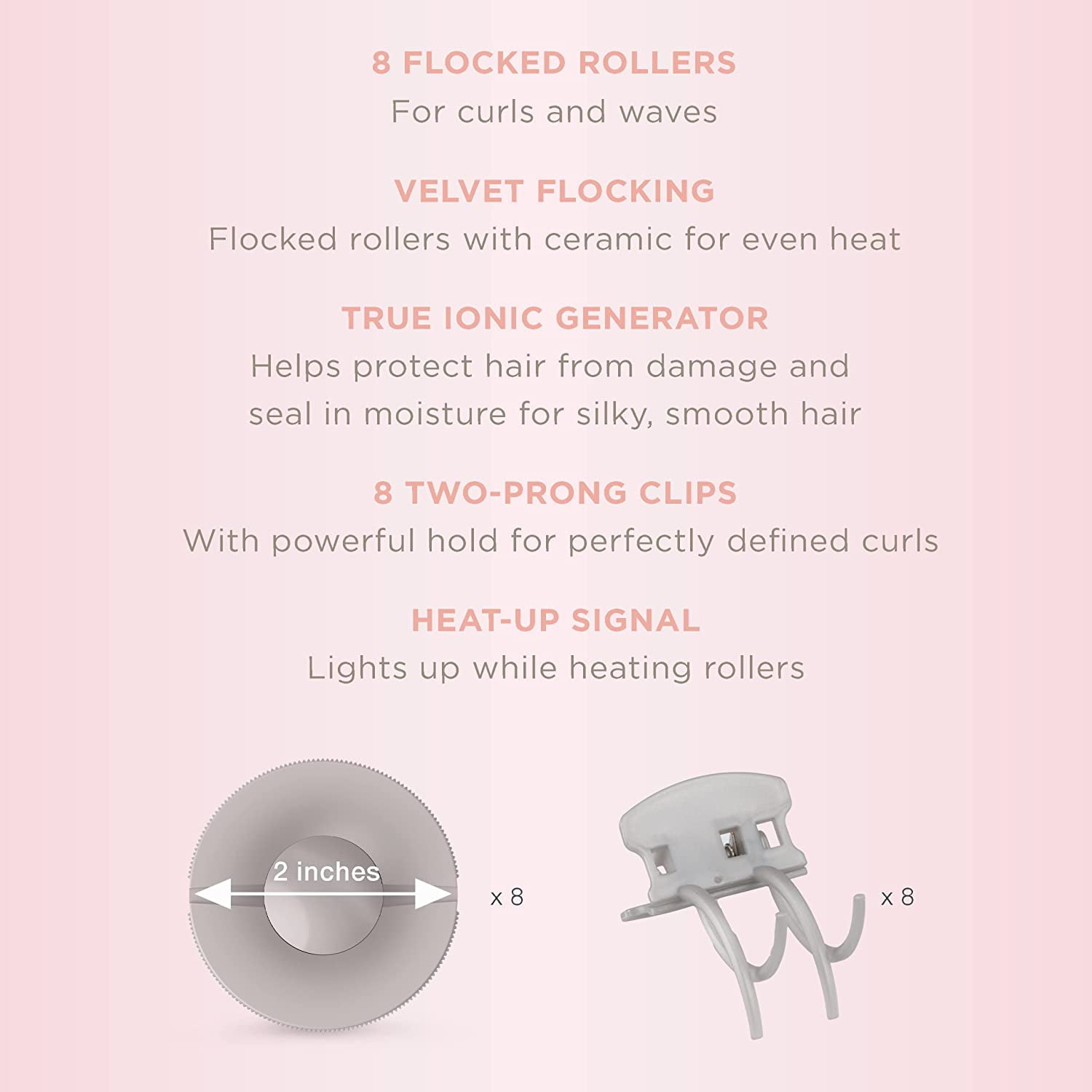 Ceramic Hot Rollers For Voluminous Curls: These 8 rollers use Ceramic technology to provide an even heat transfer for long lasting curls; They heat up quickly and evenly in 85 seconds; Velvety covering on the rollers helps protect hair from heat damage. Easy To Use: When the ready dot illuminates, use 1 inch of hair in each roller and secure with a 2-prong clip. Leave rollers in for 20 minutes for bounce & volume or 10 minutes for looser waves. Clean the unit and the heating strips with a cloth when cool. Full Set: Includes 8 ceramic flocked rollers in 1 size for custom curls and waves. This set includes 8 2 inch jumbo rollers and 8 2-prong clips to hold your hair securely and keep the rollers in place. Has an iconic generator to protect hair from damage. Heat Wave: To ensure that your hot rollers heat up, place the hot roller container on a flat surface with the cover tightly closed to prevent heat from escaping. Wait 85 seconds for the hot rollers to get up to a temperature between 140F-230F before using. Conair Hair Care: Since 1959, we have made innovative small appliances, hair styling tools, and more; Our hair care line includes high quality hair dryers, brushes, styling tools, and hair accessories.