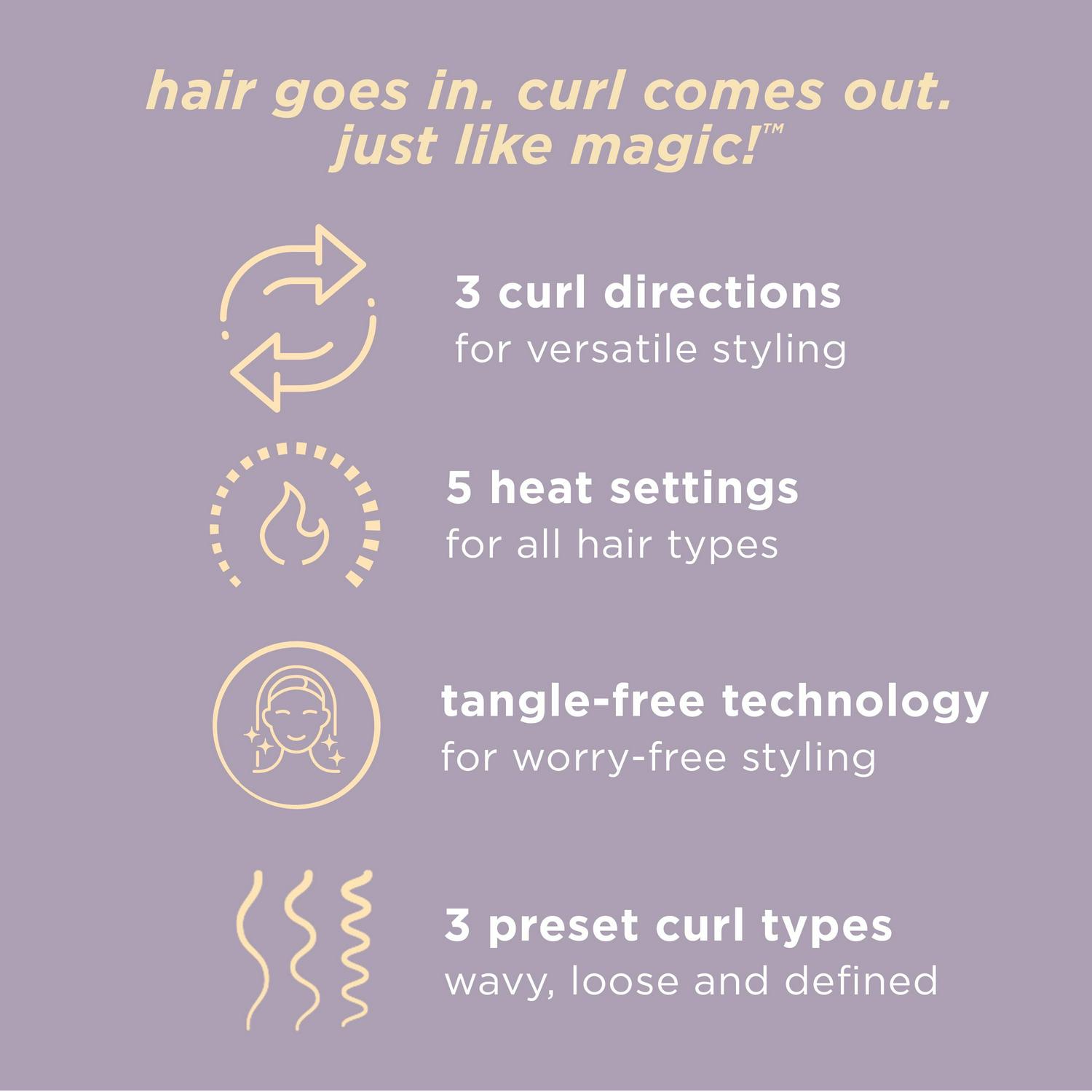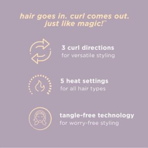 – Hair Goes In, Curl Comes Out, Just Like Magic: A revolutionary way to create beautiful curls. Automatic curling iron with tangle-free technology draws hair safely into the curl chamber where it is gently held, timed, and heated to create the perfect curl.