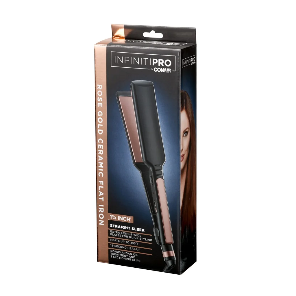 InfinitiPRO by Conair Rose Gold Titanium Ceramic Flat Iron, 1.75″, Product Features: Rose Gold Ceramic Flat Iron: With 30 heat settings, extra long, extra wide plates, and advanced ceramic technology that evenly heats up to 455°F without hot spots, this flat iron is perfect for all hair types Less Frizz, More Shine: Use this ceramic flat iron to straighten or flip hair. Features 15-second heat up and a true ceramic heater that ensures high, even heat for long-lasting style Wavy or Sleek: Whether you want to add volume and flip or create pin-straight styles, Conair’s full line of ceramic, double ceramic, tourmaline ceramic, and titanium flat irons have you covered Innovative Styling Tools: From curling irons & wands to flat irons, hot air brushes, auto-curlers & more – Conair makes high-quality styling tools for all hair types Conair Hair Care: Since 1959, we have made innovative small appliances, hair styling tools, and more. Our haircare line includes high-quality hair dryers, brushes, styling tools, and hair accessories