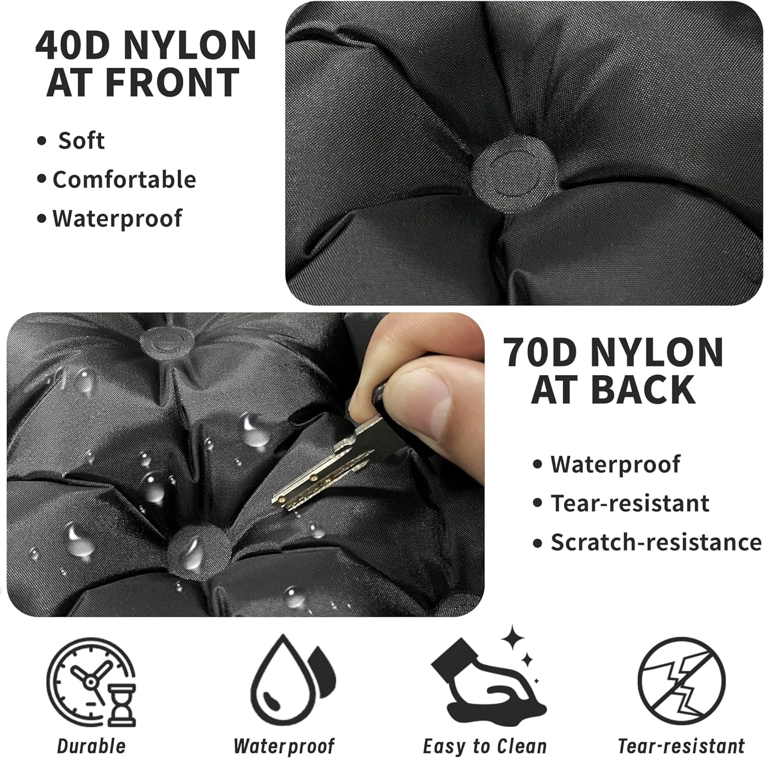 ULTRA LIGHT & PORTABLE – The lightweight cushion weighs only 75g/2.6oz, which is equivalent to the weight of an egg. With dimensions of 12×5.5cm/4.7×2.2in, the cushion fits easily in the palm of your hand and occupies only a small corner of your backpack, so you can’t feel its presence when not in use. ABRASION & TEAR RESISTANT – The surface layer of the durable seat pad is a high-density 30D checkered nylon TPU material, which is both soft and skin-friendly, and wear-resistant and tear-resistant. The inner layer has TPU film layer, airtight stronger not to leak, and waterproof and moisture-proof role. MULTI-POINT SUPPORT DESIGN – The interior of the Mat uses an electric welding pattern to create a high plane matrix between the interconnected airbags to form multiple air support lattices with multiple points of support to evenly disperse pressure, combined with a thickness of 5 cm/2 inches, it has a greater weight-bearing capacity and is more comfortable to use. FAST INFLATION & DEFLATION – Configured with 2.5cm adjustable inflation valve port, press the button can be one-way air intake, the inflatable process will not leak, can easily and quickly blow with the mouth to complete the inflatable. Press the button again, that is, continuous air out, fast discharge of air.