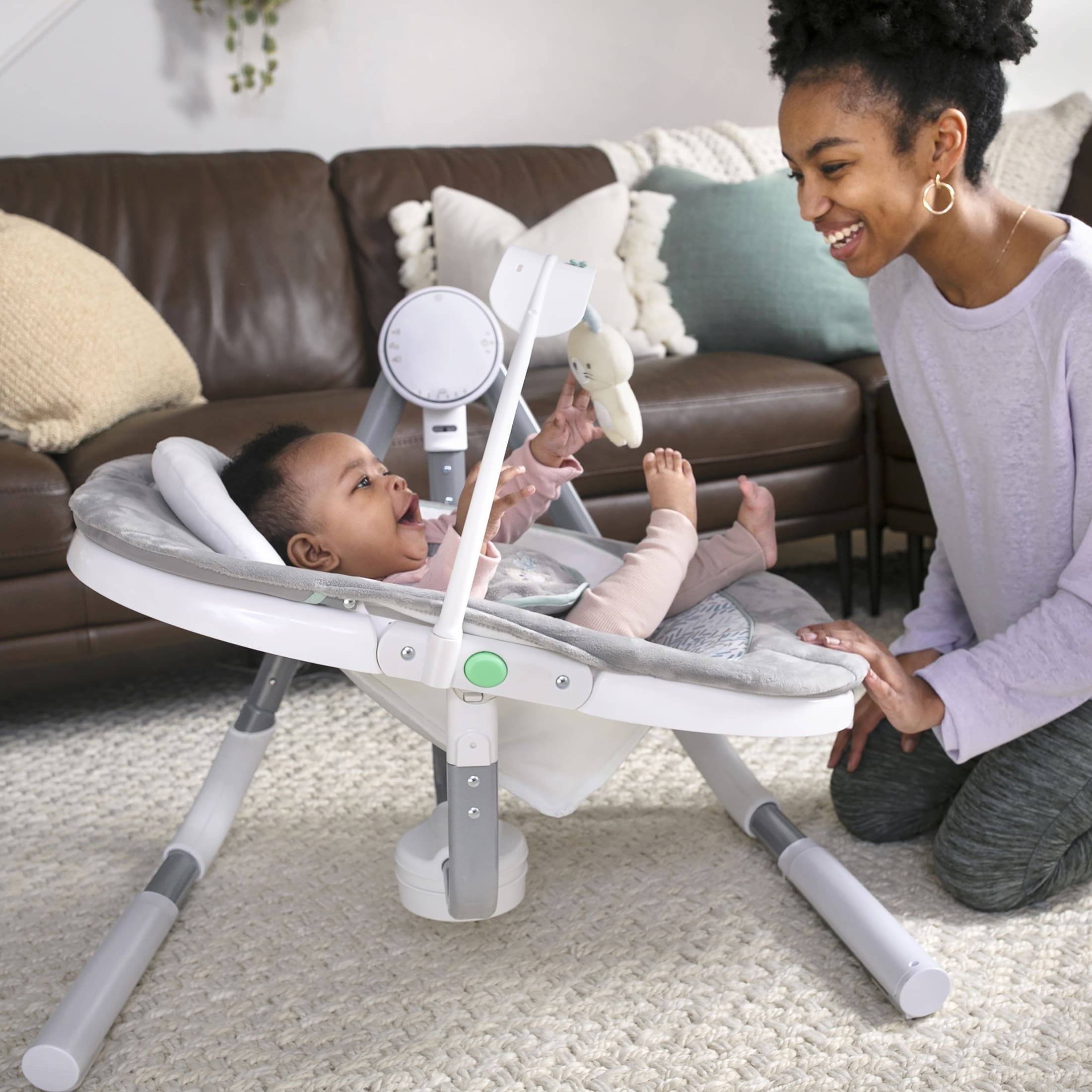 Ingenuity Anyway Sway Vibrating Portable Baby Swing, Blue, The Ingenuity AnyWay Sway Portable Swing gives your little one a cozy place to sit, snuggle, and sway. This fully-loaded electric baby swing rotates 180 and swings in 3 directions, helping the baby stay soothed while in sight. Pick between 2 modes with soothing vibrations: calming swing or a stationary seat with 2 reclining positions. A pivoting toy bar with a bunny plush toy helps capture the baby’s attention. A removable headrest supports newborns, and the quiet swing motor helps the baby stay undisturbed.