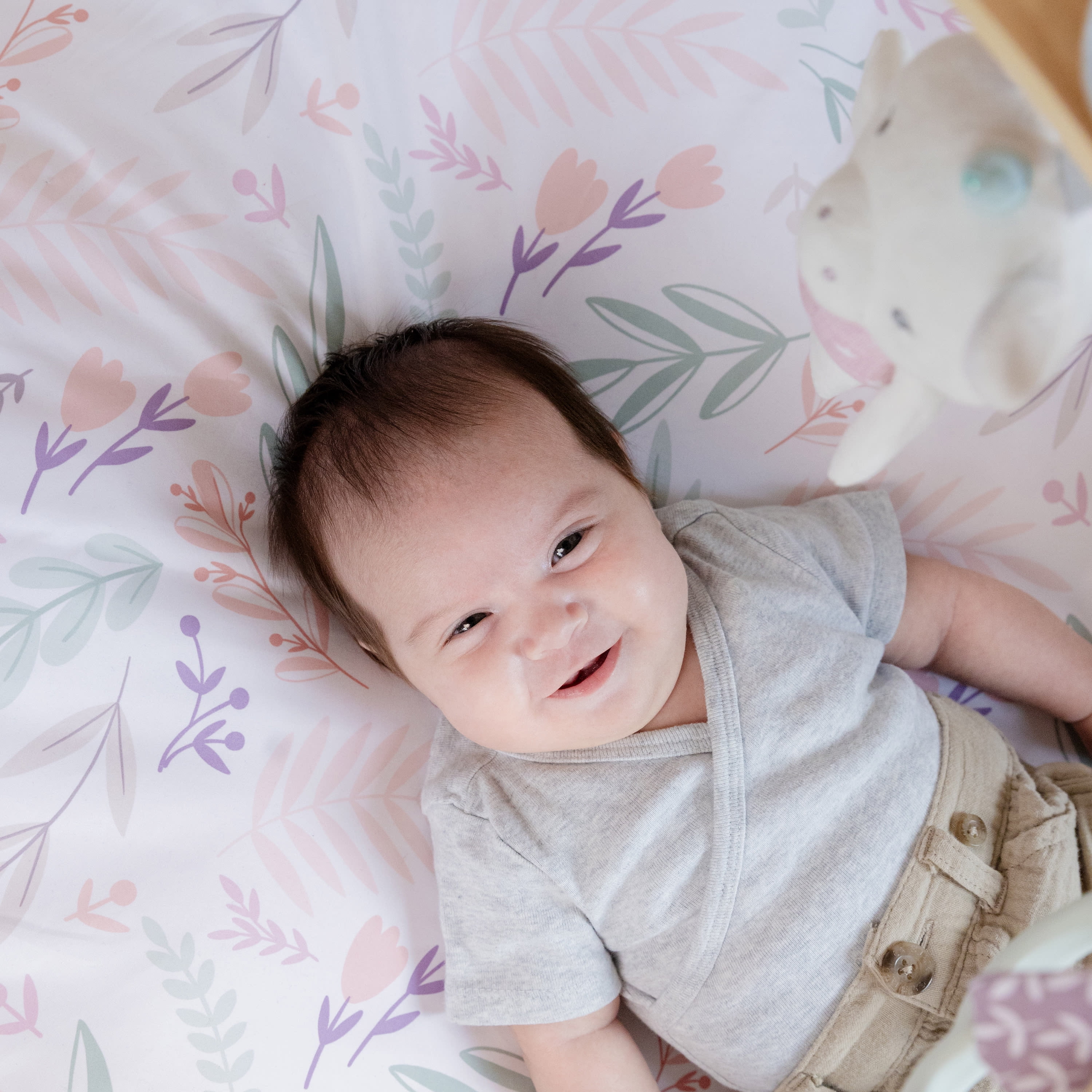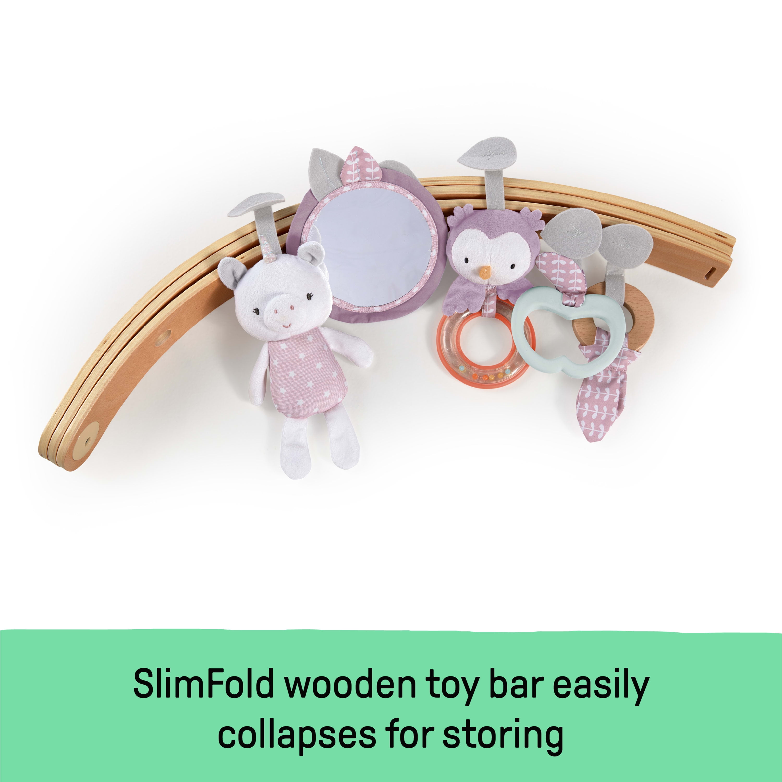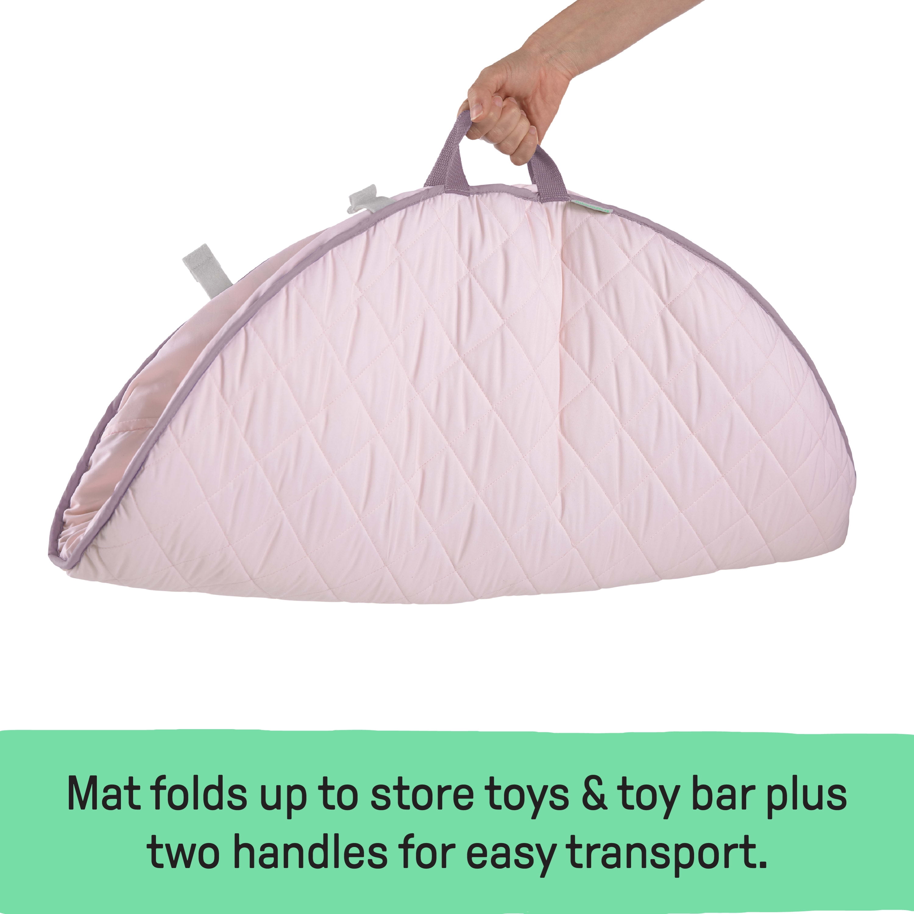 Reversible duvet play mat is machine washable Ultra-plush mat creates a comfy and safe play space for baby SlimFold wooden toy bars and removable activity toys collapse for self-storage Beautiful gender-neutral design, including toys and tummy time pillow Folds in two with handles for easy transport