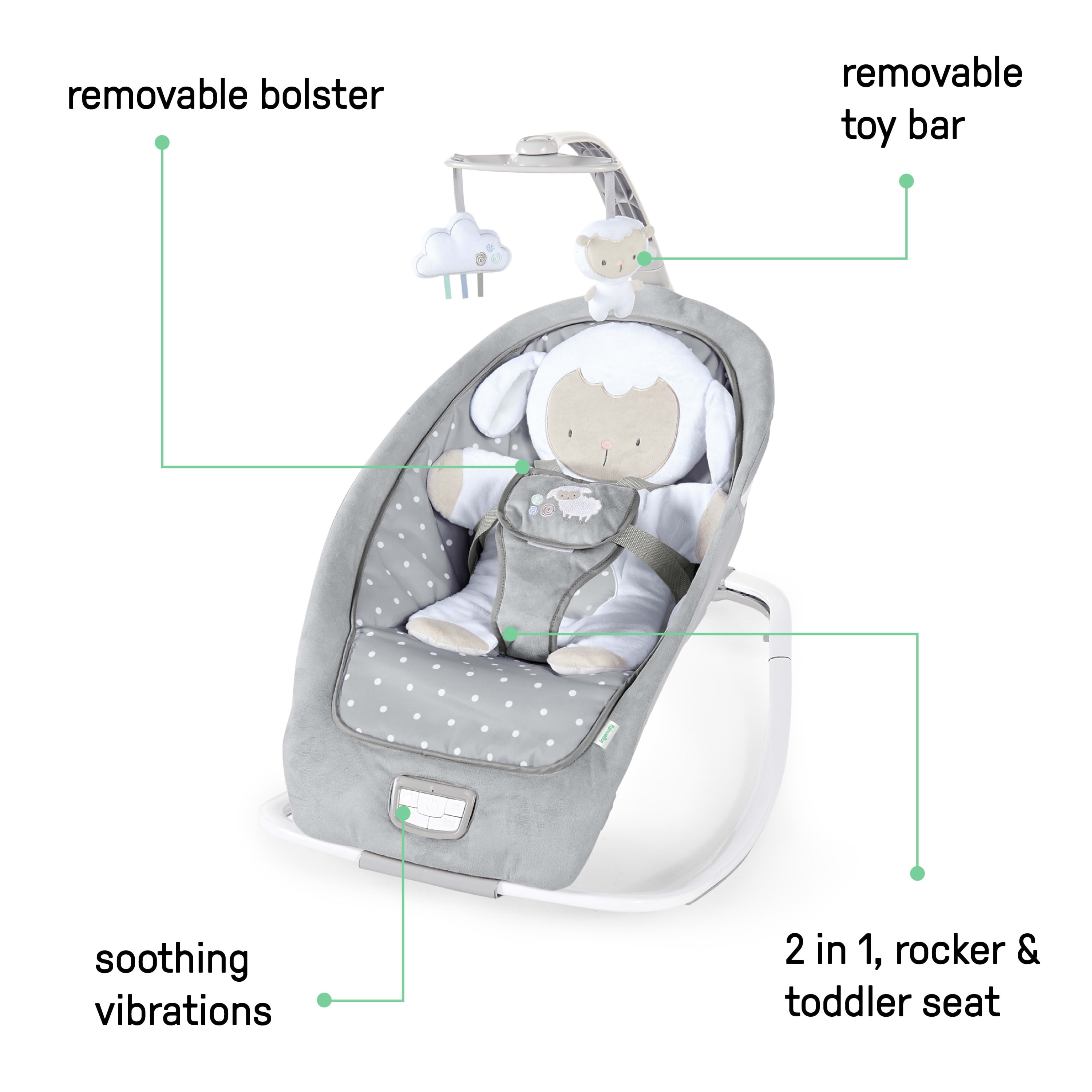 When you need an extra set of hands, the Ingenuity Cuddle Lamb Rocking Seat gives your little one a secure, soothing place to rock or cuddle up. With a lightweight design, you can move this seat from room to room as you cross off to-dos. Use as a rocker to soothe baby or securely lock into a stationary seat. This snuggly seat has 2 modes and grows with baby from a newborn rocker to a toddler seat so your little one can enjoy for up to 30 months. A 5-point harness helps keep baby snug and secure. 2 plush toys on the overhead toy bar help to entertain, and 3 recline positions help keep baby comfy. The neutral, modern design makes this a perfect gift for holidays and baby showers, and it will fit right in with your home decor. For messes, simply toss the removable seat pad and lamb bolster into the wash. The foldable design allows you to take baby’s favorite seat on the go or store away when not in use.