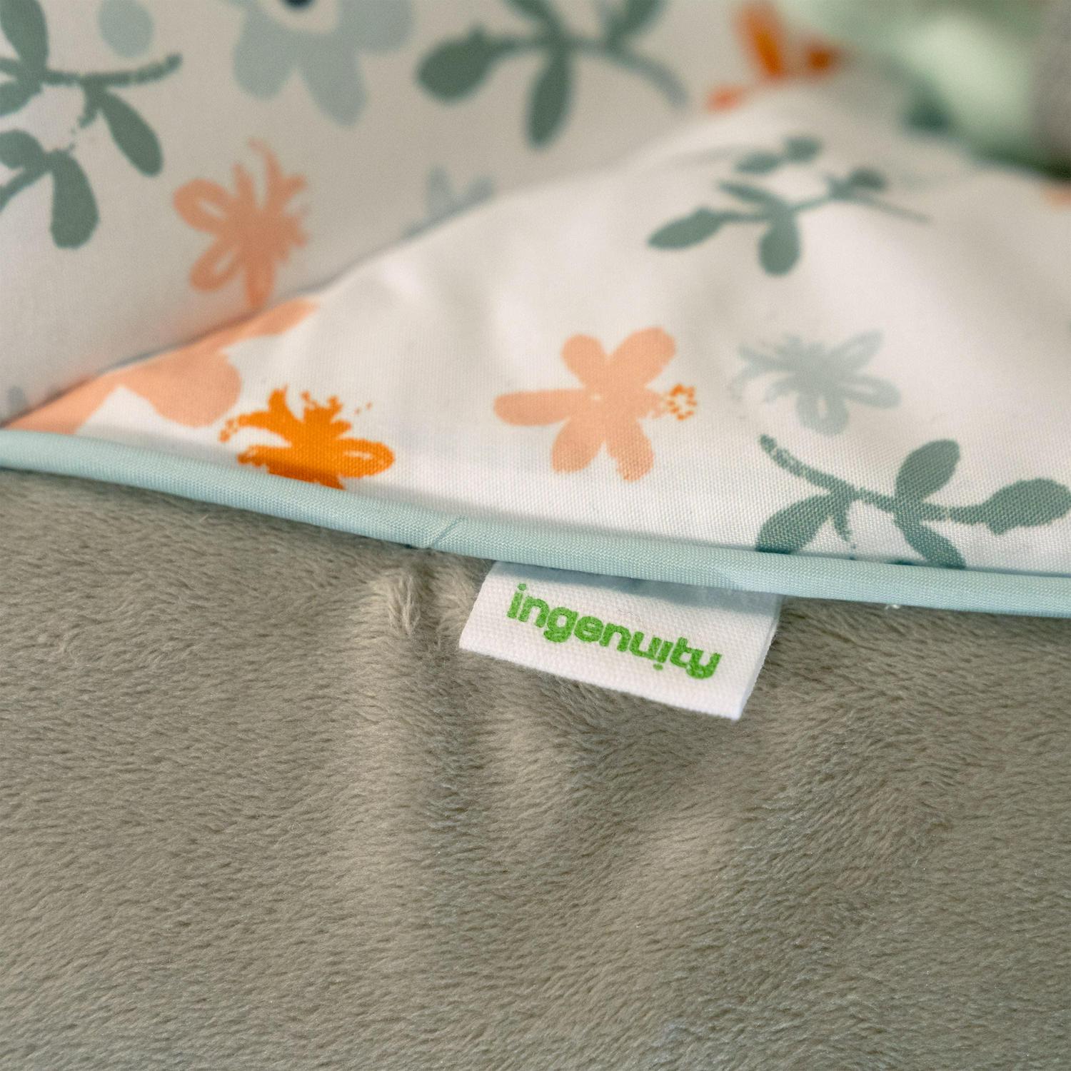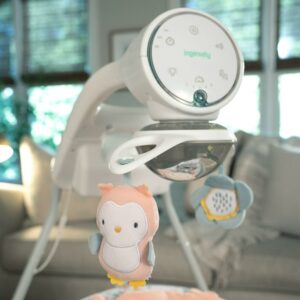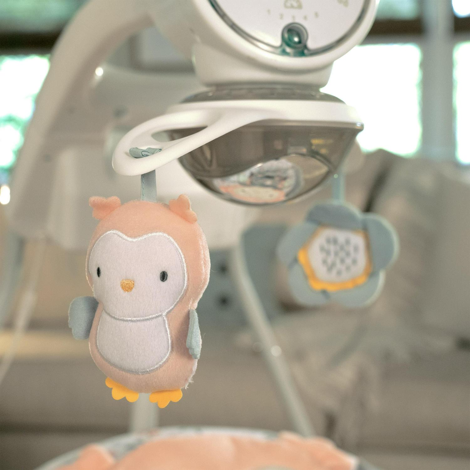 Help baby relax or engage in fun playtime with the Ingenuity InLighten Soothing Swing – Nally. This motorized swing for baby features a seat that rotates 180 degrees and swings in 3 different directions. Soothe your newborn with a choice of comforting melodies, white noise, or nature sounds. With 2 recline positions, delicate details, and cozy fabrics, baby will swing and sway into comfort. The narrow frame offers easy movability around the home with incorporated handle and wheels. The electronic mobile features 2 plush toys an owl and flower and a dazzling light show. The adorable owl-shaped insert offers extra comfort for baby. The USB cord included powers the baby swing motion (which has 5 speeds and 3 timer options), music, and lights. Wall adaptor not included. Easily wipes clean. This parenting essential makes for a great baby shower gift!