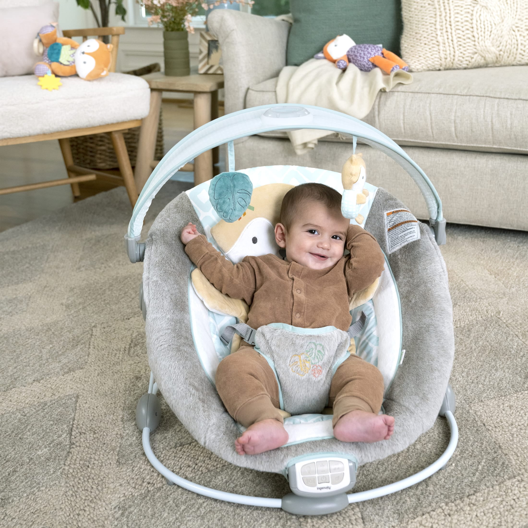 The Ingenuity InLighten Bouncer – Kitt is a second set of hands for busy parents with baby in view. For newborns to age 6 months, or up to 20 lbs, whichever comes first Use the cozy fox (Kitt) bolster to give newborns extra support & comfort; The soft removable bolster can be used for tummy time; Offers full body recline to keep baby comfy Includes twinkling light-up toy bar for soothing and engaging; and 2 entertaining plush toys (a fox and leaf) for baby to practice reaching and grasping Stimulate baby’s senses with soothing, gentle vibrations, calming melodies, nature sounds, and white noise; Powered by 3 size C batteries (not included) Safe & convenient design; includes 3-point harness to keep baby secure; Easy to clean seat pad and bolster; assembled dimensions 21.65″ (H) x 23.03″ (W) x 26.77″ (D)
