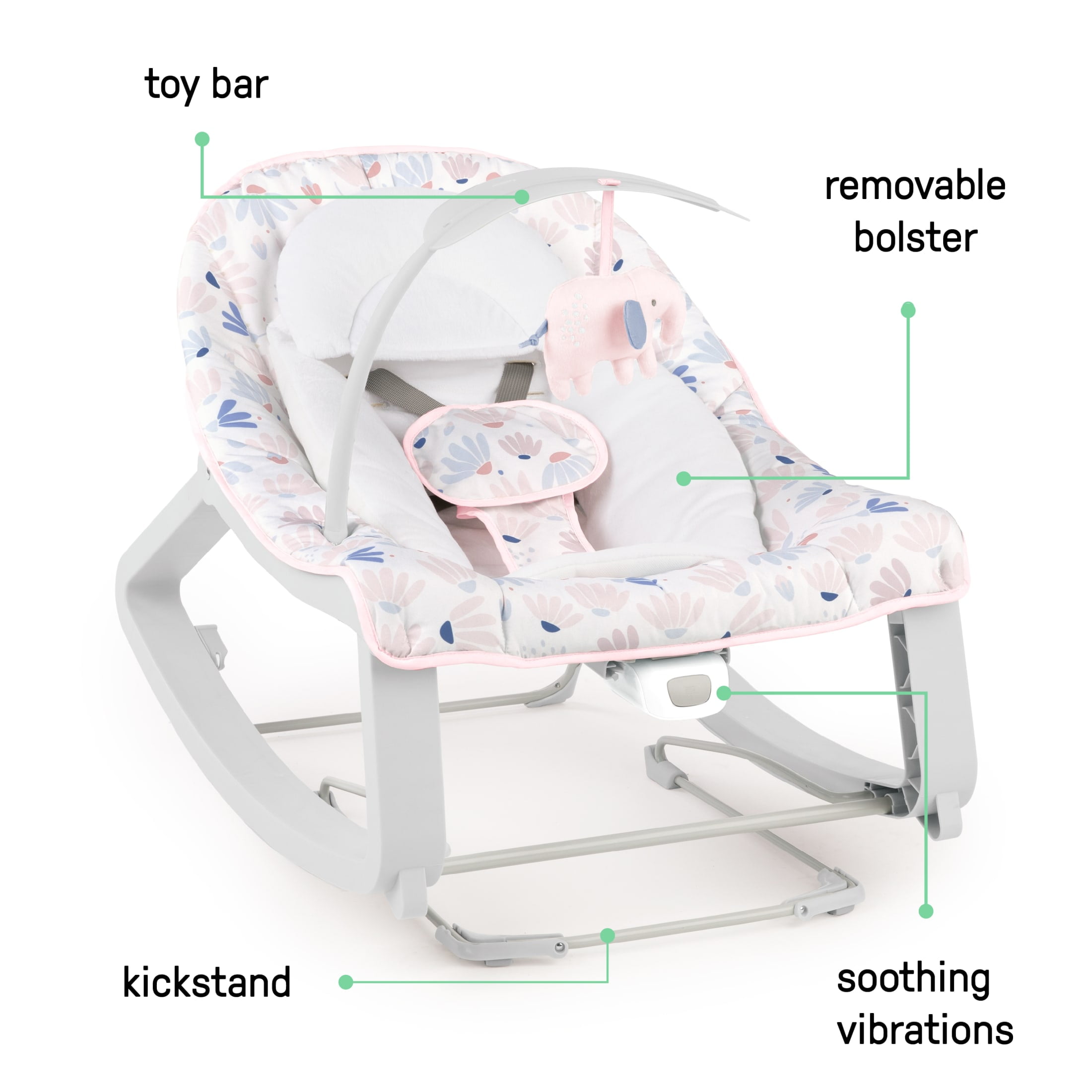 The Ingenuity Keep Cozy Baby Bouncer, Rocker & Toddler Seat has 3 modes for parent convenience and baby preference: bouncing, rocking, and stationary seat (kickstand at the rear of the chair) Neutral unisex design blends with your home décor; gives infants and toddlers up to 40 pounds a seat with the family; grow-with-me design ages up from 0-30 months Use the cozy infant bolster to give newborns extra support and comfort; easily remove the bolster when baby outgrows it; 2 reclining positions keep baby comfortable Soothing vibrations help to keep baby calm; includes 1 detachable plush elephant playtime toy for entertaining and to practice reaching and grasping; vibrations powered by 1 C battery (not included) Safe and convenient design; includes 5-point harness to keep baby secure; Machine washable seat pad and bolster for easy cleaning; assembled dimensions 24.41″ (H) x 19.49″ (W) x 26.38″ (D)