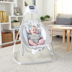 Ingenuity 2-in-1 Vibrating Lightweight Baby Swing, Gray, The Ingenuity Simple Comfort Compact Soothing Swing Rocker offers two parenting must-haves in one smart design. The baby swing’s plush seat is removable and converts into a rocker with a single easy motion. Both swing and rocker modes give your baby a secure and safe place to rest comfortably. In swing mode, switch between 6 speeds according to baby’s preferences, and choose from 3 different swinging directions. Help soothe the fuss away with vibrations, nature sounds, and gentle melodies.