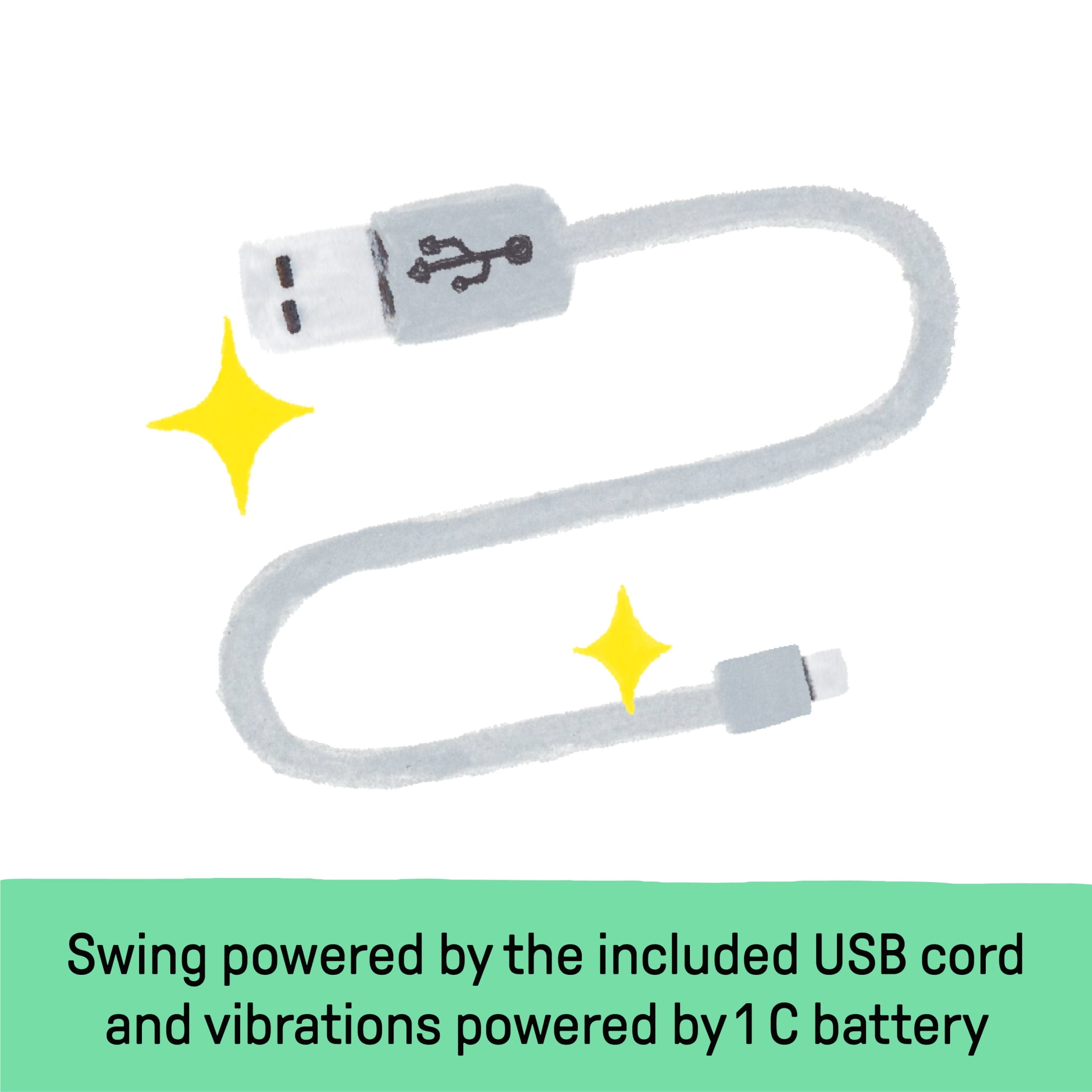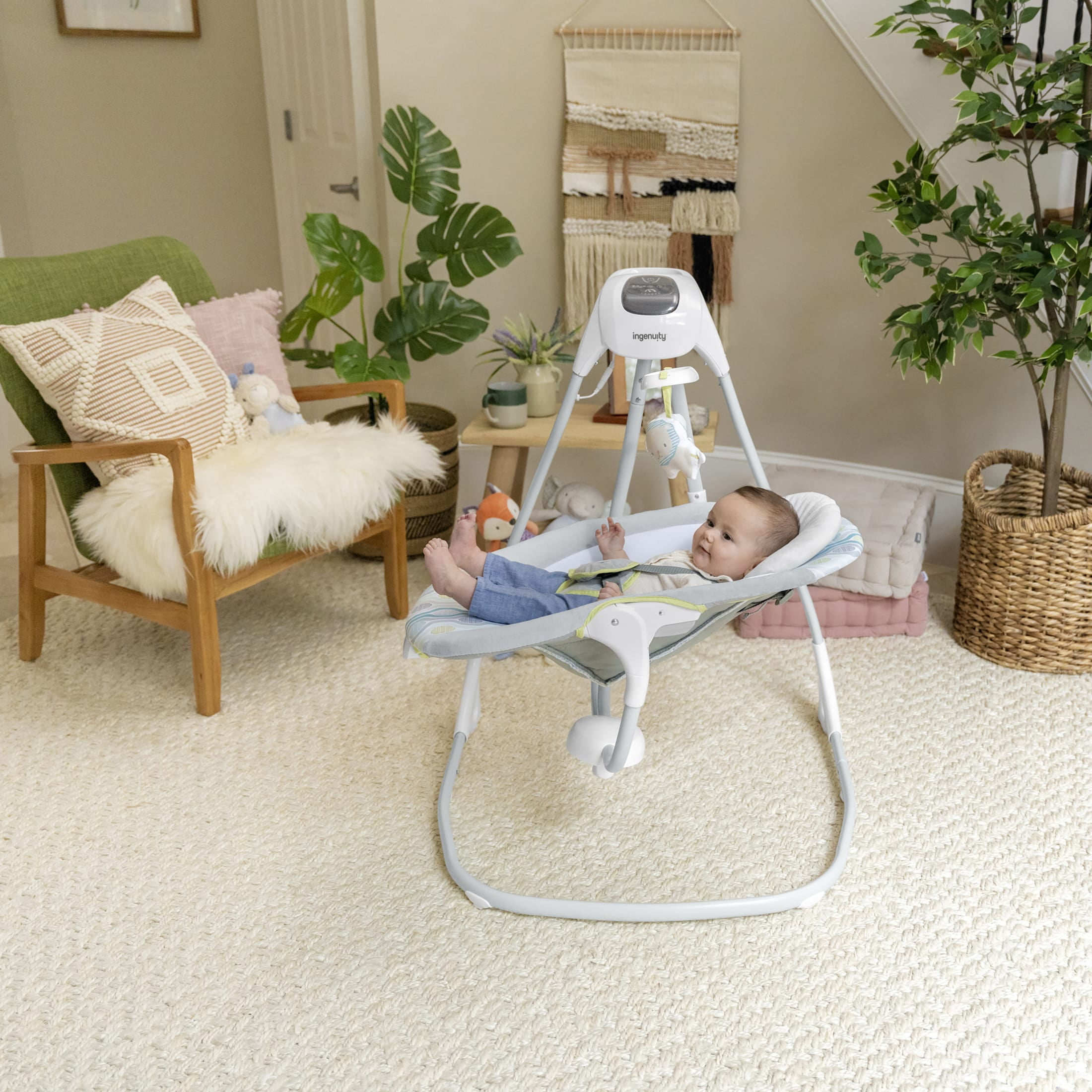 Ingenuity especially designed the SimpleComfort Compact Soothing Swing to make your day more simple and convenient, without breaking the bank! This innovative oversized seat with adjustable recline rotates 180 degrees to give you a better view of your little one, and baby can swing 3 different directions. The lightweight frame has wheels and an easy-to-pull handle which make it simple to move this full-size swing from room to room. A USB cord is included to save money on batteries (wall adapter NOT included). From the GentleTouch control panel, you can customize babys experience with soothing vibrations, 8 melodies, 3 nature sounds, and white noise. Alternately, WhisperQuiet technology allows baby to swing in silence. Get a few hands-free moments with a swing timer that can be set to 30, 45, or 60 minutes. TrueSpeed technology maintains 6 consistent speeds, even as baby grows. A mobile is adorned with 2 adorable plush characters to entertain baby while they are comfy in the soft fabrics. When things get a little messy, the seat pad is removable to toss in the washing machine. The cute gender neutral fashion will compliment the dcor of any home and is perfect for a girl or boy.
