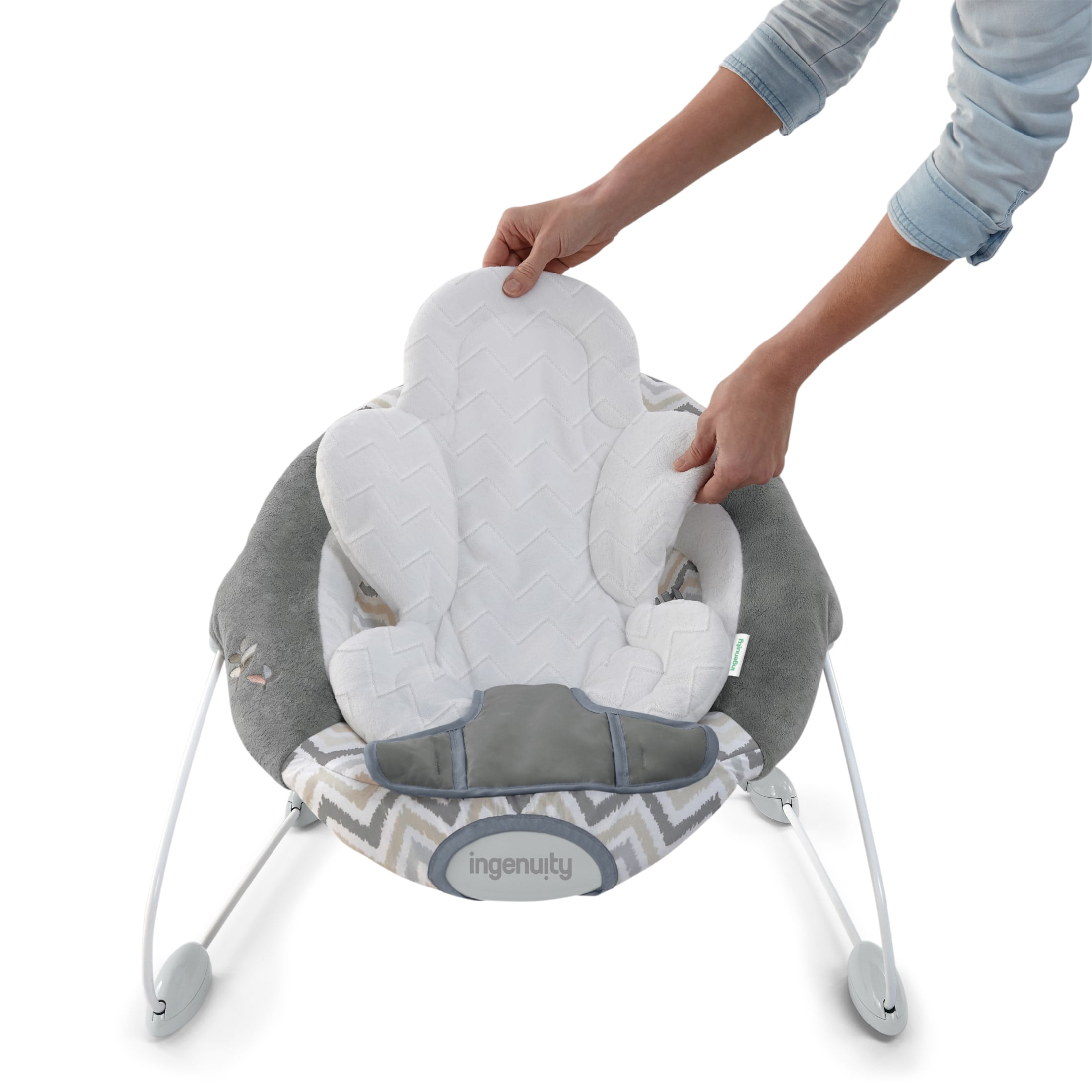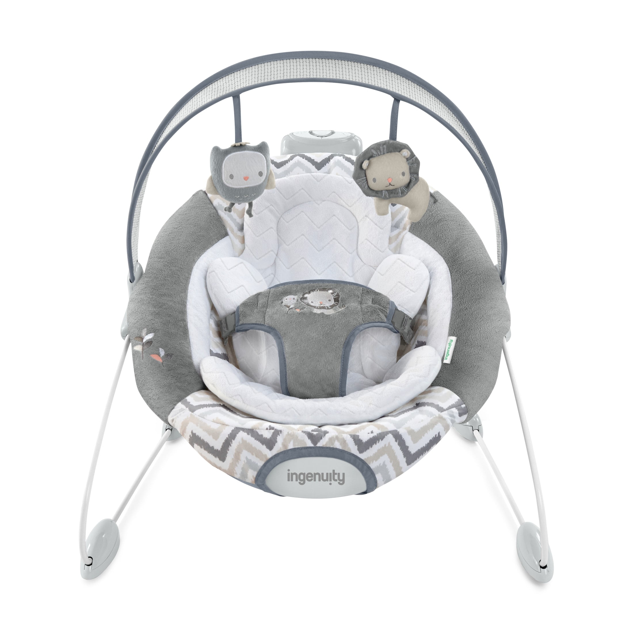 Secure ibaby seat made for multi-taskers Ingenuity unisex newborn bouncer has 2-speed auto bounce which mimics momÕs natural movements Neutral bouncer for baby boy or girl 3-point safety harness and machine-washable seat pad Batteries last up to twice as long as other bouncers