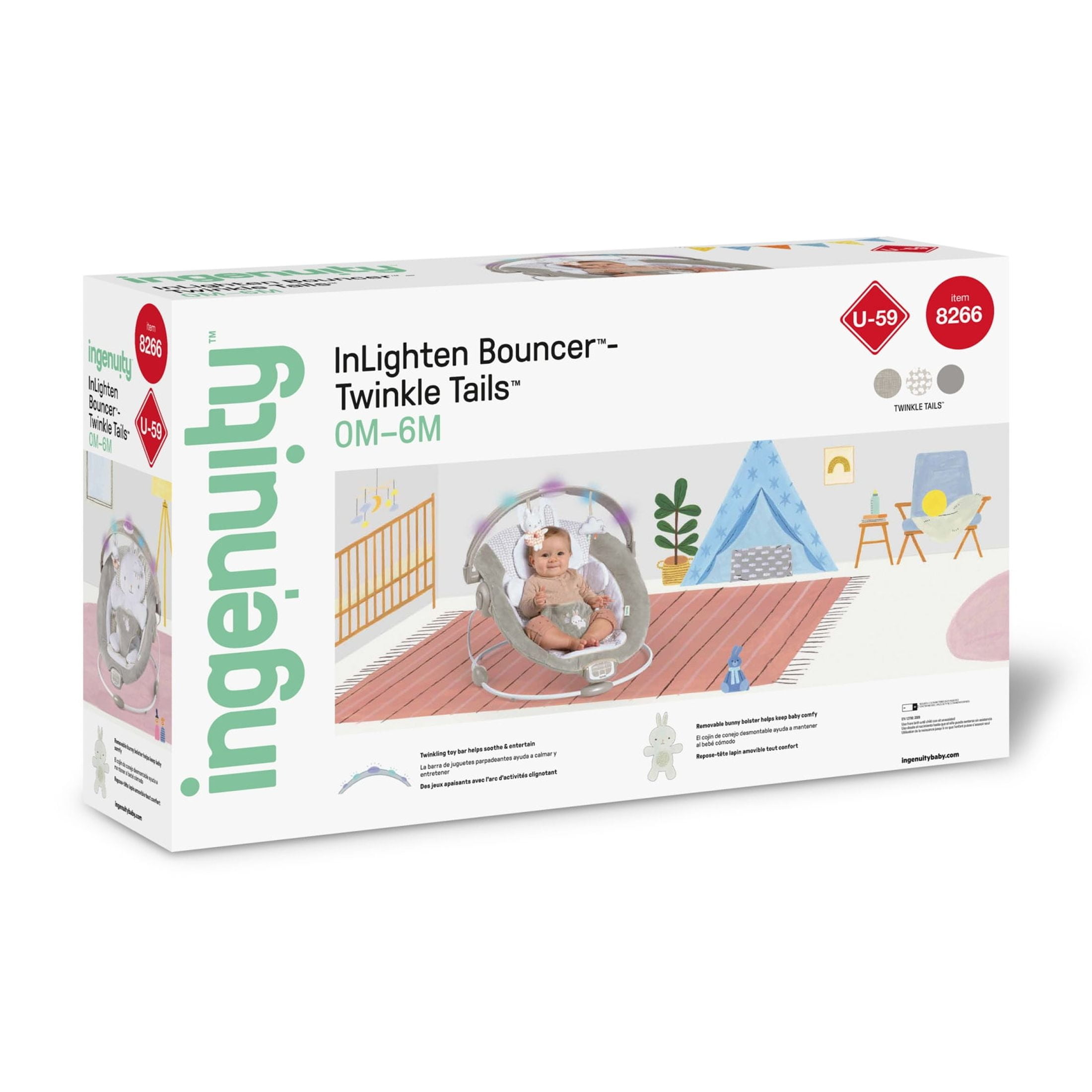 The InLighten by Ingenuity Twinkle Tails Bouncer is a second set of hands for busy parents, with plush fabrics to keep baby cozy calm. For newborns to 6 months or up to 20 lbs Use the cozy bunny bolster to give newborns extra support comfort. Remove bolster to use as a tummy-time mat Includes removable light-up overhead toy bar for engaging 2 hanging plush toys for practicing reaching grasping; Baby bouncer makes great gift for holidays baby showers Soothing vibrations, calming melodies, nature sounds white noise with volume control auto 30-minute shut-off. Powered by 3 size C batteries (not included) Safe convenient design includes 3-point harness to keep baby secure Machine washable seat pad bolster for easy cleaning